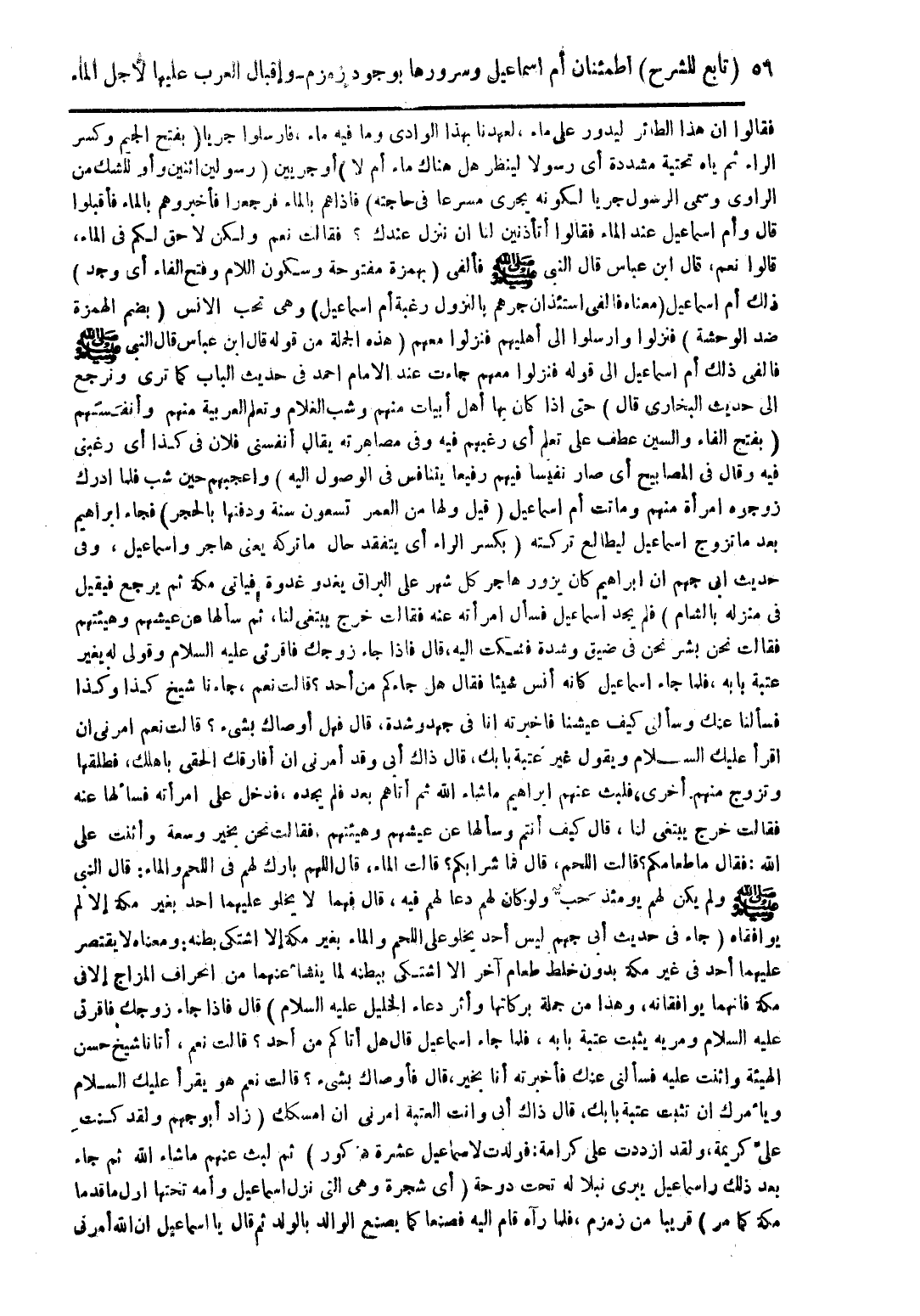 فقالوا إن هذا الطائر ليدور على ماء، لعهدنا بهذا الوادى وما فيه ماء، فارسلوا جربا (بفتح الجيم وكسر الراء ثم ياه تحتية مشددة أى رسولا لينظر هل هناك ماء أم لا) أو جريين (رسولين ثنين وأو للشك من الراوى وسمى الرسول جريا لكونه يجرى مسرعا فى حاجته) فاذاهم بالماء فرجعوا فأخبروهم بالماء فأقبلوا قال وأم اسماعيل عند الماء فقالوا أتأذين لنا ان ننزل عندك؟ فقالت نعم ولكن لاحق لكم فى الماء، قالوا نعم، قال ابن عباس قال النبى صلى الله عليه وسلم فألفى (بهمزة مفتوحة وسكون اللام وفتح الفاء أى وجد) ذلك أم اسماعيل (معناه فالفى استئذان جرهم بالنزول رغبة أم اسماعيل) وهى تحب الانس (بضم الهمزة ضد الوحشة) فنزلوا وارسلوا الى أهليهم فنزلوا معهم (هذه الجملة من قوله قال ابن عباس قال النبى صلى الله عليه وسلم فالفى ذلك أم اسماعيل الى قوله فنزلوا معهم جاءت عند الامام احمد فى حديث الباب كما ترى ونرجع الى حديث البخارى قال) حتى اذا كان بها أهل أبيات منهم وشب الغلام وتعلم العربية منهم وأنفَسَهم (لفتح الفاء والسين عطف على تعلم أى رغبهم فيه وفى مصاهرته يقال أنفسنى فلان فى كذا أى رغبنى فيه وقال فى المصابيح أى صار نفيسا فيهم رفيعا يتنافس فى الوصول اليه) واعجبهم حين شب فلما ادرك زوجوه امرأة منهم وماتت أم اسماعيل (قيل ولها من العمر تسعون سنة ودفنها بالحجر) فجاء ابراهيم بعد ما تزوج اسماعيل ليطالع تركته (بكسر الراء أى يتفقد حال ما تركه يعنى هاجر واسماعيل، وفى حديث ابى جهم ان ابراهيم كان يزور هاجر كل شهر على البراق يغدو غدوة فياتى مكة ثم يرجع فيقيل فى منزله بالشام) فلم يجد اسماعيل فسأل امرأته عنه فقالت خرج يبتغى لنا، ثم سألها عن عيشتهم وهيئتهم فقالت نحن بشر نحن فى ضيق وشدة فنسكت اليه، قال فاذا جاء زوجك فاقرئى عليه السلام وقولى له بغير عتبة بابه، فلما جاء اسماعيل كأنه أنس عيئا فقال هل جاءكم من أحد؟ قالت نعم، جاءنا شيخ كذا وكذا فسألنا عنك وسألنى كيف عيشنا فاخبرته انا فى جهد وشدة، قال فهل أوصاك بشئ؟ قالت نعم امرنى ان اقرأ عليك السلام ويقول غير عتبة بابك، قال ذاك أبى وقد أمرنى ان أفارقك الحقى باهلك، فطلقها وتزوج منهم. أخرى، فلبث عنهم ابراهيم ما شاء الله ثم أتاهم بعد فلم يجده، فدخل على امرأته فسألها عنه فقالت خرج يبتغى لنا، قال كيف أنتم وسألها عن عيشهم وهيئتهم، فقالت نحن بخير وسعة وأثنت على الله: فقال ما طعامكم؟ قالت اللحم، قال فما شرا بكم؟ قالت الماء، قال اللهم بارك لهم فى اللحم والماء: قال النبى صلى الله عليه وسلم ولم يكن لهم يومئذ حَب ولو كان لهم دعا لهم فيه، قال فهما لا يخلو عليهما احد بغير مكة إلا لم يوافقاه (جاء فى حديث أبى جهم ليس أحد يخلو على اللحم والماء بغير مكة إلا اشتكى بطنه: ومعناه لا يقتصر عليهما أحد فى غير مكة بدون خلط طعام آخر الا اشتكى ببطنه لما ينشأ عنهما من انحراف المزاج إلا فى مكة فانهما يوافقانه، وهذا من جملة بركاتها وأثر دعاء الخليل عليه السلام) قال فاذا جاء زوجك فاقرئى عليه السلام ومريه يثبت عتبة بابه، فلما جاء اسماعيل قال هل أتاكم من أحد؟ قالت نعم، أتانا شيخ حسن الهيئة واثنت عليه فسألنى عنك فأخبرته أنا بخير، قال فأوصاك بشئ؟ قالت نعم هو يقرأ عليك السلام ويأمرك ان تثبت عتبة بابك، قال ذاك أبى وانت العتبة امرنى ان امسكك (زاد أبو جهم ولقد كنتِ علىّ كريمة، ولقد ازددت على كرامة: فولدت لاسماعيل عشرة ذكور) ثم لبث عنهم ما شاء الله ثم جاء بعد ذلك واسماعيل يبرى نبلاله تحت دوحة (أى شجرة وهى التى نزل اسماعيل وأمه تختها اول ما قدما مكة كما مر) قريبا من زمزم، فلما رآه قام اليه فصنعا كما يصنع الوالد ثم قال يا إسماعيل إن الله أمرني