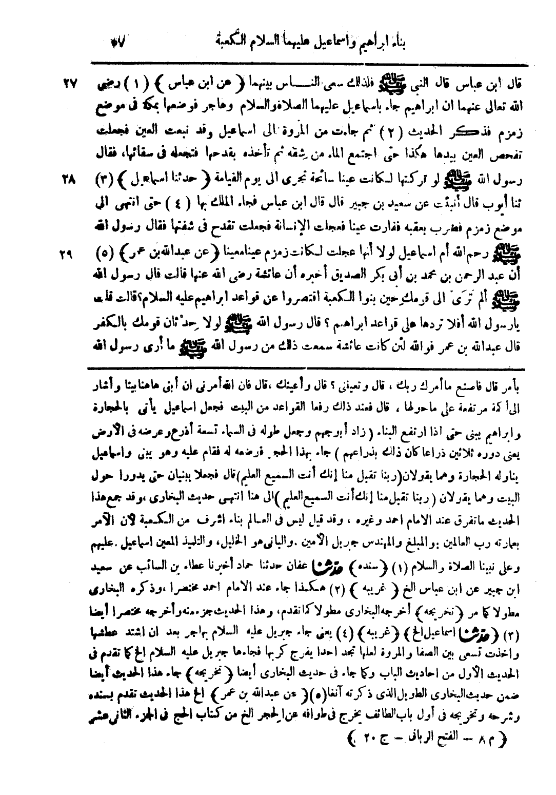 قال ابن عباس قال النبى صلى الله عليه وسلم فلذلك سعى الناس بينهما (عن ابن عباس) (1) رضى الله تعالى عنهما ان ابراهيم جاء باسماعيل عليهما الصلاة والسلام وهاجر فوضعها بمكة فى موضع زمزم فذكر الحديث (2) ثم جاءت من المروة الى اسماعيل وقد نبعت العين فجعلت تفحص العين بيدها هكذا حتى اجتمع الماء من شقه ثم تأخذه بقدحها فتجعله فى سقائها، فقال رسول الله صلى الله عليه وسلم لو تركتها لكانت عينا سائحة تجرى الى يوم القيامة (حدثنا اسماعيل) (3) ثنا أيوب قال أنبئت عن سعيد بن جبير قال قال ابن عباس فجاء الملك بها (4) حتى انتهى الى موضع زمزم فضرب بعقبة ففارت عينا فعجلت الإنسانة فجعلت تقدح فى شفتها فقال رسول الله صلى الله عليه وسلم رحم الله أم اسماعيل لولا أنها عجلت لكانت زمزم عينا معينا (عن عبد الله بن عمر) (5) أن عبد الرحمن بن محمد بن أبى بكر الصديق أخبره أن عائشة رضى الله عنها قالت قال رسول الله صلى الله عليه وسلم ألم ترى الى قرمك حين بنوا الكعبة اقتصروا عن قواعد ابراهيم عليه السلام؟ قالت قلت يا رسول الله أفلا تردها على قواعد أبراهيم؟ قال رسول الله صلى الله عليه وسلم لولا حدثان قومك بالكفر قال عبد الله بن عمر فوالله لئن كانت عائشة سمعت ذلك من رسول الله صلى الله عليه وسلم ما أرى رسول الله