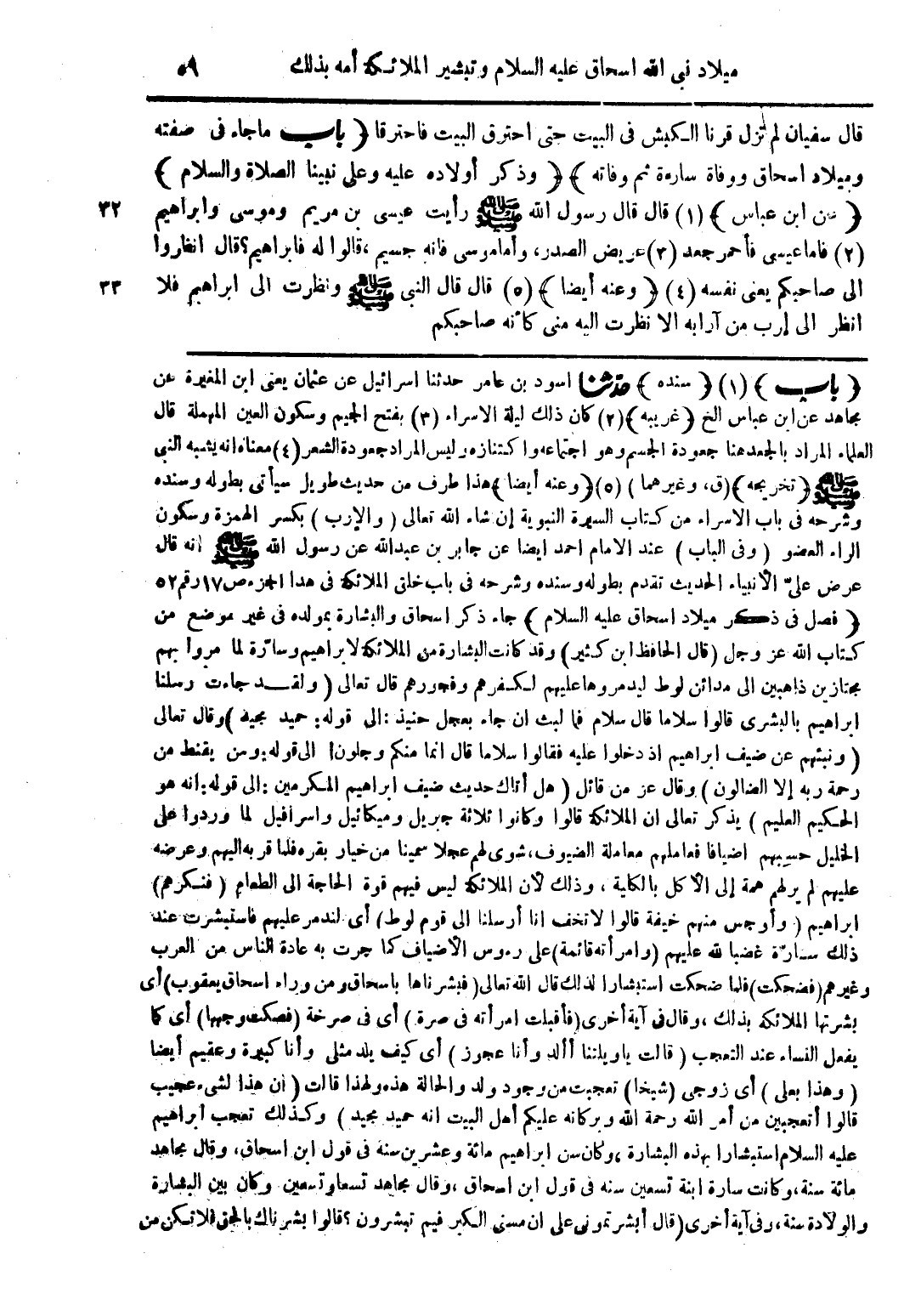 (باب) (1) (سنده) حدثنا اسود بن عامر حدثنا اسرائيل عن عثمان يعنى ابن المغيرة عن مجاهد عن ابن عباس الخ (غريبه) (2) كان ذلك ليلة الاسراء (3) بفتح الجيم وسكون العين المهملة قال العلماء المراد بالجعد هنا جعودة الجسم وهو اجتماعه واكتنازه ليس المرد جعودة الشعر (4) معناه انه يشبه النبى صلى الله عليه وسلم (تخريجه) (ق، وغيرهما) (5) (وعنه أيضا) هذا طرف من حديث طويل سيأتى بطوله وسنده وشرحه فى باب الاسراء من كتاب السيرة النبوية إن شاء الله تعالى (والإرب) بكسر الهمزة وسكون الراء العضو (وفى الباب) عند الامام احمد ايضا عن جابر بن عبد الله عن رسول الله صلى الله عليه وسلم انه قال عرض علّى الأنبياء الحديث تقدم بطوله وسنده وشرحه فى باب خلق الملائكة فى هذا الجزء ص 17 رقم 52 (فصل فى ذكر ميلاد اسحاق عليه السلام) جاء ذكر اسحاق والبشارة بمولده فى غير موضع من كتاب الله عز وجل (قال الحافظ ابن كثير) وقد كانت البشارة من الملائكة لابراهيم وسارّة لما مروا بهم مجتازين ذاهبين الى مدائن لوط ليدمروها عليهم لكفرهم وفجورهم قال تعالى (ولقد جاءت رسلنا ابراهيم بالبشرى قالوا سلاما قال سلام فما لبث ان جاء بعجل حنيذ: الى قوله: حميد مجيد) وقال تعالى (ونبئهم عن ضيف ابراهيم اذ دخلوا عليه فقالوا سلاما قال انما منكم وجلونا الى قوله: ومن يقنط من رحمة ربه إلا الضالون) وقال عز من قائل (هل أتاك حديث ضيف ابراهيم المكرمين: الى قوله: انه هو الحكيم العليم) يذكر تعالى ان الملائكة قالوا وكانوا ثلاثة جبريل وميكائيل واسرافيل لما وردوا على الخليل حسِبهم اضيافا فعاملهم معاملة الضيوف، شوى لهم عجلا سمينا من خيار بقره فلما قربه اليهم وعرضه عليهم لم يرل هم همة إلى الأكل بالكلية، وذلك لأن الملائكة ليس فيهم قوة الحاجة الى الطعام (فنكرهم) ابراهيم (وأوجس منهم خيفة قالوا لا تخف أنا أرسلنا الى قوم لوط) أى لندمر عليهم فاستبشرت عند ذلك سارّة غضبا لله عليهم (وامرأته قائمة) على رءوس الأضياف كما جرت به عادة الناس من العرب وغيرهم (فضحكت) فلما ضحكت استبشارا لذلك قال الله تعالى (فبشرناها باسحاق ومن وراء اسحاق يعقوب) أى بشرتها الملائكة بذلك، وقال فى آية أخرى (فأقبلت امرأته فى صرة) أى فى صرخة (فصكت وجهها) أى كما يفعل النساء عند التعجب (قالت يا ويلتنا أألد وأنا عجوز) أى كيف يلد مثلى وأنا كبيرة وعقيم أيضا (وهذا بعلى) أى زوجى (شيخا) تعجبت من وجود ولد والحالة هذه ولهذا قالت (أن هذا لشئ عجيب قالوا أتعجبين من أمر الله رحمة الله وبركاته عليكم أهل البيت انه حميد مجيد) وكذلك تعجب أبراهيم عليه السلام استبشارا بهذه البشارة، وكان سن ابراهيم مائة وعشرين سنة فى قول ابن اسحاق، وقال مجاهد مائة سنة، وكانت سارة ابنة تسعين سنه فى قول ابن اسحاق، وقال مجاهد تسعا وتسعين وكان بين البشارة والولادة سنة، وفى آية أخرى (قال أبشرتمونى على ان مسنى الكبر فيم تبشرون؟ قالوا بشرناك بالحق فلا تكن من