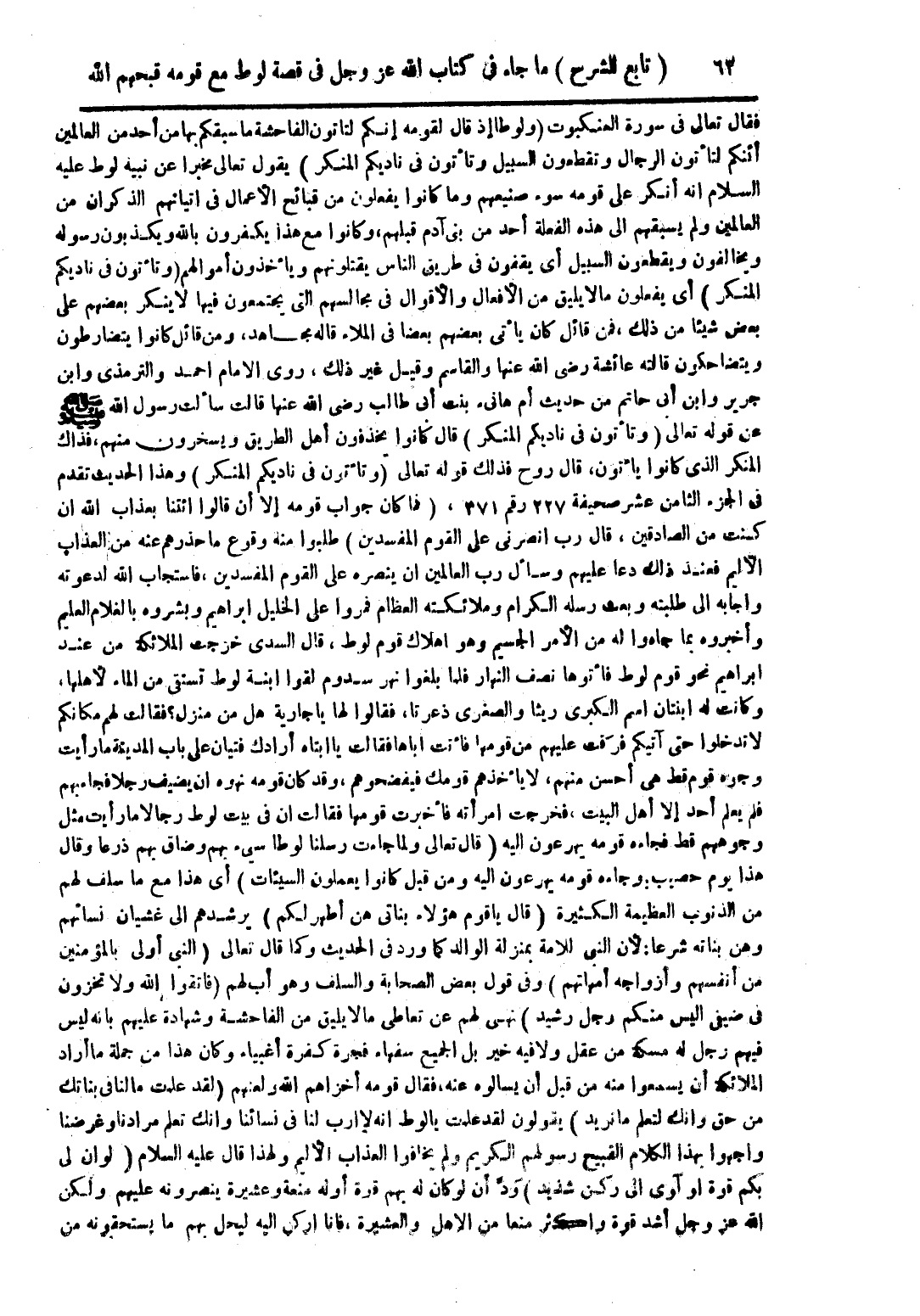 فقال تعالى في سورة العنكبوت (ولوطا إذ قال لقومه إنكم لتاتون الفاحشة ما سبقكم بها من أحد من العالمين أئنكم لتأتون الرجال وتقطعون السبيل وتأتون فى ناديكم المنكر) يقول تعالى مخبرا عن نبيه لوط عليه السلام انه أنكر على قومه سوء صنيعهم وما كانوا يفعلون من قبائح الأعمال فى اتيانهم الذكران من العالمين ولم يسبقهم الى هذه الفعلة أحد من بنى آدم قبلهم، وكانوا مع هذا يكفرون بالله ويكذبون رسوله ويخالفون ويقطعون السبيل أى يقفون فى طريق الناس يقتلونهم ويأخذون أموالهم (وتأتون فى ناديكم المنكر) أى يفعلون ما لا يليق من الأفعال والأقوال فى مجالسهم التى يجتمعون فيها لا ينكر بعضهم على بعض شيئا من ذلك، فمن قائل كان يأتى بعضهم بعضا فى الملأ قاله مجاهد، ومن قائل كانوا يتضارطون ويتضاحكون قالته عائشة رضى الله عنها والقاسم وقيل غير ذلك، روى الامام احمد والترمذى وابن جرير وابن أبى حاتم من حديث أم هانئ بنت أبى طالب رضى الله عنها قالت سألت رسول الله صلى الله عليه وسلم عن قوله تعالى (وتأتون فى ناديكم المنكر) قال كانوا يخذفون أهل الطريق ويسخرون منهم، فذاك المنكر الذى كانوا يأتون، قال روح فذلك قوله تعالى (وتأتون فى ناديكم المنكر) وهذا الحديث تقدم فى الجزء الثامن عشر صحيفة 227 رقم 371، (فما كان جواب قومه إلا أن قالوا ائتنا بعذاب الله ان كنت من الصادقين، قال رب أنصرنى على القوم المفسدين) طلبوا منه وقوع ما حذرهم عنه من العذاب الأليم فعند ذلك دعا عليهم وسأل رب العالمين أن ينصره على القوم المفسدين، فاستجاب الله لدعوته وأجابه الى طلبته وبعث رسله الكرام وملائكته العظام فمروا على الخليل ابراهيم وبشروه بالغلام العليم وأخبروه بما جاءوا له من الأمر الجسيم وهو اهلاك قوم لوط، قال السدى خرجت الملائكة من عند ابراهيم نحو قوم لوط فأتوها نصف النهار فلما بلغوا نهر سدوم لقوا ابنة لوط تستقى من الماء لأهلها، وكانت له ابنتان اسم الكبرى ريثا والصغرى ذعرتا، فقالوا لها يا جارية هل من منزل؟ فقالت لهم مكانكم لا تدخلوا حتى آتيكم فرَفت عليهم من قومها فأتت اباها فقالت يا ابتاه أرادك فتيان على باب المدينة ما رأيت وجوه قوم قط هى أحسن منهم، لا يأخذهم قومك فيفضحوهم، وقد كان قومه نهوه أن يضيف رجلا فجاء بهم فلم يعلم أحد إلا أهل البيت، فخرجت امرأته فأخبرت قومها فقالت ان فى بيت لوط رجالا ما رأيت مثل وجوههم قط فجأءه قومه يهرعون اليه (قال تعالى ولما جاءت رسلنا لوطا سيء بهم وضاق بهم ذرعا وقال هذا يوم حصيب: وجاءه قومه يهرعون اليه ومن قبل كانوا يعملون السيئات) أى هذا ما سلف لهم من الذنوب العظيمة الكثيرة (قال يا قوم هؤلاء بناتى هن أطهر لكم) يرشدهم الى غشيان نسائهم وهن بناته شرعا: لأن النبى للامة بمنزلة الوالد كما ورد فى الحديث وكما قال تعالى (النبى أولى بالمؤمنين من أنفسهم وأزواجه أمهاتهم) وفى قول بعض الصحابة والسلف وهو أب لهم (فاتقوا الله ولا تخزون فى ضيفى اليس منكم رجل رشيد) نهى لهم عن تعاطى ما لا يليق من الفاحشة وشهادة عليهم بانه ليس فيهم رجل له مسكة من عقل ولا فيه خير بل الجميع سفهاء فجرة كفرة أغبياء وكان هذا من جملة ما أراد الملائكة أن يسمعوا منه من قبل أن يسألوه عنه، فقال قومه أخزاهم الله ولعنهم (لقد علمت ما لنا فى بناتك من حق وانك لتعلم ما نريد) يقولون لقد علمت يا لوط انه لا ارب لنا فى نسائنا وانك تعلم مرادنا وغرضنا واجهوا بهذا الكلام القبيح رسولهم الكريم ولم يخافوا العذاب الأليم ولهذا قال عليه السلام (لو ان لى بكم قوة او آوى الى ركن شديد) وَدً أن لو كان له بهم قوة أوله منعة وعشيرة ينصرونه عليهم ولكن الله عز وجل أشد قوة واكثر منعا من الاهل والعشيرة، فانا اركن اليه ليحل بهم ما يستحقونه من