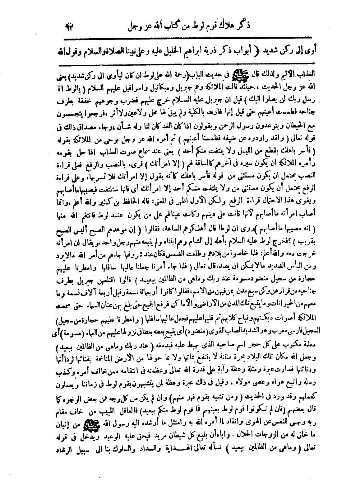 العذاب الأليم ولذلك قال صلى الله عليه وسلم فى حديث الباب (رحمة الله على لوط ان كان ليأوى الى ركن شديد) يعنى الله عز وجل الحديث، حينئذ قالت الملائكة وهم جبريل وميكائيل واسرافيل عليهم السلام (يا لوط انا رسل ربك لن يصلوا اليك) قيل ان جبريل عليه السلام خرج عليهم فضرب وجوههم خفقة بطرف جناحه فطمست أعينهم حتى قيل إنها غارت بالكلية ولم يبق لها محل ولا عين ولا أثر، فرجعوا يتجسسون مع الحيطان ويتوعدون رسول الرحمن ويقولون اذا كان الغد كان لنا وله شأن، وجاء مصداق ذلك فى قوله تعالى (ولقد راودوه عن ضيفه فطمسنا أعينهم) ثم أمره الله عز وجل بوحى من الملائكة بقوله (فأسر باهلك بقطع من الليل ولا يلتفت منكم أحد) يعنى عند سماع صوت العذاب اذا حل بقومه وأمره الملائكة ان يكون سيره فى آخرهم كالساقة لهم (إلا امرأتك) قرئ بالنصب والرفع فعلى قراءة النصب يحتمل ان يكون مستثنى من قوله فأسر باهلك كأنه يقول إلا امرأتك فلا تسربها، وعلى قراءة الرفع يحتمل أن يكون مستثنى من ولا يلتفت منكم أحد إلا امرأتك أى فانها ستلتفت فيصيبها ما أصابهم ويقوى هذا الاحتمال قراءة الرفع ولكن الأول اظهر فى المعنى: قاله الحافظ بن كثير والله أعلم، وانما أصاب امرأته ما أصابهم لأنها كانت على دينهم وكانت عينا لهم على من يكون عند لوط فانتقم الله منها (انه مصيبها ما أصابهم) روى ان لوطا قال أهلكوهم الساعة، فقالوا (إن موعدهم الصبح أليس الصبح بقريب)؟ فخرج لوط عليه السلام بأهله إلى الشام وهم ابنتاه ولم يتبعه منهم رجل واحد، ويقال ان امرأته خرجت معه والله أعلم: فلما خلصوا من بلادهم وطلعت الشمس فكان عند شروقها جاءهم من أمر الله ما لا يرد ومن البأس الشديد ما لا يمكن ان يصد، قال تعالى (فلما جاء أمرنا جعلنا عاليها سافلها وأمطرنا عليهم حجارة من سجيل منضود مسومة عند ربك وما هى من الظالمين ببعيد) قالوا اقتلعهن جبريل بطرف جناحيه من قرارهن وكن سبع مدن بمن فيهن من الامم، فقالوا كانوا أربعمائة نسمة وقيل أربعة آلاف نسمة وما معهم من الحيوانات وما يتبع تلك المدن من الآراضى والأماكن فرفع الجميع حتى بلغ بهن عنان السماء حتى سمعت الملائكة أصوات ديكتهم ونباح كلابهم ثم قلبها عليهم فجعل عاليها سافلها (وأمطرنا عليهم حجارة من سجيل) السجيل فارسى معرب وهو الشديد الصلب القوى (منضود) أى يتبعِ بعضه بعضا فى نزولها عليهم من السماء (مسومة) أى معلمة مكتوب على كل حجر اسم صاحبه الذى يهبط عليه فيدمغه (عند ربك وما هى من الظالمين ببعيد) وجعل الله مكان تلك البلاد بحرة منتنة لا ينتفع بمائها ولا بما حولها من الأرض المتاخمة بفنائها لرداأتها ودنائتها فصارت عبرة ومثلة وعظة وآية على قدرة الله تعالى وعظمته فى انتقامه ممن خالف أمره وكذب رسله وابتع هواه وعصى مولاه، وقيل فى ذلك عبرة وعظة لمن يتشبهون بقوم لوط فى زماننا ويعملون كعملهم وقد ورد فى الحديث (ومن تشبه بقوم فهو منهم) وان لم يكن من كل وجه فمن بعض الوجوه كما قال بعضهم (فان لم تكونوا قوم لوط بعينهم فما قوم لوط منكم ببعيد) فالعاقل اللبيب من خاف مقام ربه ونهى النفس عن الهوى وانقاد لما أمره الله به وأمتثل ما أرشده اليه رسول الله صلى الله عليه وسلم من إتيان ما خلق له من الزوجات الحلال، واياه أن يتبع كل شيطان مريد فيحق عليه الوعيد ويدخل فى قوله تعالى (وما هى من الظالمين ببعيد) نسأله تعالى الهداية والسداد والسلوك بنا إلى سبيل الرشاد