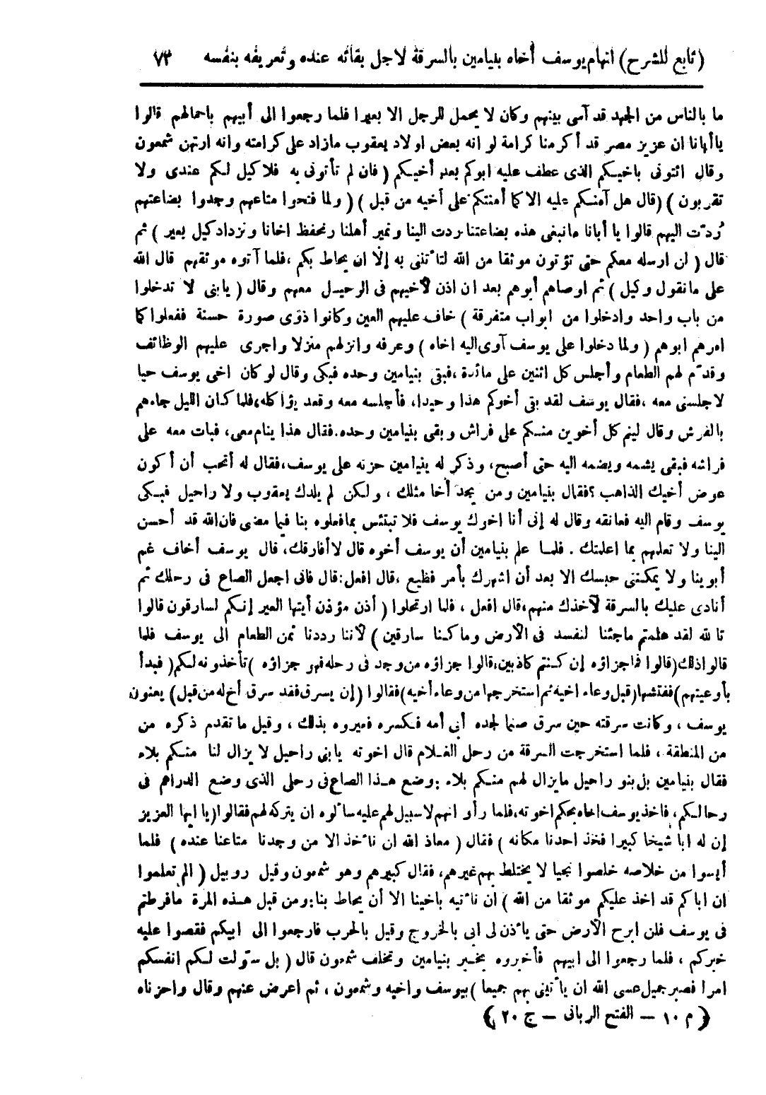 ما بالناس من الجهد قد آسى بينهم وكان لا يحمل للرجال الا بعيرا فلما رجعوا الى أبيهم باحمالهم قالوا يا أبانا ان عزيز مصر قد أكرمنا كرامة لو انه بعض أولاد يعقوب ما زاد على كرامته وانه ارتهن شمعون وقال ائتونى باخيكم الذى عطف عليه ابوكم بعد أخيكم (فان لم تأتونى به فلا كيل لكم عندى ولا تقربون) (قال هل آمنكم عليه الا كما أمنتكم على أخيه من قبل) (ولما فتحوا متاعهم وجدوا بضاعتهم رُدّت اليهم قالوا يا أبانا ما نبغى هذه بضاعتنا ردت الينا ونمير أهلنا ونحفظ اخانا ونزداد كيل بعير) ثم قال (لن ارسله معكم حتى تؤتون موثقا من الله لتأتننى به إلا ان يحاط بكم، فلما آتوه موثقهم قال الله على ما نقول وكيل) ثم اوصاهم أبوهم بعد ان اذن لأخيهم فى الرحيل معهم وقال (يا بنى لا تدخلوا من باب واحد وأدخلوا من ابواب متفرقة) خاف عليهم العين وكانوا ذوى صورة حسنة ففعلوا كما امرهم ابوهم (ولما دخلوا على يوسف آوى اليه اخاه) وعرفه وانزلهم منزلا واجرى عليهم الوظائف وقدّم لهم الطعام وأجلس كل اثنين على مائدة، فبقى بنيامين وحده فبكى وقال لو كان اخى يوسف حيا لاجلسنى معه، فقال يوسف لقد بقى أخوكم هذا وحيدا، فأجلسه معه وقعد يؤاكله، فلما كان الليل جاءهم بالفرش وقال لينم كل أخوين منكم على فراش وبقى بنيامين وحده. فقال هذا ينام معى، فبات معه على فراشه فبقى يشمه ويضمة اليه حتى أصبح، وذكر له بنيامين حزنه على يوسف، فقال له أتحب أن أكون عوض أخيك الذاهب؟ فقال بنيامين ومن يجد أخا مثلك، ولكن لم يلدك يعقوب ولا راحيل فبكى يوسف وقام اليه فعانقه وقال له إنى أنا اخوك يوسف فلا تبتئس بما فعلوه بنا فيما مضى فان الله قد أحسن الينا ولا تعلمهم بما اعلمتك. فلما علم بنيامين أن يوسف أخوه قال لا أفارقك، قال يوسف أخاف غم أبوينا ولا يمكننى حبسك الا بعد أن اشهرك بأمر فظيع، قال افعل: قال فانى اجعل الصاع فى رحلك ثم أنادى عليك بالسرقة لآخذك منهم، قال افعل، فلما ارتحلوا (أذن مؤذن أيتها العير إنكم لسارقون قالوا تا لله لقد علمتم ما جئنا لنفسد فى الأرض وما كنا سارقين) لأننا رددنا ثمن الطعام الى يوسف فلما قالوا ذلك (قالوا فما جزاؤه إن كنت كاذبين، قالوا جزاؤه من وجد فى رحله فهو جزاؤه) تأخذونه لكم (فبدأ بأوعيتهم) ففتشها (قبل وعاء اخيه ثم استخرجها من وعاء أخيه) فقالوا (إن يسرق فقد سرق أخ له من قبل) يعنون يوسف، وكانت سرقته حين سرق صنما لجده أبى أمه فكسره فعيروه بذلك، وقيل ما تقدم ذكره من من المنطقة، فلما استخرجت السرقة من رحل الغلام قال اخوته يا بنى راحيل لا يزال لنا منكم بلاء فقال بنيامين بل بنو راحيل ما يزال لهم منكم بلاء: وضع هذا الصاع فى رحلى الذى وضع الدراهم فى رحالكم، فاخذ يوسف اخاه بحكم اخوته، فلما رأوا نهم لا سبيل لهم عليه سألوه ان يتركه لهم فقالوا (يا إيها العزيز إن له ابا شيخا كبيرا فخذ احدنا مكانه) فقال (معاذ الله ان نأخذ الا من وجدنا متاعنا عنده) فلما أيسوا من خلاصه خلصوا نجيا لا يختلط بهم غيهم، فقال كبيرهم وهو شمعون وقيل روبيل (الم تعلموا ان اباكم قد اخذ عليكم موثقا من الله) ان نأتيه باخينا الا أن يحاط بنا: ومن قبل هذه المرة ما فرطتم فى يوسف فلن ابرح الأرض حتى يأذن لى ابى بالخروج وقيل بالحرب فارجعوا الى ابيكم فقصوا عليه خبركم، فلما رجعوا الى ابيهم فأخبروه بخبر بنيامين وتخلف شمعون قال (بل سّولت لكم انفسكم امرا فصبر جميل عسى الله ان يأتينى بهم جميعا) بيوسف واخيه وشمعون، ثم اعرض عنهم وقال واحزناه