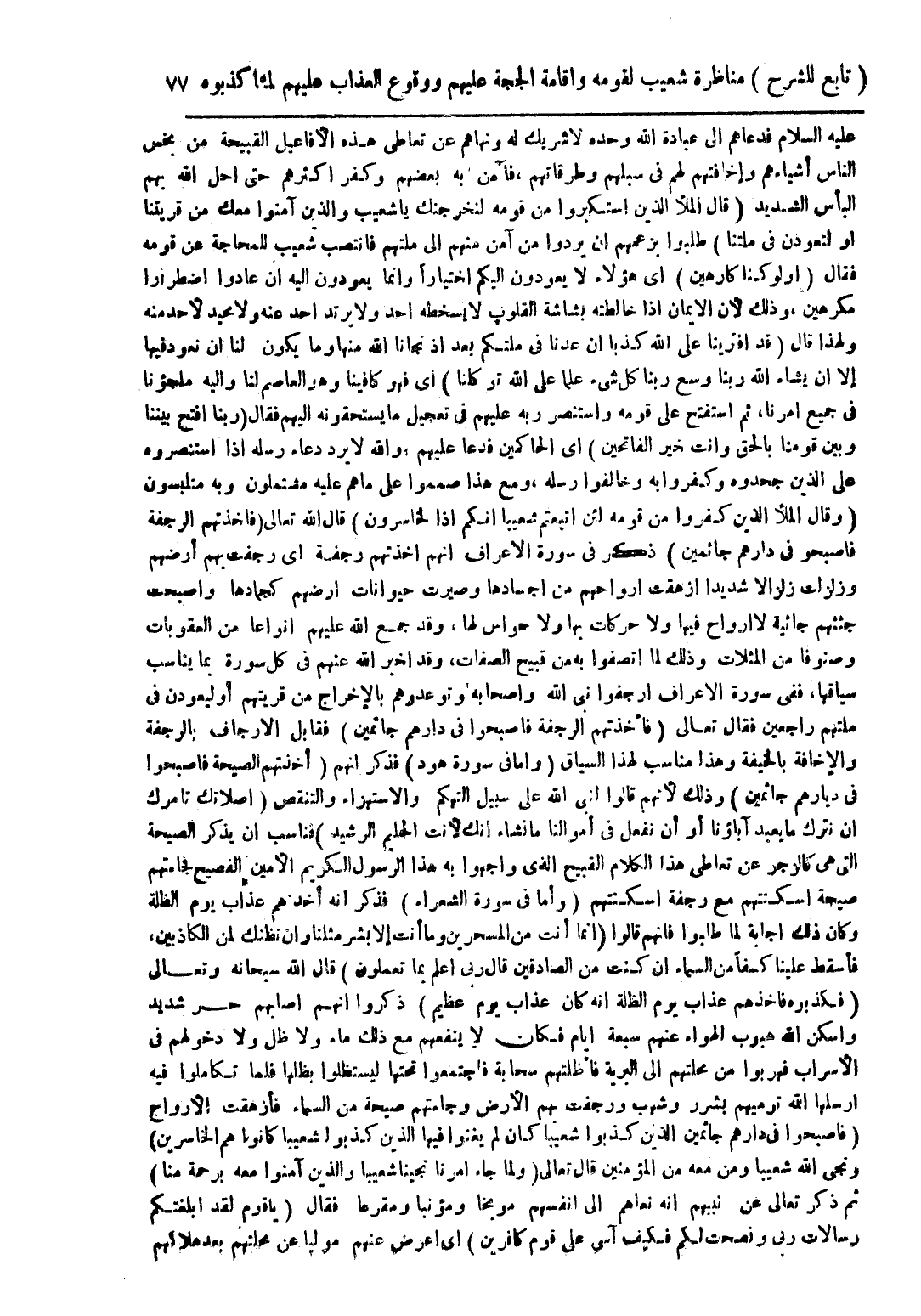 عليه السلام فدعاهم إلى عبادة الله وحده لا شريك له ونهاهم عن تعاطى هذه الأفاعيل القبيحة من بخس الناس أشياءهم وإخافتهم لهم فى سبلهم وطرقاتهم، فآمن به بعضهم وكفر اكثرهم حتى أحل الله بهم البأس الشديد (قال الملأ الذين استكبروا من قومه لنخرجنك يا شعيب والذين آمنوا معك من قريتنا أو لتعودن فى ملتنا) طلبوا بزعمهم إن يردوا من آمن منهم إلى ملتهم فانتصب شعيب للمحاجة عن قومه فقال (اولو كنا كارهين) أى هؤلاء لا يعودون اليكم اختباراً وانما يعودون اليه ان عادوا اضطرار ولهذا قال (قد افترينا على الله كذبا ان عدنا فى ملتكم بعد اذ نجانا الله منهم وما يكون لنا ان نعود فيها إلا ان يشاء الله ربنا وسع ربنا كل شئ علما على الله توكلنا) اى فهو كافينا وهو العاصم لنا واليه ملجؤنا فى جميع امرنا، ثم أستفتح على قومه واستنصر ربه عليهم فى تعجيل ما يستحقونه اليهم فقال (ربنا افتح بيننا وبين قومنا بالحق وانت خير الفاتحين) اى الحاكمين فدعا عليهم، والله لا يرد دعاء رسله أذا استنصروه على الذين جحدوه وكفروا به وخالفوا رسله، ومع هذا صمموا على ما هم عليه مشتملون وبه متلبسون (وقال الملأ الذين كفروا من قومه لئن اتبعتم شعيبا انكم اذا لخاسرون) قال الله تعالى (فاخذتهم الرجفة فاصبحوا فى دارهم جائمين) ذكر فى سورة الأعراف أنهم اخذتهم رجفة أى رجفت بهم أرضهم وزلزلت زلزالا شديدا ازهقت ارواحهم من أجسادها وصيرت حيوانات أرضهم كجمادها وأصبحت جثتهم جاثية لا أرواح فيها ولا حركات بها ولا حواس لها، وقد جمع الله عليهم انواعا من العقوبات وصنوفا من المئلات وذلك لما اتصفوا به من قبيح الصفات، وقد اخبر الله عنهم فى كل سورة بما يناسب سياقها، ففى سورة الأعراف ارجفوا نبى الله وأصحابه وتوعدوهم بالإخراج من قريتهم أو ليعودن فى ملتهم راجعين فقال تعالى (فأخذتهم الرجفة فأصبحوا فى دارهم جائمين) فقابل الأرجاف بالرجفة والإخافة بالخيفة وهذا مناسب لهذا السياق (وأما فى سورة هود) فذكر أنهم (أخذتهم الصيحة فأصبحوا فى ديارهم جاثمين) وذلك لأنهم قالوا لنبى الله على سبيل التهكم والاستهزاء والتنقص (اصلاتك تأمرك ان نترك ما يعبد آباؤنا أو أن نفعل فى أموالنا ما نشاء أنك لأنت الحليم الرشيد) فناسب ان يذكر الصيحة التي هى كالزجر عن تعاطى هذا الكلام القبيح الذى واجهوا به هذا الرسول الكريم الأمين الفصيح فجامتهم صيحة اسكتتهم مع رجفة أسكنتهم (وأما فى سورة الشعراء) فذكر أنه أخذهم عذاب يوم الظلة وكان ذلك أجابة لما طلبوا فانهم قالوا (انما أنت من المسحرين وما أنت إلا بشر مثلنا وان نظنك لمن الكاذبين، فأسقط علينا كسفاً من السماء ان كنت من الصادقين قال ربى أعلم بما تعملون) قال الله سبحانه وتعالى (فكذبوه فاخذهم عذاب يوم الظلة انه كان عذاب يوم عظيم) ذكروا انهم اصابهم حر شديد وأسكن الله هبوب الهواء عنهم سبعة أيام فكان لا ينفعهم مع ذلك ماء ولا ظل ولا دخولهم فى الأسراب فهربوا من محلتهم الى البرية فأظلتهم سحابة فاجتمعوا تحتها ليستظلوا بظلها فلما تكاملوا فيه أرسلها الله ترميهم بشرر وشهب ورجفت بهم الأرض وجامتهم صيحة من السماء فأزهقت الأرواح (فاصبحوا فى دارهم جائمين الذين كذبوا شعيبا كان لم يغنوا فيها الذين كذبول شعيبا كانوا هم الخاسرين) ونجى الله شعيبا ومن معه من المؤمنين قال تعالى (ولما جاء أمرنا نجينا شعيبا والذين آمنوا معه برحمة منا) ثم ذكر تعالى عن نبيهم انه نعاهم الى أنفسهم موبخا ومؤنبا ومقرعا فقال (يا قوم لقد ابلغتكم رسالات ربى ونصحت لكم فكيف آسىِ على قوم كافرين) اى اعرض عنهم موليا عن محلتهم بعد هلاكهم