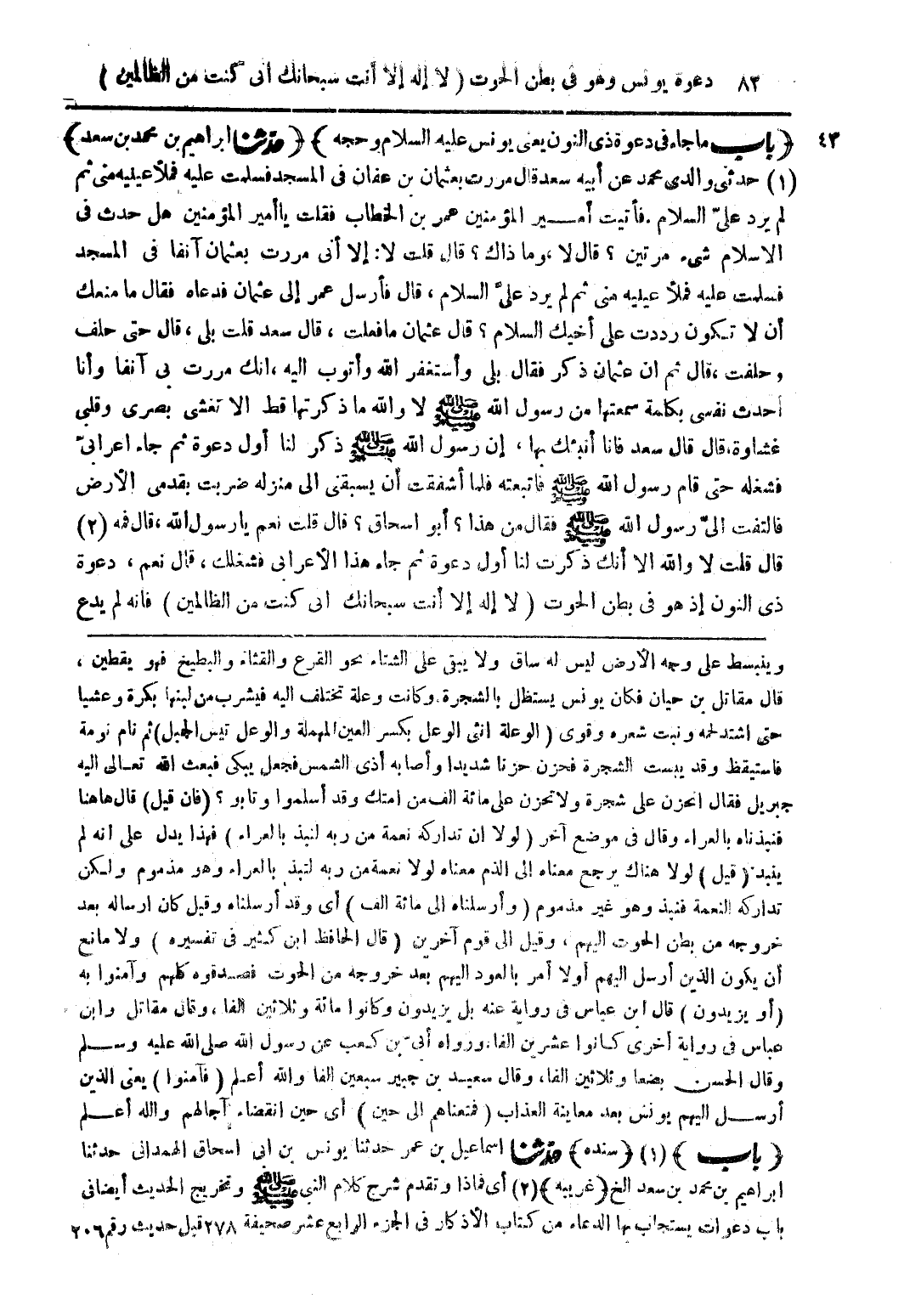 (باب ما جاء في دعوة ذي النون يعني يونس عليه السلام وحجه) (حدثنا إبراهيم بن محمد بن سعد) (1) حدثني والدي محمد عن أبيه سعد قال مررت بعثمان بن عفان في المسجد فسلمت عليه فملأ عينيه منى ثم لم يرد علىّ السلام. فأتيت أمير المؤمنين عمر بن الخطاب فقلت يا أمير المؤمنين هل حدث فى الاسلام شيء مرتين؟ قال لا، وما ذاك؟ قال قلت لا: إلا أنى مررت بعثمان آنفا فى المسجد فسلمت عليه فملأ عينيه منى ثم لم يرد علىّ السلام، قال فأرسل عمر إلى عثمان فدعاه فقال ما منعك أن لا تكون رددت على أخيك السلام؟ قال عثمان ما فعلت، قال سعد قلت بلى، قال حتى حلف وحلفت، قال ثم أن عثمان ذكر فقال بلى وأستغفر الله وأتوب إليه، انك مررت بى آنفا وأنا أحدث نفسى بكلمة سمعتها من رسول الله صلي الله عليه وسلم لا والله ما ذكرتها قط الا تغشى بصرى وقلبى غشاوة، قال قال سعد فانا أنبئك بها، إن رسول الله صلي الله عليه وسلم ذكر لنا أول دعوة ثم جاء أعرابى فشغله حتى قام رسول الله صلي الله عليه وسلم فاتبعته فلما أشفقت أن يسبقنى الى منزله ضربت بقدمى الأرض فالتفت الىّ رسول الله صلي الله عليه وسلم فقال من هذا؟ أبو اسحاق؟ قال قلت نعم يا رسول الله، قال فمه (2) قال قلت لا والله الا أنك ذكرت لنا أول دعوة ثم جاء هذا الأعرابى فشغلك، قال نعم، دعوة ذى النون إذ هو فى بطن الحوت (لا إله إلا أنت سبحانك أنى كنت من الظالمين) فأنه لم يدع