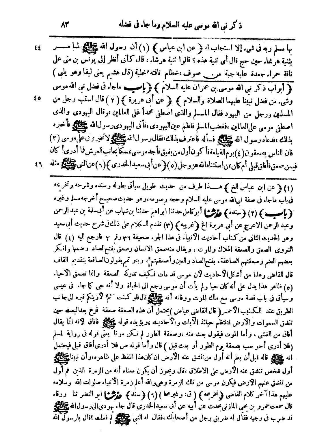 بها مسلم ربه فى شئ إلا استجاب له (عن ابن عباس) (1) أن رسول الله صلي الله عليه وسلم لما مر بثنية هرشاء حين حج قال أى ثنية هذه؟ قالوا ثنية هرشاء، قال كأنى أنظر إلى يونس بن متى على ناقة حمراء جعدة عليه جبة من صوف، خطام ناقتهُ خلبة (قال هشيم يعنى ليفا وهو يلبى). (أبواب ذكر نبى الله موسى بن عمران عليه السلام) (باب ما جاء فى فضل نبى الله موسى وشئ من فضل نبينا عليهما الصلاة والسلام) (عن أبى هريرة) (2) قال أستب رجل من المسلمين ورجل من اليهود فقال المسلم والذى أصطفى محمداً على العالمين، وقال اليهودى والذى أصطفى موسى على العالمين، فغضب المسلم فلطم عين اليهودى، فأتى اليهودى رسول الله صلي الله عليه وسلم فأخبره بذلك، فدعاه رسول الله صلي الله عليه وسلم فسأله فاعترف بذلك، فقال رسول الله صلي الله عليه وسلم لا تخيرونى على موسى (3) فان الناس يصعقون (4) يوم القيامة فأكون أول من يفيق فأجد موسى ممسكا بجانب العرش فما أدرى أكان فيمن صعق فأفاق قبلى أم كان ممن استثناه الله عز وجل (5) (عن أبى سعيد الخدرى) (6) عن النبى صلي الله عليه وسلم مثله.