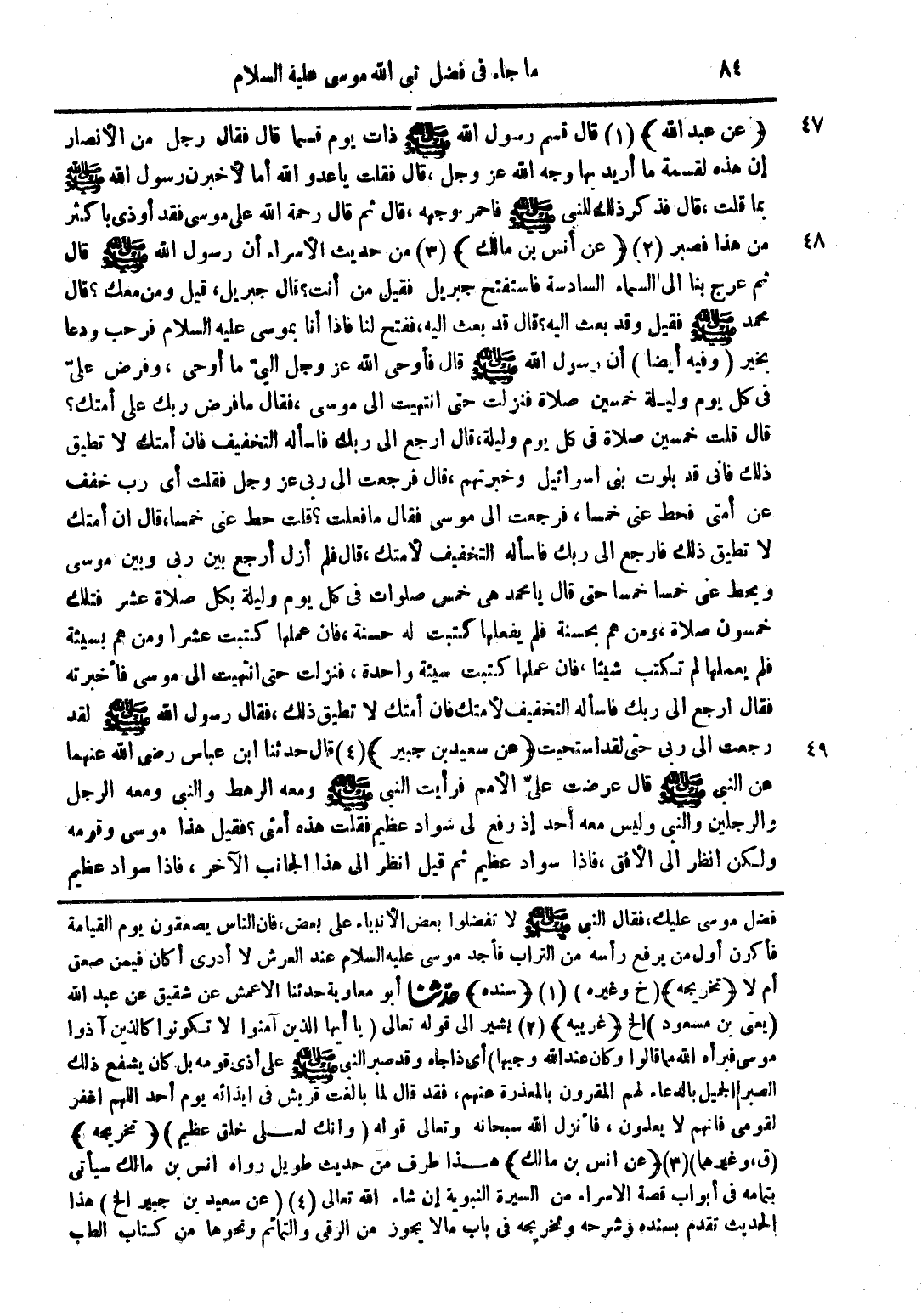 (عن عبد الله) (1) قال قسم رسول الله صلي الله عليه وسلم ذات يوم قسما قال فقال رجل من الأنصار إن هذه لقسمة ما أريد بها وجه الله عز وجل، قال فقلت يا عدو الله أما لأخبرن رسول الله صلي الله عليه وسلم بما قلت، قال فذكر ذلك للنبى صلي الله عليه وسلم فاحمر وجهه، قال ثم قال رحمة الله على موسى فقد أوذى باكثر من هذا فصبر (2) (عن أنس بن مالك) (3) من حديث الأسراء أن رسول الله صلي الله عليه وسلم قال ثم عرج بنا إلى السماء السادسة فاستفتح جبريل فقيل من أنت؟ قال جبريل، قيل ومن معك؟ قال محمد صلي الله عليه وسلم فقيل وقد بعث اليه؟ قال قد بعث اليه، ففتح لنا فاذا أنا بموسى عليه السلام فرحب ودعا بخير (وفيه أيضا) أن رسول الله صلي الله عليه وسلم قال فأوحى الله عز وجل اليّ ما أوحى، وفرض علىّ فى كل يوم وليلة خمسين صلاة فنزلت حتى انتهيت الى موسى، فقال ما فرض ربك على أمتك؟ قال قلت خمسين صلاة فى كل يوم وليلة، قال أرجع الى ربك فاسأله التخفيف فان أمتك لا تطيق ذلك فانى قد بلوت بنى اسرائيل وخبرتهم، قال فرجعت الى ربى عز وجل فقلت أى رب خفف عن أمتى فحط عنى خمسا، فرجعت الى موسى فقال ما فعلت؟ قلت حط عنى خمسا، قال أن أمتك لا تطيق ذلك فارجع الى ربك فاسأله التخفيف لأمتك، قال فلم أزل أرجع بين ربى وبين موسى ويحط عنى خمسا خمسا حتى قال يا محمد هى خمس صلوات فى كل يوم وليلة بكل صلاة عشر فتلك خمسون صلاة، ومن هم بحسنة فلم يفعلها كتبت له حسنة، فان عملها كتبت عشرا ومن هم بسيئة فلم يعملها لم تكتب شيئا، فان عملها كتبت سيئة واحدة، فنزلت حتى أنهيت الى موسى فأخبرته فقال أرجع الى ربك فاسأله التخفيف لأمتك فان أمتك لا تطيق ذلك، فقال رسول الله صلي الله عليه وسلم لقد رجعت الى ربى حتى لقد أستحيت (عن سعيد بن جبير) (4) قال حدثنا ابن عباس رضى الله عنهما عن النبي صلي الله عليه وسلم قال عرضت علىّ الأمم فرأيت النبى صلي الله عليه وسلم ومعه الرهط والنبى ومعه الرجل والرجلين والنبى وليس معه أحد إذ رفع لى سواد عظيم فقلت هذه أمتى؟ فقيل هذا موسى وقومه ولكن انظر الى الأفق، فاذا سواد عظيم ثم قيل انظر الى هذا الجانب الآخر، فاذا سواد عظيم
