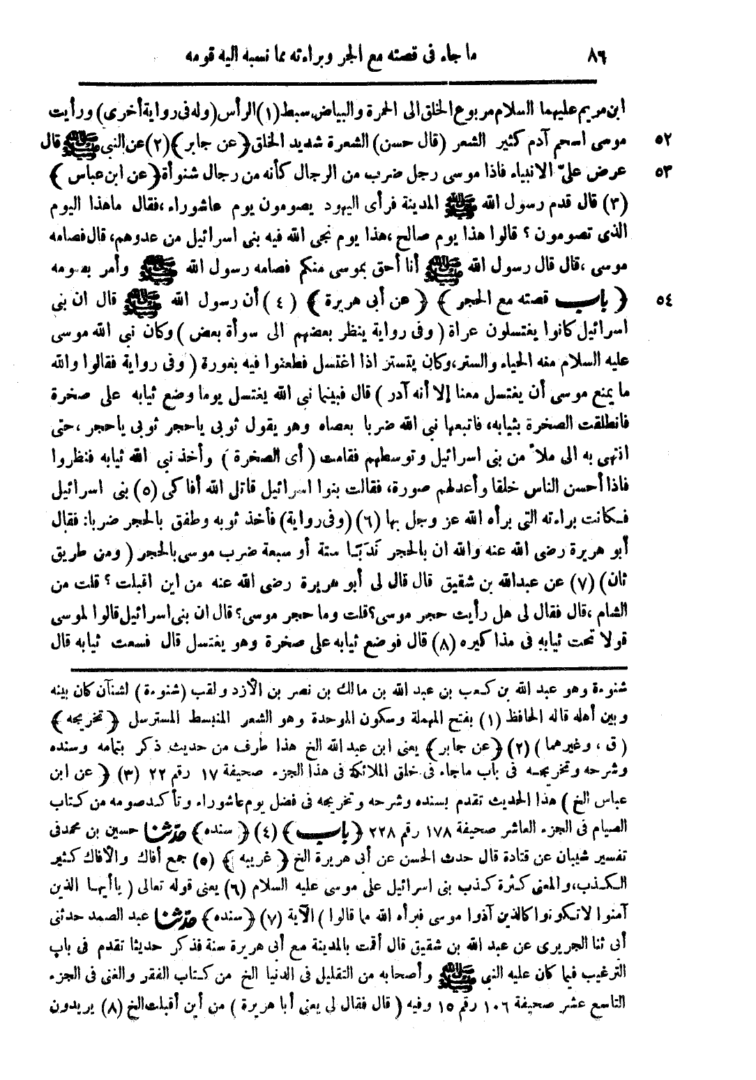 ابن مريم عليهما السلام مربوع الخلق الى الحمرة والبياض، سبط (1) الرأس (وله فى رواية أخرى) ورأيت موسى أسحم آدم كثير الشعر (قال حسن) الشعرة شديد الخلق (عن جابر) (2) عن النبى صلي الله عليه وسلم قال عرض علىّ الانبياء فاذا موسى رجل ضرب من الرجال كأنه من رجال شنوأة (عن أبن عباس) (3) قال قدم رسول الله صلي الله عليه وسلم المدينة فرأى اليهود يصومون يوم عاشوراء، فقال ما هذا اليوم الذى تصومون؟ قالوا هذا يوم صالح، هذا يوم نجى الله فيه بنى اسرائيل من عدوهم، قال فصامه موسى، قال قال رسول الله صلي الله عليه وسلم أنا أحق بموسى منكم فصامه رسول الله صلي الله عليه وسلم وأمر بصومه. (باب قصته مع الحجر) (عن أبى هريرة) (4) أن رسول الله صلي الله عليه وسلم قال أن بنى اسرائيل كانوا يغتسلون عراة (وفى رواية ينظر بعضهم الى سوأة بعض) وكان نبى الله موسى عليه السلام منه الحياء والستر، وكان يتستر اذا اغتسل فطعنوا فيه بغورة (وفى رواية فقالوا والله ما يمنع موسى أن يغتسل معنا إلا أنه آدر) قال فبينما نبى الله يغتسل يوما وضع ثيابه على صخرة فانطلقت الصخرة بثيابه، فاتبعها نبى الله ضربا بعصاه وهو يقول ثوبى يا حجر ثوبى يا حجر، حتى انتهى به الى ملأ من بنى اسرائيل وتوسطهم فقامت (أى الصخرة) وأخذ نبى الله ثيابه فنظروا فاذا أحسن الناس خلقا وأعدلهم، صورة، فقالت بنوا اسرائيل قاتل الله أفاكى (5) بنى اسرائيل فكانت براءته التى برأه الله عز وجل بها (6) (وفى رواية) فأخذ ثوبه وطفق بالحجر ضربا: فقال أبو هريرة رضى الله عنه والله أن بالحجر نَدَبَا ستة أو سبعة ضرب موسى بالحجر (ومن طريق ثان) (7) عن عبد الله بن شقيق قال قال لى أبو هريرة رضى الله عنه من أين أقبلت؟ قلت من الشام، قال فقال لى هل رأيت حجر موسى؟ قلت وما حجر موسى؟ قال أن بنى أسرائيل قالوا لموسى قولا تحت ثيابه فى مذاكيره (8) قال فوضع ثيابه على صخرة وهو يغتسل قال فسع ثيابه قال