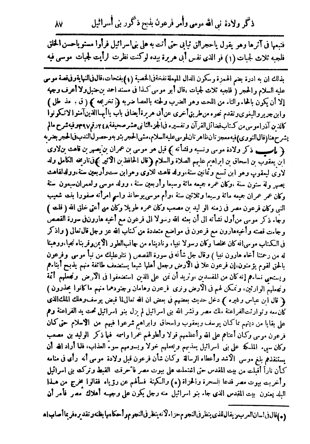 بذلك أن به أدرة بضم الهمزة وسكون الدال المهملة الخصية (1) بفتحات، قال فى النهاية وفى قصة موسى عليه السلام والحجر (فلجبه ثلاث لجيات، قال أبو موسى كذا فى مسند أحمد بن حنبل ولا أعرف وجبه إلا أن يكون بالحاء والتاء من اللحت وهو الضرب ولحته بالعصا ضربه (تخريجه) (ق. مذ طل) وابن جرير والبغوى وتقدم نحوه من طريق أخرى عن أبى هريرة أيضا فى باب يا أيها الذين آمنوا لا تكونوا كالذين آذرا موسى من كتاب فضائل القرآن وتفسيره فى الجزء الثانى عشر صحيفة 248 رقم 397 وفيه شرح ما لهم يشرح هنا (قال النووى) فيه معجزتان ظاهرتان لموسى عليه السلام، مشى الحجر بثوبه وحصول الندب فى الحجر بضربه (باب ذكر ولادة موسى ونسبه ونشأته) قيل هو موسى بن عمران بن يصهر بن قاهث بن لاوى ابن يعقوب بن اسحاق بن ابراهيم عليهم الصلاة والسلام (قال الحافظ بن الأثير) فى تاريخه الكامل ولد لاوى ليعقوب وهو ابن تسع وثمانين سنة، وولد قاهث للاوى وهو ابن ست وأربعين سنة، وولد لقاهث يصهر وله ستون سنة، وكان عمره جميعه مائة وسبعا وأربعين سنة، وولد موسى ولعمران سبعون سنة وكان عمر عمران جميعه مائة وسبعا وثلاثين سنة، وأن موسى يوحانذ واسم امرأته صفورا بنت شعيب النبى وكان فرعون مصر فى زمنه الوليد بن مصعب وكان عمره طويلا وكان من أعتى خلق الله (قلت) وجاء ذكر موسى من أول نشأته الى أن بعثه الله رسولا الى فرعون مع أخيه هارون فى سورة القصص وجاءت قصته وأخيه هارون مع فرعون فى مواضع متعددة من كتاب الله عز وجل قال تعالى (واذكر فى الكتاب موسى انه كان مخلصا وكان رسولا نبيا، وناديناه من جانب الطور الأيمن وقربناه نجيا، ووهبنا له من رحمتنا أخاه هارون نبيا) وقال جل شأنه فى سورة القصص (نتلو عليك من نبأ موسى وفرعون بالحق لقوم يؤمنون، إن فرعون علا فى الأرض وجعل أهلها شيعا يستضعف طائفة منهم يذبح أبناءهم ويستحي نساءهم إنه كان من المفسدين، ونريد أن نمن على الذين استضعفوا فى الأرض ونجعلهم أئمة ونجعلهم الوارثين، ونمكن لهم فى الأرض ونرى فرعون وهامان وجنودهما منهم ما كانوا يحذرون) (قال ابن عباس وغيره) دخل حديث بعضهم فى بعض ان الله تعالى لما قبض يوسف وهلك الملك الذى كان معه وتوارثت الفراعنة ملك مصر ونشر الله نبى اسرائيل لم يزل بنو اسرائيل تحت يد الفراعنة وهم على بقايا من دينهم مما كان يوسف ويعقوب واسحاق وابراهيم شرعوا فيهم من الأسلام حتى كمان فرعون موسى وكان أعتاهم على الله وأعظمهم قولا وأطولهم عمرا واسمه فيما ذكر الوليد بن مصعب وكان سيء الملكة على بنى اسرائيل يعذبهم ويجعلهم خولا ويسومهم سوء العذاب، فلما أراد الله أن يستنقذهم بلغ موسى الأشد وأعطاه الرسالة وكان شأن فرعون قبل ولادة موسى أنه رأى فى منامه كأن ناراً أقبلت من بيت المقدس حتى اشتملت على بيوت مصر فأحرقت القبط وتركت بنى اسرائيل وأخربت بيوت مصر فدعا السحرة والحزاة (¬1) والكهنة فسألهم عن رؤياه فقالوا يخرج من هذا البلد يعنون بيت المقدس الذى جاء بنو اسرائيل منه رجل يكون على وجهه أهلاك مصر فأمر أن