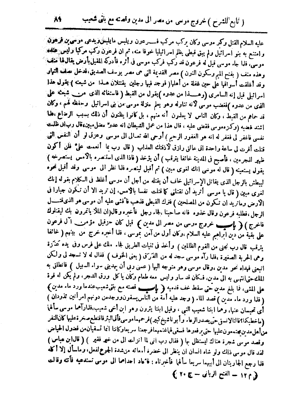 عليه السلام القتل وكبر موسى وكان يركب مركب فرعون ويلبس ويدعى موسى بن فرعون وامتنع به بنو اسرائيل ولم يبق قبطى يظلم اسرائيليا خوفا منه، ثم ان فرعون ركب مركبا وليس عنده موسى، فلما جاء موسى قيل له فرعون قد ركب فركب موسى فى أثره فأدركه المقبل بأرض يقال لها منف وهذه منف (بفتح الميم وسكون النون) مصر القديمة التى هى مصر يوسف الصديق، فدخل نصف النهار وقد أغلقت أسواقها على حين غفلة من أهلها (فوجد فيها رجلين يقتتلان هذا من شيعته) يقول هذا اسرائيلى قيل إنه السامرى (وهذا من عدوه) يقول من القبط (فاستغاثه الذى من شيعته على الذى من عدوه) فغضب موسى لأنه تناوله وهو يعلم منزلة موسى من بنى اسرائيل وحفظه لهم، وكان قد حماهم من القبط، وكان الناس لا يعلمون أنه منهم، بل كانوا يظنون أن ذلك بسبب الرضاع، فلما اشتد غضبه (وكزه موسى فقضى عليه، قال هذا من عمل الشيطان إنه عدوَّ مضل مبين، قال رب أنى ظلمت نفسى فاغفر لى فغفر له انه هو الغفور الرحيم) أوحى الله تعالى الى موسى وعزتى لو أن النفس التى قتلت أفرت لى ساعة واحدة انى خالق رازق لأذقتك العذاب (قال رب بما أنعمت علىِّ فلن أكون ظهير للمجرمين، فأصبح فى المدينة خائفا يترقب) أن يؤخذ (فاذا الذى استنصره بالأمس يستصرخه) يقول يستعينه (قال له موسى أنك لغوى مبين) ثم أقبل لينصره فلما نظر الى موسى وقد أقبل نحوه ليبطش بالرجل الذى يقال الإسرائيلى خاف أن يقتله من أجل أن موسى أغلظ فى الكلام بقوله إنك لغوى مبين (قال يا موسى أتريد أن تقتلنى كما قتلت نفسا بالأمس، إن تريد الا أن تكون جبارا فى الأرض وما تريد ان تكون من المصلحين) فترك القبطى فأفشى عليه أن موسى هو الذى قتل الرجل، فطلبه فرعون وقال خذوه فانه صاحبنا، فجاء رجل فأخبره وقال (ان الملأ يا تمرون بك ليقتلوك فاخرج) (باب خروج موسى من مصر الى مدين) قيل كان حزقيل مؤمن آل فرعون على بقية من دين ابراهيم عليه السلام، وكان أول من آمن بموسى، فلما أخبره خرج من بينهم (خائفا يترقب قال رب نجنى من القوم الظالمين) وأخذ فى ثنيات الطريق فجاء ملك على فرس وفى يده عَنَزة وهى الحربة الصغيرة، فلما رآه موسى سجد له من الفَرَق (يعنى الخوف) فقال له لا تسجد لى ولكن اتبعنى فهداه نحو مدين، وقال موسى وهو متوجه اليها (عسى ربى أن يهدينى سواء السبيل) فانطلق به الملك حتى انتهى به الى ميدن، فكان قد سار وليس معه طعام وكان ياكل ورق الشجر، ولم يكن له قرة على المشى، فما بلغ مدين حتى سقط خف قدميه (باب قصته مع بنتى شعيب عندما ورد ماء مدين) (فلما ورد ماء مدين) قصد الماء (وجد عليه أمة من الناس يسقون ووجد من دونهم امرأتين تذودان)