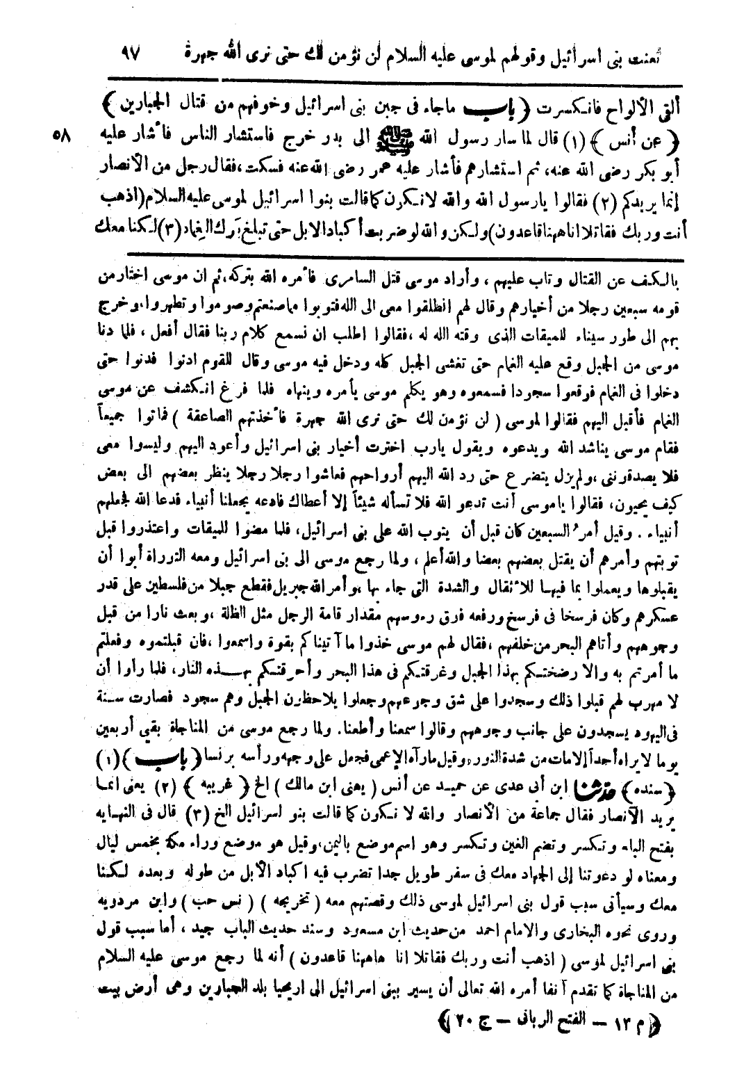 ألقى الألواح فانكسرت (باب ما جاء فى جبن بنى اسرائيل وخوفهم من قتال الجبارين) (عن أنس) (1) قال لما سار رسول الله صلي الله عليه وسلم الى بدر خرج فاستشار الناس فأشار عليه أبو بكر رضى الله عنه، ثم استشارهم فأشار عليه عمر رضى الله عنه فسكت، فقال رجل من الأنصار إنما يريدكم (2) فقالوا يا رسول الله والله لا نكون كما قالت بنوا اسرائيل لموسى عليه السلام (اذهب أنت وربك فقاتلا أنا ههنا قاعدون) ولكن والله لو ضربت أكباد الابل حتى تبلغ بَرك الغِماد (3) لكنا معك
