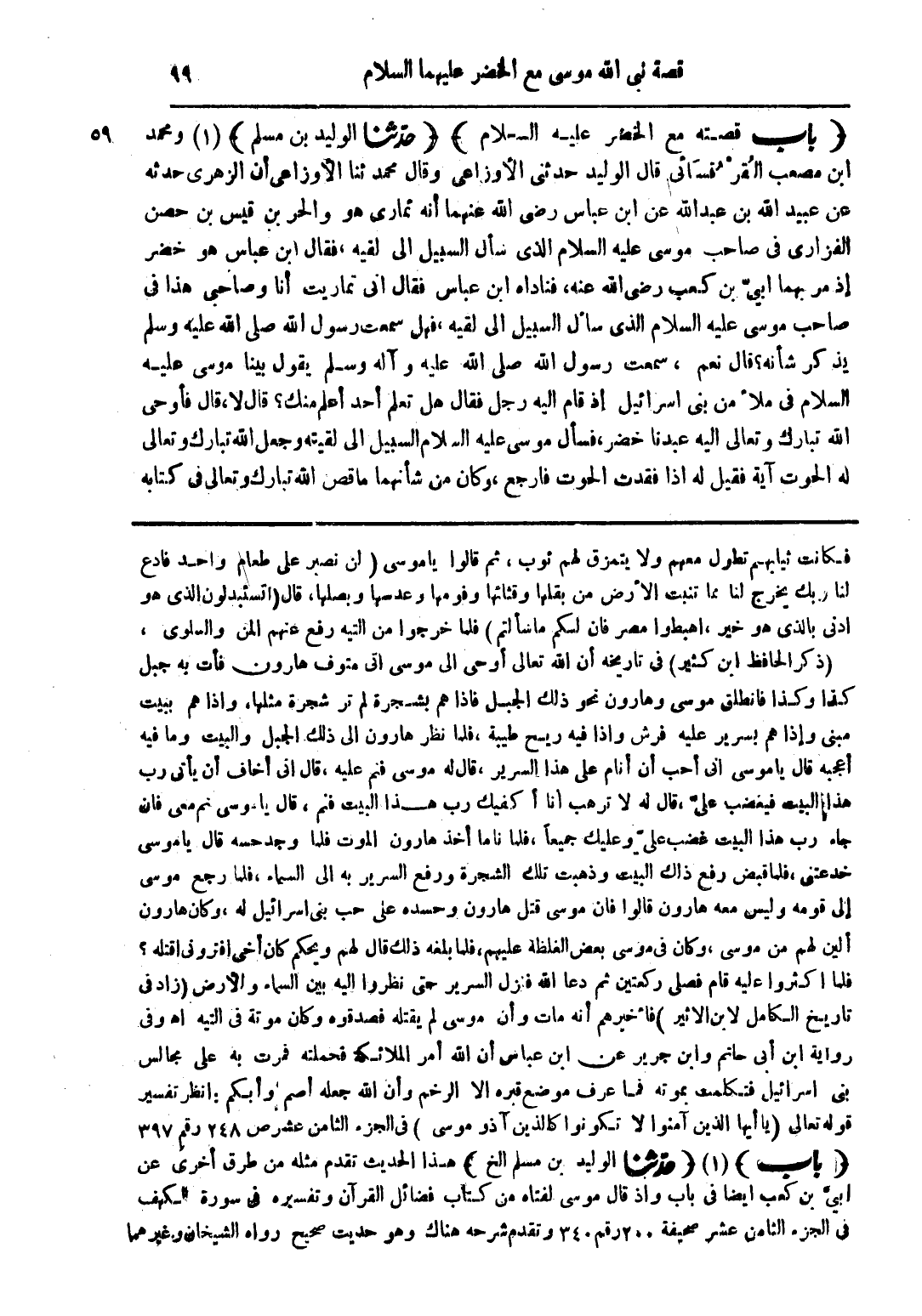 (باب قصته مع الخضر عليه السلام) (حدثنا الوليد بن مسلم) (1) ومحمد أبن مصعب القُرنُسائى قال الوليد حدثنى الأوزاعى وقال محمد ثنا الأوزاعى أن الزهرى حدثه عن عبيد الله بن عبد الله عن ابن عباس رضى الله عنهما أنه ثمارى هو والحر بن قيس بن حصن الفزارى فى صاحب موسى عليه السلام الذى سأل السبيل الى لقيه، فقال ابن عباس هو خضر إذ مر بهما ابيّ بن كعب رضى الله عنه، فناداه ابن عباس فقال انى تماريت أنا وصاحبى هذا فى صاحب موسى عليه السلام الذى سأل السبيل إلى لقيه، فهل سمعت رسول الله صلى الله عليه وسلم يذكر شأنه؟ قال نعم، سمعت رسول الله صلى الله عليه وآله وسلم يقول بينا موسى عليه السلام فى ملأ من بنى اسرائيل إذ قام اليه رجل فقال هل تعلم أحد أعلم منك؟ قال لا، قال فأوحى الله تبارك وتعالى اليه عبدنا خضر، فسأل موسى عليه السلام السبيل الى لقيته وجعل الله تبارك وتعالى له الحوت آية فقيل له اذا فقدت الحوت فارجع، وكان من شأنهما ما قص الله تبارك وتعالى في كتابه