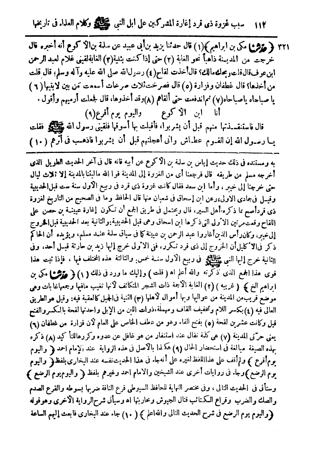 (حدثنا مكي بن ابراهيم) (1) قال حدثنا يزيد بن أبى عبيد عن سلمة بن الأكوع أنه أخبره قال خرجت من المدينة ذاهباً نحو الغابة (2) حتى إذا كنت بثنية (3) الغابة لقينى غلام لعبد الرحمن ابن عوف قال قلت ويحك ما لك؟ قال أخذت لقاح (4) رسول الله صلى الله عليه وآله وسلم؛ قال قلت من أخذها؟ قال غطفان وفزارة (5) قال فصرخت ثلاث صرخات أسمعت من بين لابتيها (6) يا صباحاه يا صباحاه (7) ثم اندفعت حتى ألقاهم (8) وقد أخذوها، قال فجعلت أرميهم وأقول.