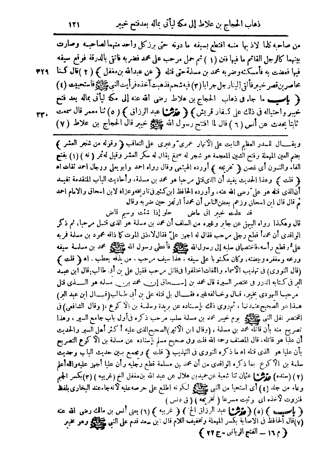 من صاحبه كلما لاذ بها منه اقتطع بسيفه ما دونه حتى برز كل واحد منهما لصاحبه وصارت بينهما كالرجل القائم ما فيها فنن (1) ثم حمل مرحب على محمد فضربه فاتقى بالدرقة فوقع سيفه فيها فعضت به فأمسكته وضربه محمد بن مسلمة حتى قتله (عن عبد الله بن مغفل) (2) قال كنا محاصرين قصر خيبر فألقى إلينا رجل جراباً (3) فيه شحم فذهبت آخذه فرأيت النبى صلى الله عليه وسلم فاستحييت (4) (باب ما جاء فى ذهاب الحجاج بن علاط رضى الله عنه إلى مكة ليأتى بماله بعد فتح خيبر واحتياله فى ذلك على كفار قريش) (حدثنا عبد الرزاق) (5) ثنا معمر قال سمعت ثابتاً يحدث عن أنس (6) قال لما افتتح رسول الله صلى الله عليه وسلم خيبر قال الحجاج بن علاط (7)