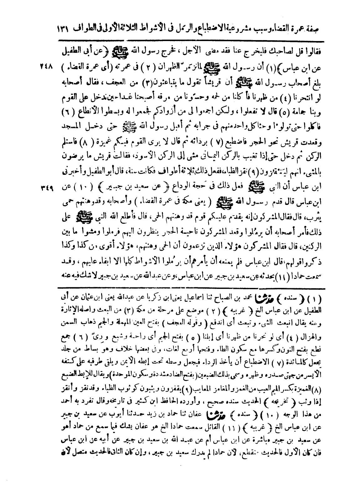 (1) (سنده) حدثنا محمد بن الصباح ثنا اسماعيل يعنى ابن زكريا عبن عبد الله يعنى ابن عثمان عن أبى الطفيل عن ابن عباس الخ (غريبه) (2) موضع على مرحلة من مكة (3) من البعث واصله الإثارة ومنه يقال انبعث الشيء وتبعث أى اندفع (وقوله العجف) بفتح العين المهملة والجيم ذهاب السمن والهزال (4) أى لو نحرنا من ظهرنا أى إبلنا (5) بفتح الجيم أى راحة وشبع ورِىّ (6) جمع نطع بفتح النون وكسرها مع سكون الطاء وفتحها أربع لغات، وفى بعضها خلاف وهو بساط من جلد يجعل كالمائدة (7) الاضطباع أن يأخذ الرداء فيجعل وسطه تحت إبطه الأيمن ويلقى طرفيه على كتفه الأيسر من جهتى صدره وطهره وسمى بذلك الضبعين (بفتح الضاد مشددة وسكون الموحدة) ويقال للإبط الضبع (8) الغميزة بكسر الميم العيب من الغمز والمغامز المعايب (9) يقفزون ويثبون كوثوب الظباء وقد نقز وأنقز إذا وثب (تخريجه) الحديث سنده صحيح، وأورده الحافظ ابن كثير في تاريخه وقال تفرد به أحمد من هذا الوجه (10) (سنده) حدثنا عفان ثنا حماد بن زيد حدثنا أيوب عن سعيد بن جبير عن ابن عباس الخ (غريبه) (11) القائل سمعت حماداً الخ هو عفان يشك فيما سمع من حماد أهو عن سعيد بن جبير مباشرة عن ابن عباس أم عن عبد الله بن سعيد بن جبير عن أبيه عن ابن عباس فان كان الأول فالحديث منقطع، لأن حماداً لم يدرك سعيد بن جبير، وإن كان الثانى فالحديث متصل لأن