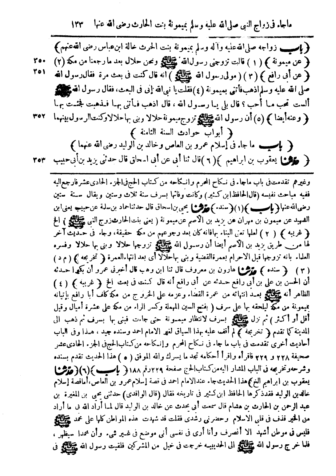 (باب زواجه صلى الله عليه وآله وسلم بميمونة بنت الحرث خالة ابن عباس رضى الله عنهم) (عن ميمونة) (1) قالت تزوجنى رسول الله صلى الله عليه وسلم ونحن حلال بعد ما رجعنا من مكة (2) (عن أبى رافع) (3) (مولى رسول الله صلى الله عليه وسلم) أنه قال كنت في بعث مرة فقال رسول الله صلى الله عليه وسلم اذهب فأتنى بمبمونة (4) فقلت يا نبى الله في البعث، فقال رسول الله صلى الله عليه وسلم ألست تحب ما أحب؟ قال بلى يا رسول الله، قال اذهب فأتنى بها فذهبت فجئت بها (وعنه أيضاً) (5) أن رسول الله صلى الله عليه وسلم تزوج ميمونة حلالاً وبنى بها حلالاً وكنت الرسول بينهما