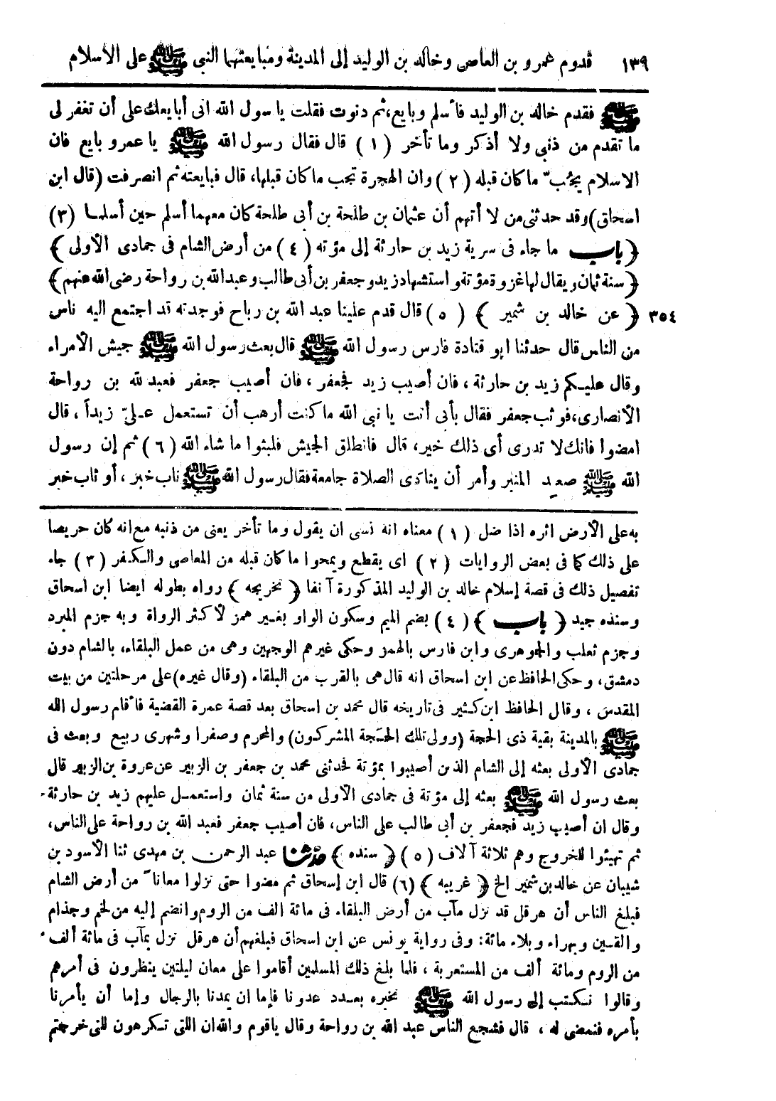 صلى الله عليه وسلم فقدم خالد بن الوليد فأسلم وبايع، ثم دنوت فقلت يا رسول الله انى أبايعك على أن تغفر لي ما تقدم من ذنبى ولا أذكر وما تأخر (1) قال فقال رسول الله صلى الله عليه وسلم يا عمرو بايع فان الاسلام يجُب ما كان قبله (2) وان الهجرة تجب ما كان قبلها، قال فبايعته ثم انصرفت (قال ابن اسحاق) وقد حدثنى من لا أتهم أن عثمان بن طلحةبن أبى طلحة كان معهما أسلم حين أسلما (3) (باب ما جاء في سرية زيد بن حارثة إلى مؤتة (4) من أرض الشام في جمادى الأولى) (سنة ثمان ويقال لها غزوة مؤتة واستشهاد زيد وجعفر بن أبى طالب وعبد الله بن رواحة رضى الله عنهم) (عن خالد بن شمير) (5) قال قدم علينا عبد الله بن رباح فوجدته قد اجتمع اليه ناس من الناس قال حدثنا أبو قتادة فارس رسول الله صلى الله عليه وسلم قال بعث رسول الله صلى الله عليه وسلم جيش الأمراء وقال عليكم زيد بن حارثة، فان أصيب زيد فجعفر، فان أصيب جعفر فعبد لله بن رواحة الأنصارى، فوثب جعفر فقال بأبى أنت يا نبى الله ما كنت أرهب أن تستعمل علىّ زيداً، قال امضوا فانك لا تدرى أى ذلك خير، قال فانطلق الجيش فلبثوا ما شاء الله (6) ثم إن رسول الله صلى الله عليه وسلم صعد المنبر وأمر أن ينادى الصلاة جامعة فقال رسول الله صلى الله عليه وسلم ناب خبر، أو ثاب خبر