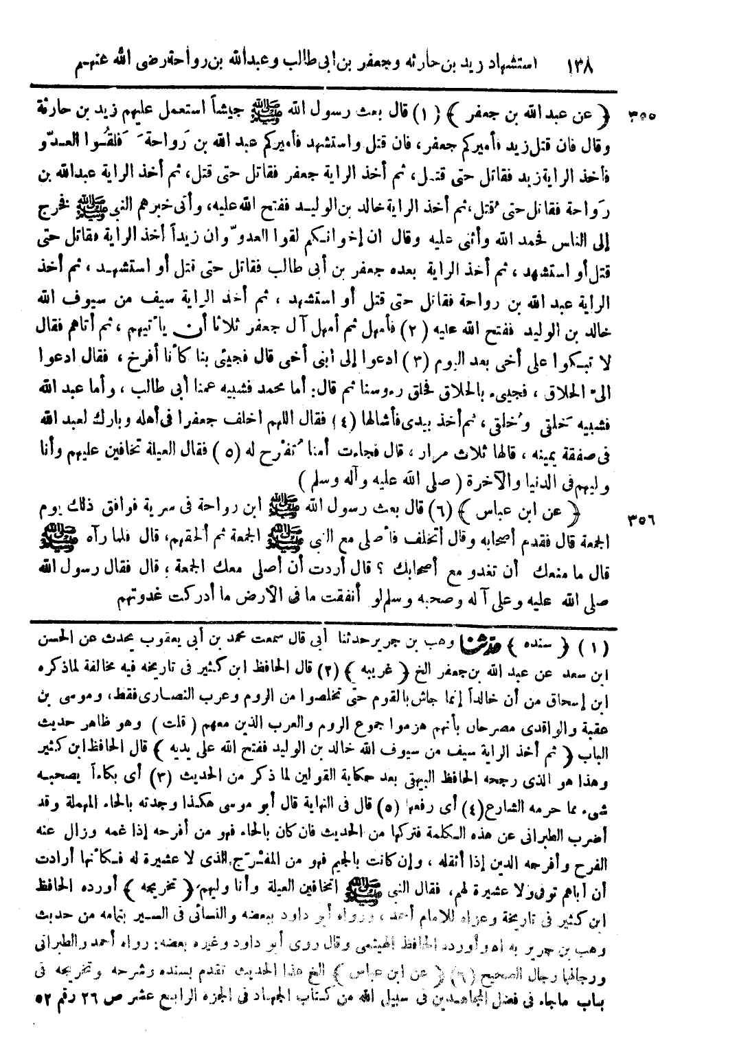 (1) (سنده) حدثنا وهب بن جرير حدثنا أبى قال سمعت محمد بن أبى يعقوب بحدث عن الحسن ابن سعد عن عبد الله بن جعفر الخ (غريبه) (2) قال الحافظ ابن كثير في تاريخه فيه مخالفة لما ذكره ابن إسحاق من أن خالداً إنما جاش بالقوم حتى تخلصوا من الروم وعرب النصارى فقط، وموسى بن عقبة والواقدى مصرحان بأنهم هزموا جموع الروم والعرب الذين معهم (قلت) وهو ظاهر حديث الباب (ثم أخذ الراية سيف من سيوف الله خالد بن الوليد ففتح الله على يديه) قال الحافظ ابن كثير وهذا هو الذي يجحه الحافظ البيهقى بعد حكاية القولين لما ذكر من الحديث (3) أى بكاءاً يصحبه شيء مما حرمه الشارع (4) أيى رفعها (5) قال في النهاية قال أبو موسى هكذا وجدته بالحاء المهملة وقد أضرب الطبرانى عن هذه الكلمة فتركها من الحديث فان كان بالحاء فهو من أفرحه إذا غمه وزال عنه الفرح وأفرجه الدين إذا أثقله، وإن كانت بالجيم فهو من المفرج الذى لا عشيرة له فكأنها أرادت أن أباهم توفى ولا عشيرة لهم، فقال النبى صلى الله عليه وسلم أتخافين العيلة وأنا وليهم (تخريجه) أورده الحافظ ابن كثير في تاريخه وعزاه للامام أ؛ د، ورواه أبو داود ببعضه والنسائى في السير بتمامه من حديث وهب بن جرير به اهـ وأورده الحافظ الهيثمى وقال روى أبو داود وغيره بعضه: رواه أحمد والطبرانى ورجالهما رجال الصحيح (6) (عن ابن عباس) الخ هذا الحديث تقدم بسنده وشرحه وتخريجه في باب ما جاء في فضل المجاهدين في سبيل الله من كتاب الجهاد في الجزء الرابع عشر ص 26 رقم 52