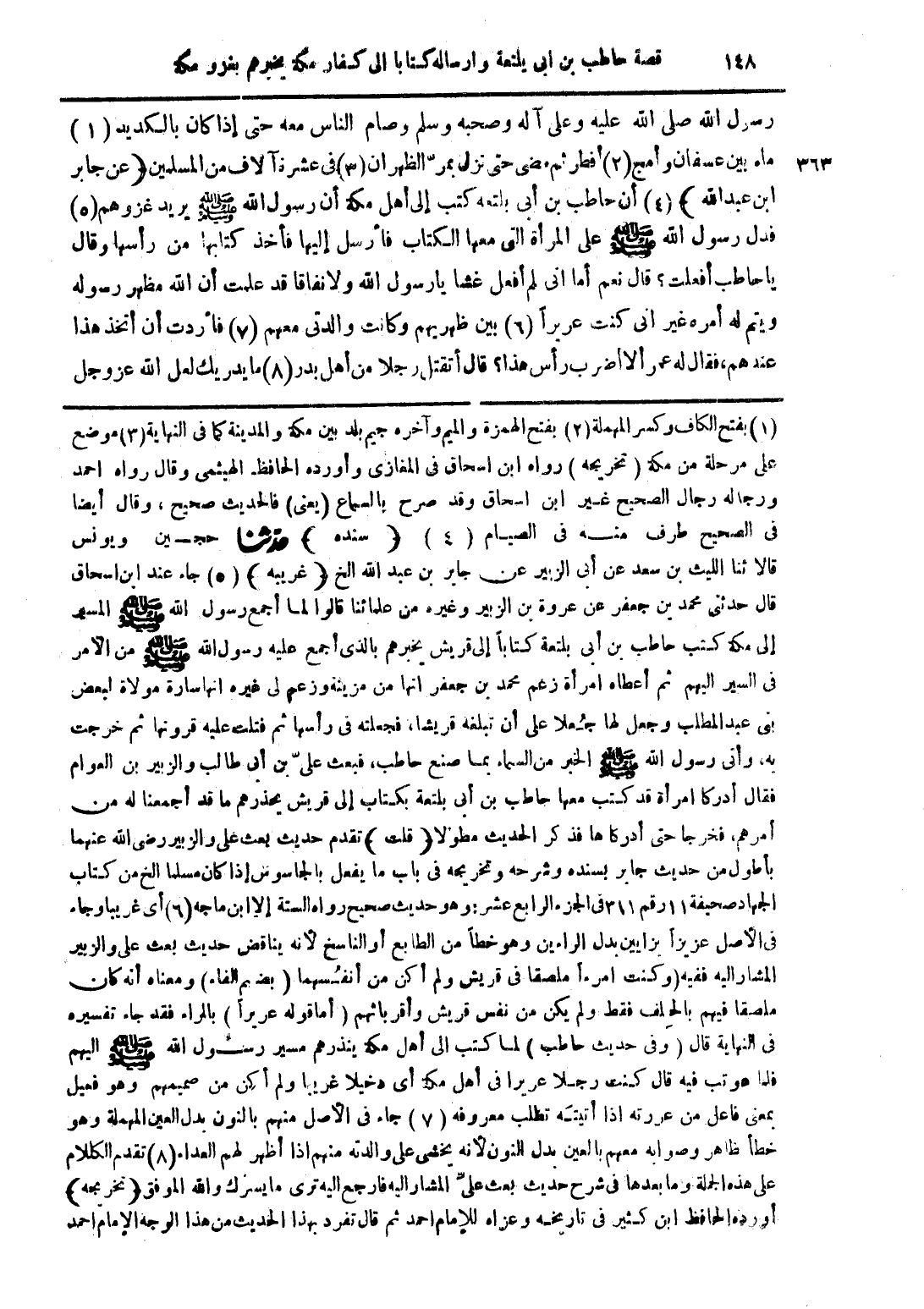 رسول الله صلى الله عليه وعلى آله وصحبه وسلم وصام الناس معه حتى إذا كان بالكديد (1) ماء بين عسفان وأمج (2) أفطر ثم مضى حتى نزل بمرّ الظهران (3) فى عشرة آلاف من المسلمين (عن جابر ابن عبد الله) (4) أن حاطب بن أبى بلتعة كتب إلى أهل مكة أن رسول الله صلى الله عليه وسلم يريد غزوهم (5) فدل رسول الله صلى الله عليه وسلم على المرأة التي معها الكتاب فأرسل إليها فأخذ كتابها من رأسها وقال يا حاطب أفعلت؟ قال نعم أما انى لم أفعل غشاً يا رسول الله ولا نفاقاً قد علمت أن الله مظهر رسوله ويتم له أمره غير أنى كنت عريراً (6) بين ظهريهم وكانت والدتى معهم (7) فأردت أن اتخذ هذا عندهم، فقال له عمر ألا اضرب رأس هذا؟ قال أتقتل رجلاً من أهل بدر (8) ما يدريك لعل الله عز وجل
