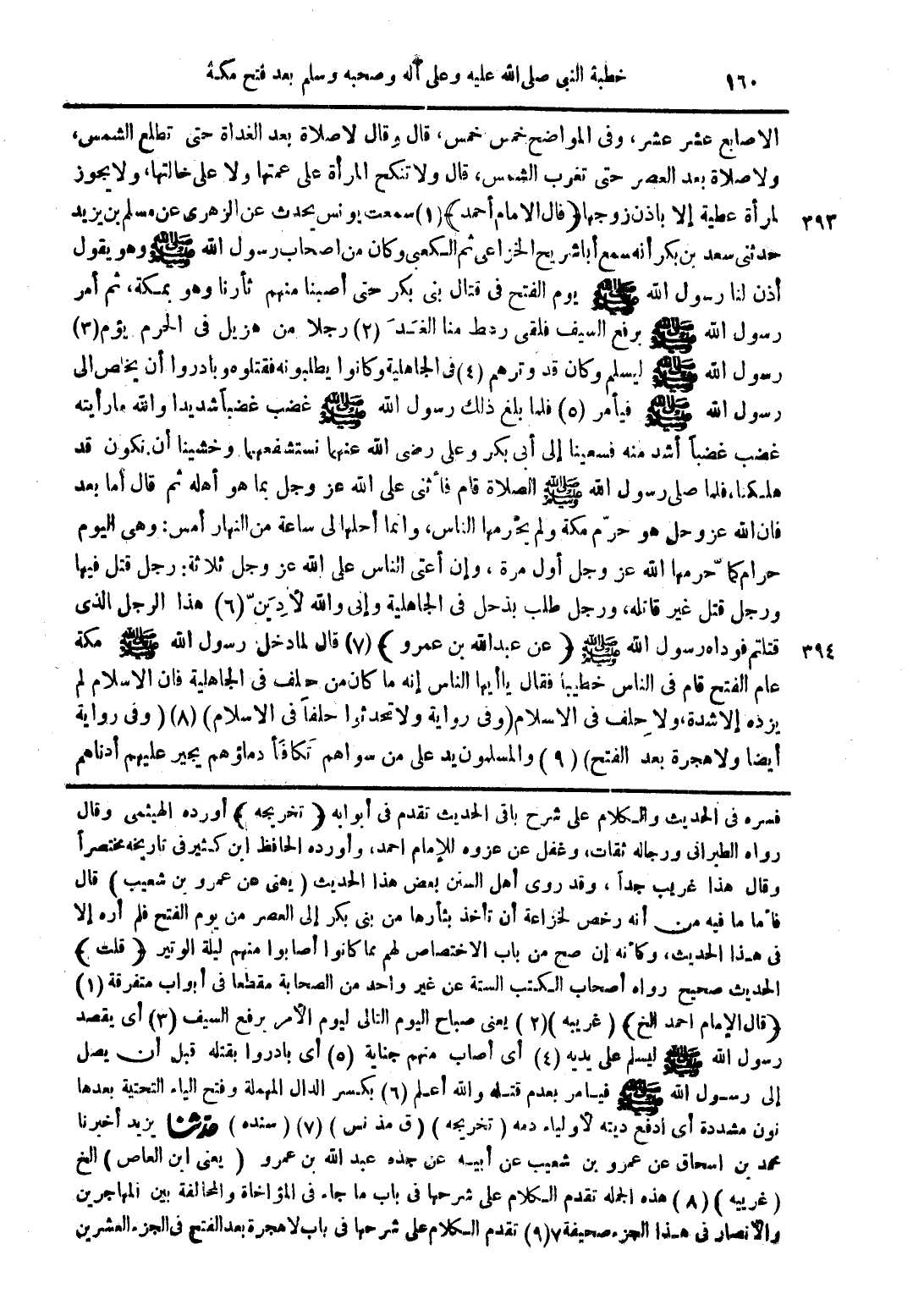 الأصابع عشر عشر، وفى المواضح خمس خمس، قال وقال لا صلاة بعد الغداة حتى تطلع الشمس، ولا صلاة بعد العصر حتى تغرب الشمس، قال ولا تنكح المرأة على عمتها ولا على خالتها، ولا يجوز لمرأة عطية إلا باذن زوجها (قال الامام أحمد) (1) سمعت يونس يحدث عن الزهرى عن مسلم بن يزيد حدثنى سعد بن بكر أنه سمع أبا شريح الخزاعي ثم الكعبى وكان من أصحاب رسول الله صلى الله عليه وسلم وهو يقول أذن لنا رسول الله صلى الله عليه وسلم يوم الفتح في قتال بنى بكر حتى أصبنا منهم ثأرنا وهو بمكة، ثم أمر رسول الله صلى الله عليه وسلم برفع السيف فلقى رهط منا الغَدَ (2) رجلاً من هزيل في الحرم يؤم (3) رسول الله صلى الله عليه وسلم ليسلم وكان قد وترهم (4) في الجاهلية وكانوا يطلبونه فقتلوه وبادروا أن يخلص الى رسول الله صلى الله عليه وسلم فيأمر (5) فلما بلغ ذلك رسول الله صلى الله عليه وسلم غضب غضباً شديداً والله ما رأيته غضب غضباً أشد منه فسعينا إلى أبى بكر وعلى رضى الله عنهما نستشفعهما وخشينا أن نكون قد هلكنا، فلما صلى رسول الله صلى الله عليه وسلم الصلاة قام فأثنى على الله عز وجل بما هو أهله ثم قال أما بعد فان الله عز وجل هو حرّم مكة ولم يحرّمها الناس، وانما أحلها لى ساعة من النهار أمس: وهي اليوم حرام كما حرمها الله عز وجل أول مرة، وإن أعتى الناس على الله عز وجل ثلاثة: رجل قتل فيها ورجل قتل غير قاتله، ورجل طلب بذحل في الجاهلية وإنى والله لأدين (6) هذا الرجل الذى قتلتم فواده رسول الله صلى الله عليه وسلم (عن عبد الله بن عمرو) (7) قال لما دخل رسول الله صلى الله عليه وسلم مكة عام الفتح قام في الناس خطيباً فقال يا أيها الناس إنه ما كان من حلف في الجاهلية فان الاسلام لم يزده إلا شدة، ولا حِلف في الاسلام (وفى رواية ولا تحدثوا حلفاً في السلام) (8) (وفى رواية أيضاً ولا هجرة بعد الفتح) (9) والمسلمون يد على من سواهم تكافأ دماؤهم يجير عليهم أدناهم