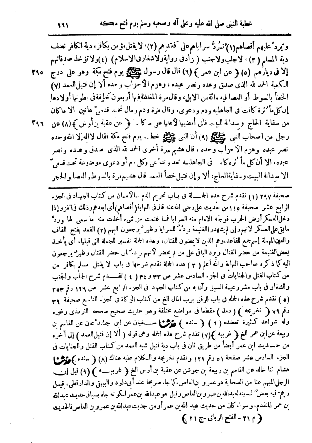 396 (عن عقبة بن أوس) (8) عن رجل من أصحاب النبي صلى الله عليه وسلم (9) أن النبي صلى الله عليه وسلم خطب يوم فتح مكة فقال لا إله إلا الله وحده نصر عبده وهزم الأحزاب وحده، قال هشيم مرة أخرى الحمد لله الذي صدق وعده ونصر عبده، ألا إن كل مأثُرة كانت في الجاهلية تعد وتدّعى وكل دم أو دعوى موضوعة تحت قدميّ إلا سِدانة البيت وسقاية الحاج، ألا وإن قتيل خطأ العمد قال هشيم مرة بالسوط والعصا والحجر
