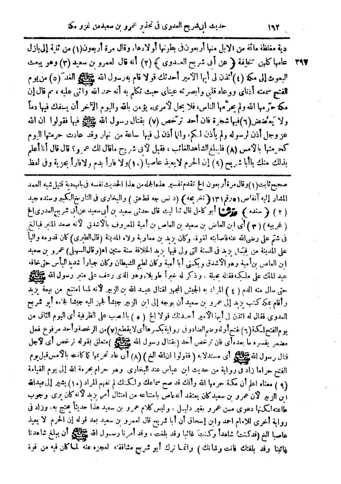 صحيح ثابت (1) وقال مرة أربعون إلخ تقدم تفسير هذه الجملة من هذا الحديث نفسه في باب دية قتيل شبه العمد المشار إليه آنفًا ص 51 رقم 131 (تخريجه) (د نس جه قط هق) والبخاري في التاريخ الكبير وسنده جيد (2) (سنده) حدّثنا أبو كامل قال ثنا ليث قال حدثني سعيد بن أبي شريح العدري إلخ (غريبه) (3) أي ابن العاص بن سعيد بن العاص بن أمية المعروف الأشدق لأنه صعد المنبر فبالغ في شتم علي رضي الله عنه فأصابته لقوة: وكان يزيد بن معاوية ولاه المدينة (قال الطبري) كان قدومه واليًا على المدينة من قِبَل يزيد في السنة التي ولي فيها يزيد الخلافة سنة ستين اهـ (وقال السهيلي) عمرو بن سعيد بن العاص بن أمية وهو الأشدق ويكنى أبا أمية وكان لطيم الشيطان وكان جبارًا شديد البأس حتى خافه عبد الملك على ملكه فقتله بحيلة، وذكر له خبرًا طويلاً، وهو الذي رعف على منبر رسول الله صلى الله عليه وسلم حتى سال منه الدم (4) المراد به الجيش المجهز لقتال عبد الله بن الزبير لأنه لما امتنع من بيعة يزيد وأقام بمكة كتب يزيد إلى عمرو بن سعيد أن يوجه إلى ابن الزبير جيشًا فجهز إليه جيشًا فجاءه أبو شريح العدوي فقال له ائذن لي أيها الأمير أحدثك قولاً إلخ (5) بالنصب على الظرفية أي اليوم الثاني من يوم الفتح لمكة (6) بفتح أوله وضم الضاد وفي رواية بكسرها أي لا يقطع (7) من الرخصة وأحد مرفوع بفعل مضمر يفسره ما بعده أي فإن ترخص أحد (بقتال رسول الله صلى الله عليه وسلم) متعلق بقوله ترخص أي لأجل قتال رسول الله صلى الله عليه وسلم أي مستدلاًّ به (فقولوا إن الله إلخ) (8) أي عاد تحريمها كما كانت بالأمس قبل يوم الفتح حرامًا زاد في رواية من حديث ابن عباس عند البخاري وهو حرام بحرمة الله إلى يوم القيامة (9) معناه اعلم أن مكة حرمها الله وأنك قد صح سماعك ولكنك لم تفهم المراد (10) يشير إلى عبد الله بن الزبير لأن عمرو بن سعيد كان يعتقد أنه عاصٍ بامتناعه عن امتثال أمر يزيد لأنه كان يرى وجوب طاعته لكنها دعوى من عمرو بغير دليل، وليس كلام عمرو بن سعيد هذا حديثًا يحتج به، وزاد في رواية أخرى الإمام أحمد وابن إسحاق أن أبا شريح قال لعمرو بن سعيد بعد قوله إن الحرم لا يعيذ عاصيًا إلخ (قد كنتُ شاهدًا وكنتَ غائبًا وقد بلغت، وقد أمرنا رسول الله صلى الله عليه وسلم أن يبلغ شاهدنا غائبنا وقد بلغتك فأنت وشأنك) وإنما ترك أبو شريح مشاققته لعجزه عنه لما كان فيه من قوة