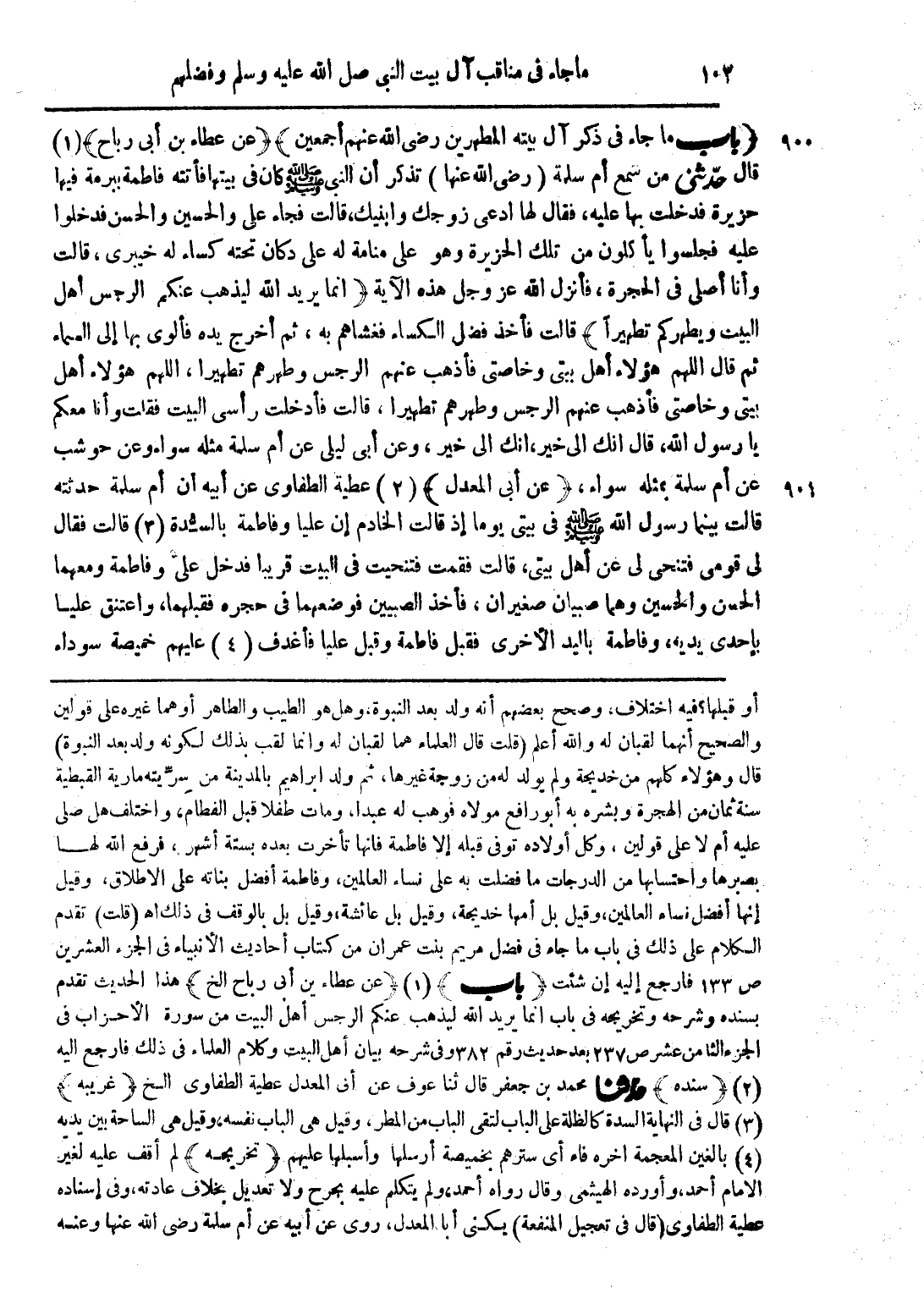 (باب ما جاء فى ذكر آل بيته المطهرين رضى الله عنهم أجمعين) (عن عطاء بن أبى رباح) قال حدّثنى من سمع أم سلمة (رضى الله عنها) تذكر أن النبى صلى الله عليه وسلم كان فى بيتها فأتته فاطمة ببرمة فيها حزيرة فدخلت بها عليه، فقال لها ادعى زوجك وابنيك، قالت فجاء على والحسين والحسن فدخلوا عليه فجلسوا يأكلون من تلك الحزيرة وهو على منامة له على دكان تحته كساء له خيبرى، قالت وأنا أصلى فى الحجرة، فأنزل الله عز وجل هذه الآية {انما يريد الله ليذهب عنكم الرجس أهل البيت ويطهركم تطهيرا} قالت فأخذ فضل الكساء فغشاهم به، ثم أخرج يده فألوى بها إلى السماء ثم قال اللهم هؤلاء أهل بيتى وخاصتى فأذهب عنهم الرجس وطهرهم تطهيرا، اللهم هؤلاء أهل بيتى وخاصتى فأذهب عنهم الرجس وطهرهم تطهيرا، قالت فأدخلت رأسى البيت فقلت وأنا معكم يا رسول الله، قال انك الى خير، انك الى خير، وعن أبى ليلى عن أم سلمة مثله سواء وعن حوشب عن أم سلمة بمثله سواء، (عن أبى المعدل) عطية الطفاوى عن أبيه أن أم سلمة حدثته قالت بينما رسول الله صلى الله عليه وسلم فى بيتى يوما إذ قالت الخادم إن عليا وفاطمة بالسُّدة قالت فقال لى قومى فتنحى لى عن أهل بيتي، قالت فقمت فتنحيت فى البيت قريبا فدخل على وفاطمة ومعهما الحسن والحسين وهما صبيان صغيران، فأخذ الصبيين فوضعهما فى حجرة فقبلهما، واعتنق عليا بإحدى يديه، وفاطمة باليد الأخرى فقبل فاطمة وقبل عليا فأغدف عليهم خميصة سوداء