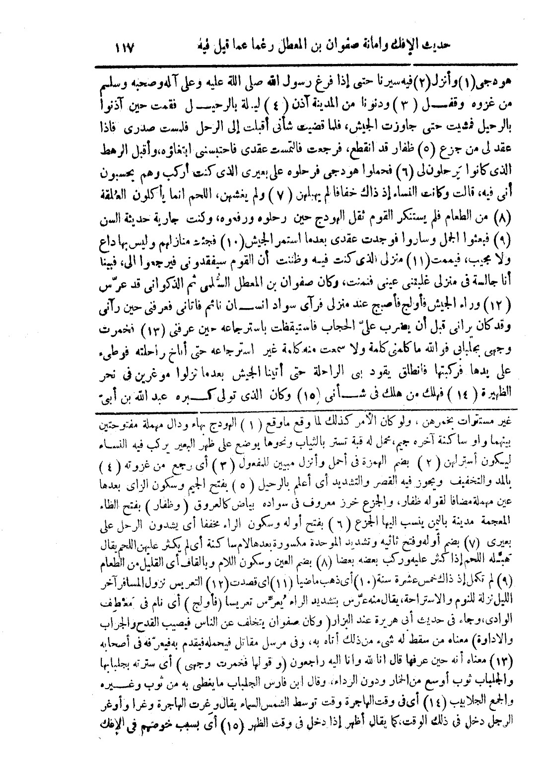 غير مستترات بخمرهن، ولو كان الأمر كذلك لما وقه ما وقع (1) الهودج بها ودال مهملة مفتوحتين بينهما واو ساكنة آخره جيم، محمل له قبة تستر بالثياب ونحوها يوضع على ظهر البعير يركب فيه النساء ليكون أسترلهن (2) بضم الهمزة فى أحمل وأنزل مبيين المفعول (3) أى رجع من غزوته (4) بالمد والتخفيف ويجوز فيه القصر والتشديد أى أعلم بالرحيل (5) بفتح الجيم وسكون الزاى بعدها عين مهملة مضافا لقوله ظفار، والجزع خرز معروف فى سواده بياض كالعروق (وظفار) بفتح الظاء المعجمة مدينة باليمن ينسب اليها الجزع (6) بفتح أوله وسكون الراء مخففا أى يشدون الرحل على بعيرى (7) بضم أوله وفتح ثانيه وتشديد الموحدة مكسورة بعدها لام ساكنة أى لم يكثر عليهن اللحم يقال هبَّله اللحم إذا كثر عليه وركب بعضه بعضا (8) بضم العين وسكون اللام وبالقاف أى القليل من الطعام (9) لم تكمل إذ ذاك خمس عشرة سنة (10) أى ذهب ماضيا (11) اى قصدت (12) التعريس تزول المسافر آخر الليل نزلة للنوم والاستراحة، يقال منه عرّس بتشديد الراء يُعرِّس تعريسا (فأولج) أى نام فى معطف الوادى، وجاء فى حديث أبى هريرة عن البزار (وكان صفوان يتخلف عن الناس فيصيب القدح والجراب والادارة) معناه من سقط له شئ من ذلك أتاه به، وفى مرسل مقاتل فيحمله فيقدم به فيعرّفه فى أصحابه (13) معناه أنه حين عرفها قال انا لله وانا اليه راجعون (وقولها فخمرت وجهى) أى سترته بجلبابها والجلباب ثوب أوسع من الخمار ودون الرداء، وقال ابن فارس الجلباب ما يغطى به من ثوب وغيره والجمع الجلابيب (14) أى فى وقت الهاجرة وقت توسط الشمس السماء يقال وغِرت الهاجرة وغرا وأوغر الرجل دخل فى ذلك الوقت، كما يقال أظهر إذا دخل فى وقت الظهر (15) أى بسبب خوضهم في الإفك