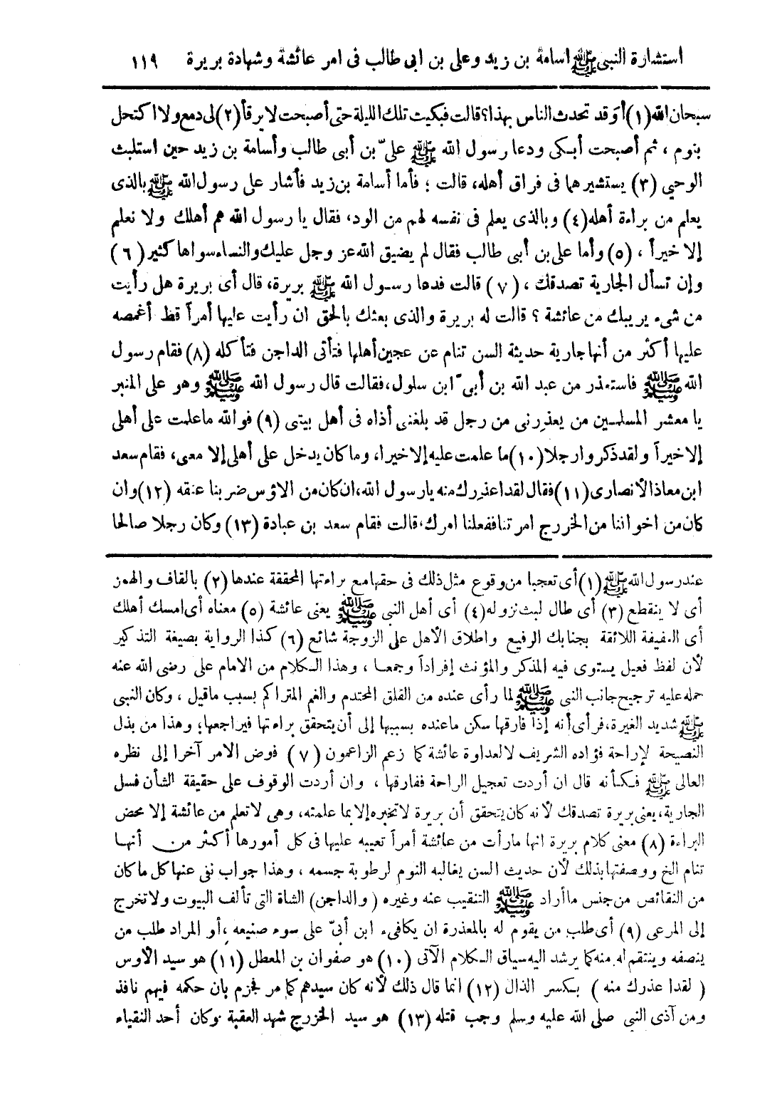 عند رسول الله صلى الله عليه وسلم أى تعجبا من وقوع مثل ذلك فى حقها مع براءتها المحققة عندها (2) بالقاف والهمز أى لا ينقطع (3) أى طال لبث نزوله (4) أى أهل النبى صلى الله عليه وسلم يعنى عائشة (5) معناه أى امسك أهلك أى العفيفة اللائقة بجنابك الرفيع واطلاق الأهل على الزوجة شائع (6) كذا الرواية بصيغة التذكير لأن لفظ فعيل يسوى فيه المذكر والمؤنث إفرادًا وجمعا، وهذا الكلام من الامام على رضى الله عنه حمله عليه ترجيح جانب النبى صلى الله عليه وسلم لما راى عنده من القلق المحتدم والغم المتراكم بسبب ما قيل، وكان النبى صلى الله عليه وسلم شديد الغيرة، فرأى أنه إذا فارقها سكن ما عنده بسببها إلى أن يتحقق براءتها فيراجعها؛ وهذا من بذل النصيحة لإراحة فؤاده الشريف لا لعداوة عائشة كما زعم الزاعمون (7) فوض الامر آخرا إلى نظره العلى صلى الله عليه وسلم فكأنه قال ان أردت تعجيل الراحة ففارقها، وان أردت الوقوف على حقيقة الشأن فسل الجارية، يعنى بريرة تصدقك لأنه كان يتحقق أن بريرة لا تخبره إلا بما علمته، وهى لا تعلم من عائشة إلا محض البراءة (8) معنى كلام بريرة انها ما رأت من عائشة أمرًا تعيبه عليها فى كل أمورها أكثر من أنها تنام الخ ووصفتها بذلك لأن حديث السن يغالبه النوم لرطوبة جسمه، وهذا جواب نفى عنها كل ما كان من النقائص من جنس ما أراد صلى الله عليه وسلم التنقيب عنه وغيره (والداجن) الشاة التى تألف البيوت ولا تخرج إلى المرعى (9) أى طلب من يقوم له بالمعذرة ان يكافئ ابن أبىّ على سوء صنيعه، أو المراد طلب من ينصفه وينتقم له منه كما يرشد اليه سياق الكلام الآتى (10) هو صفوان بن المعطل (11) هو سيد الأوس (لقد اعذرك منه) لكسر الذال (12) انما قال ذلك لأنه كان سيدهم كما مر فجزم بان حكمه فيهم نافذ ومن آذى النبى صلى الله عليه وسلم وجب قتله (13) هو سيد الخزرج شهد العقبة وكان أحد النقباء