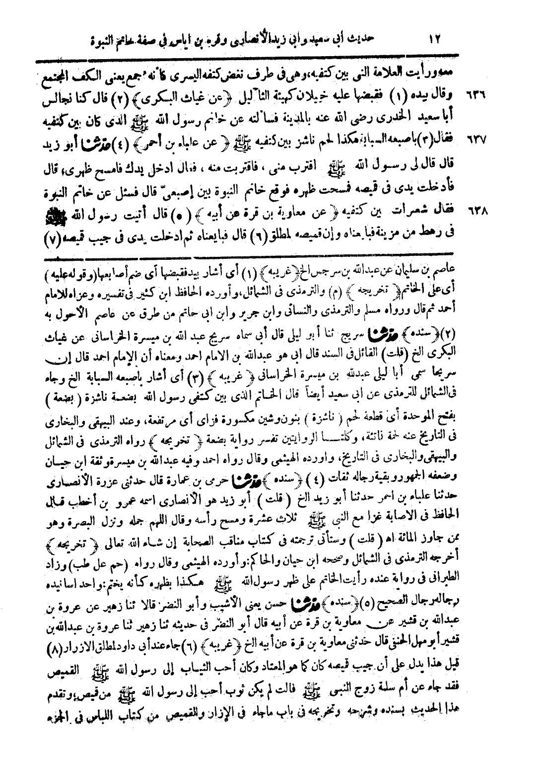 عاصم بن سليمان عن عبد الله بن سرجس الخ (غريبة) (1) أي أشار بيد فقبضها أي ضم أصابعها (وقوله علي) أي على الخاتم (تخريجه) (م) والترمذي في الشمائل، وأورده الحافظ ابن كثير في تفسيره وعزاه للإمام أحمد ثم قال ورواه مسلم والترمذي والنسائي وابن جرير وابن أبي حاتم من طرق عن عاصم الأحول به (2) (سنده) حدثنا سريج ثنا أبو ليلى قال أبي سماه سريج عبد الله بن ميسرة الخراساني عن غياث البكري الخ (قلت) القائل في السند قال أبي هو عبد الله بن الإمام أحمد ومعناه أن الإمام أحمد قال إن سريجا سمى أبا ليلى عبد لله بن ميسرة الخراساني (غريبة) (3) أي أشار بأصبعه السبابة الخ وجاء في الشمائل للترمذي عن أبي سعيد أيضًا قال الخاتم الذي بين كتفى رسول الله بضعة ناشزة (بضعة) بفتح الموحدة أي قطعة لحم (ناشزة) بنون وشين مكسورة فزاى أي مرتفعة، وعند البيهقي والبخاري في التاريخ عنه لحمة ناتئة، وكلتا الروايتين تفسر رواية بضعة (تخريجه) رواه الترمذي في الشمائل والبيهقي والبخاري في التاريخ، واورده الهيثمى وقال رواه أحمد وفيه عبد الله بن ميسرة وثقة ابن حيان وضعفه الجمهور وبقية رجاله ثقات (4) (سنده) حدثنا حرمى بن عمارة قال حدثني عزرة الأنصاري حدثنا علباء بن أحمر حدثنا أبو زيد الخ (قلت) أبو زيد هو الأنصاري اسمه عمرو بن أخطب قال الحافظ في الأصابة غزا مع النبي صلى الله عليه وسلم ثلاث عشرة وسمح رأسه وقال اللهم جمله ونزل البصرة وهو ممن جاوز المائة اهـ (قلت) وستأتي ترجمته في كتاب مناقب الصحابة إن شاء الله تعالى (تخريجه) أخرجه الترمذي في الشمائل وصححه ابن حيان والحاكم: وأورده الهيثمي وقال رواه (حم عل طب) وزاد الطبراني في رواية عنده رأيت الخاتم على ظهر رسول الله صلى الله عليه وسلم هكذا بظهره كأنه يختم: واحد أسانيده رجاله رجال الصحيح (5) (سنده) حدثنا حسن يعنى الأشيب وأبو النضر قالا ثنا زهير عن عروة بن عبد الله بن قشير عن معاوية بن قرة عن أبيه قال أبو النضر في حديثه ثنا زهير ثنا عروة بن عبد الله بن قشير أبو مهل الحنفي قال حدثني معاوية بن قرة عن أبيه الخ (غريبة) (6) جاء عند أبي داود لمطلق الازرار (8) قبل هذا يدل على أن جيب قميصه كان كما هو المعتاد وكان أحب الثياب إلى رسول الله صلى الله عليه وسلم القميص فقد جاء عن أم سلمة زوج النبي صلى الله عليه وسلم قالت لم يكن ثوب أحب إلى رسول الله صلى الله عليه وسلم من قميص؛ وتقدم هذا الحديث بسنده وشرحه وتخريجه في باب ما جاء في الإزار والقميص من كتاب اللباس في الجزء