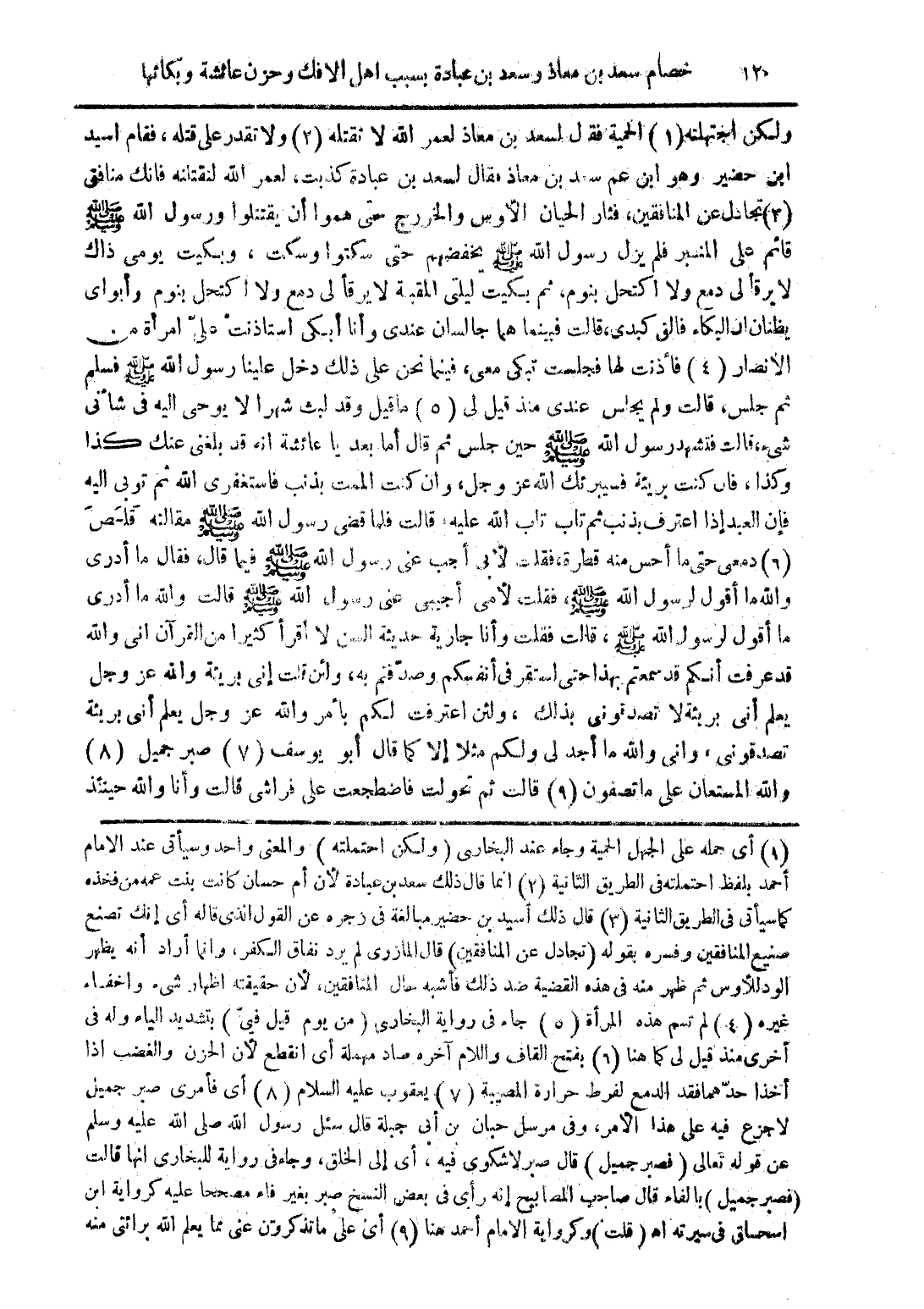 (1) أي حمله على الجهل الحمية وجاء عند البخارى (ولكن احتملته) والمعنى واحد وسيأتى عند الامام أحمد بلفظ احتملته فى الطريق الثانية (2) انما قال ذلك سعد بن عبادة لأن أم حسان كانت بنت عمه من فخذه كما سيأتى فى الطريق الثانية (3) قال ذلك أسيد بن حضير مبالغة فى زجره عن القول الذى قاله أى إنك تصنع صنيع المنافقين وفسره بقوله (تجادل عن المنافقين) قال المازوى لم يرد نفاق الكفر، وانما أراد انه يظهر الود للأوس ثم ظهر منه فى هذه القضية ضد ذلك فأشبه حال المنافقين، لأن حقيقته اظهار شئ واخفاء غيره (4) لم تسم هذه المرأة جاء فى رواية البخارى (من يوم قيل فيّ) بتشديد الياء وله فى أخرى منذ قيل لى كما هنا (6) بفتح القاف واللام آخره صاد مهملة أى انقطع لأن الحزن والغضب إذا أخذا حدّهما فقد الدمع لفرط حرارة المصيبة (7) يعقوب عليه السلام (8) أى فأمرى صبر جميل لا جزع فيه على هذا الأمر، وفى مرسل حبان بن أبى جبلة قال سئل رسول الله صلى الله عليه وسلم عن قوله تعالى {فصبر جميل} قال صبر لا شكوى فيه، أى إلى الخلق، وجاء فى رواية للبخارى انها قالت (فصبر جميل) بالفاء قال صاحب المصابيح إنه رأى فى بعض النسخ صبر بغير فاء مصححا عليه كرواية ابن اسحاق فى سيرته اهـ (قلت) وكراوية الامام أحمد هنا (9) أى على ما تذكروّن عنى مما يعلم الله براءتي منه