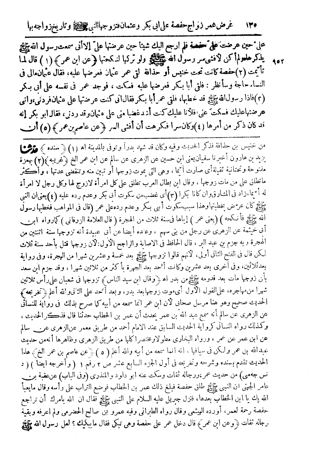 علي حين عرضت علىّ حفصة فلم ارجع اليك شيئا حين عرضتها علىّ إلا أنى سمعت رسول الله صلى الله عليه وسلم يذكر هلمو لم أكن لأفشى سر رسول الله صلى الله عليه وسلم ولو تركها لنكحتها (عن ابن عمر) (1) قال لما تايّمت (2) حفصة كانت تحت خنيس أو حذافة لقى عمر عثمان فعرضها عليه، فقال عثمان مالى فى النساء حاجة وسأنظر: فلقى أبا بكر فعرضها عليه فسكت، فوجد عمر فى نفسه على أبى بكر (3) فاذا رسول الله صلى الله عليه وسلم قد خطبها فلقى عمل أبا بكر فقال انى كنت عرضتها على عثمان فردنى، وانى عرضتها عليك فسكت عنى فلأنا عليك كنت أشد غضبا منى على عثمان وقد ردنى، فقال ابو بكر إنه قد كان ذكر من أمرها وكان سرا (4) فكرهت أن أفشى السر (عن عاصم بن عمر) (5) أن