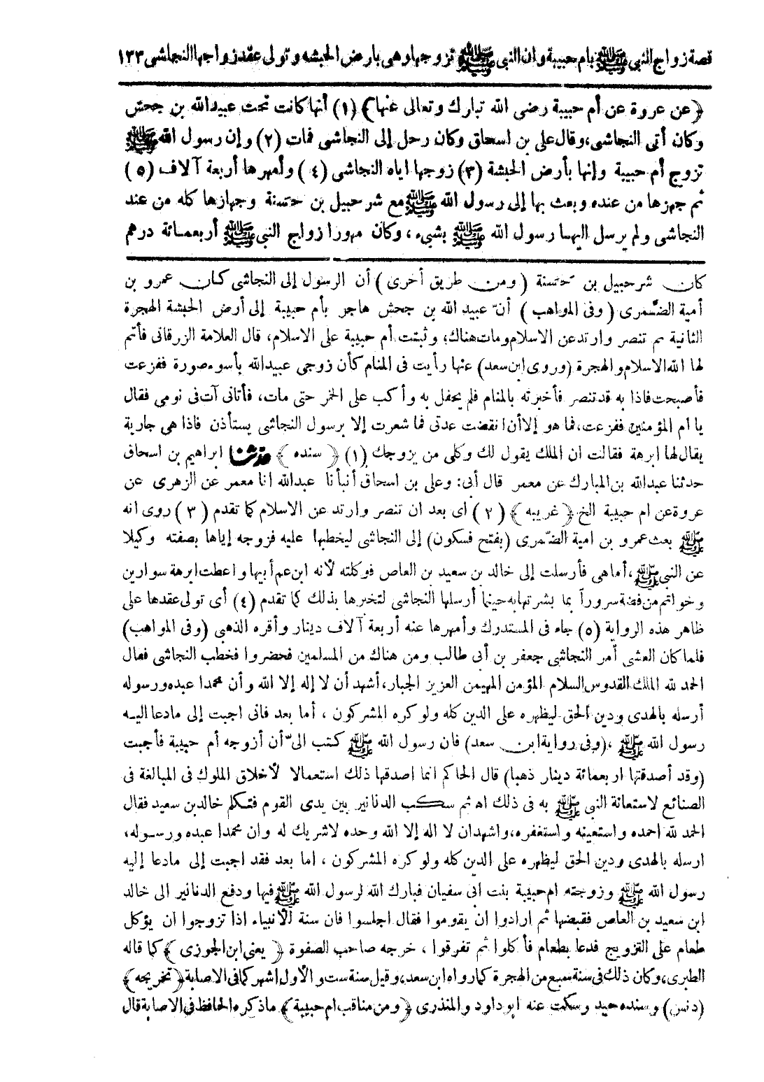 (عن عروة عن أم حبيبة رضى الله تبارك وتعالى عنها) (1) أنها كانت تحت عبيد الله بن جحش وكان أتى النجاشى، وقال على بن اسحاق وكان رحل إلى النجاشى فمات (2) وإن رسول الله صلى الله عليه وسلم تزوج أم حبيبة وإنها بأرض الحبشة (3) زوجها اياه النجاشى (4) وأمهرها أربعة آلاف (5) ثم جهزها من عنده وبعث بها إلى رسول الله صلى الله عليه وسلم معشرحبيل بن حسنة وجهازها كله من عند النجاشى ولم يرسل إليها رسول الله صلى الله عليه وسلم بشيء، وكان مهورا زواج النبى صلى الله عليه وسلم أربعمائة درهم