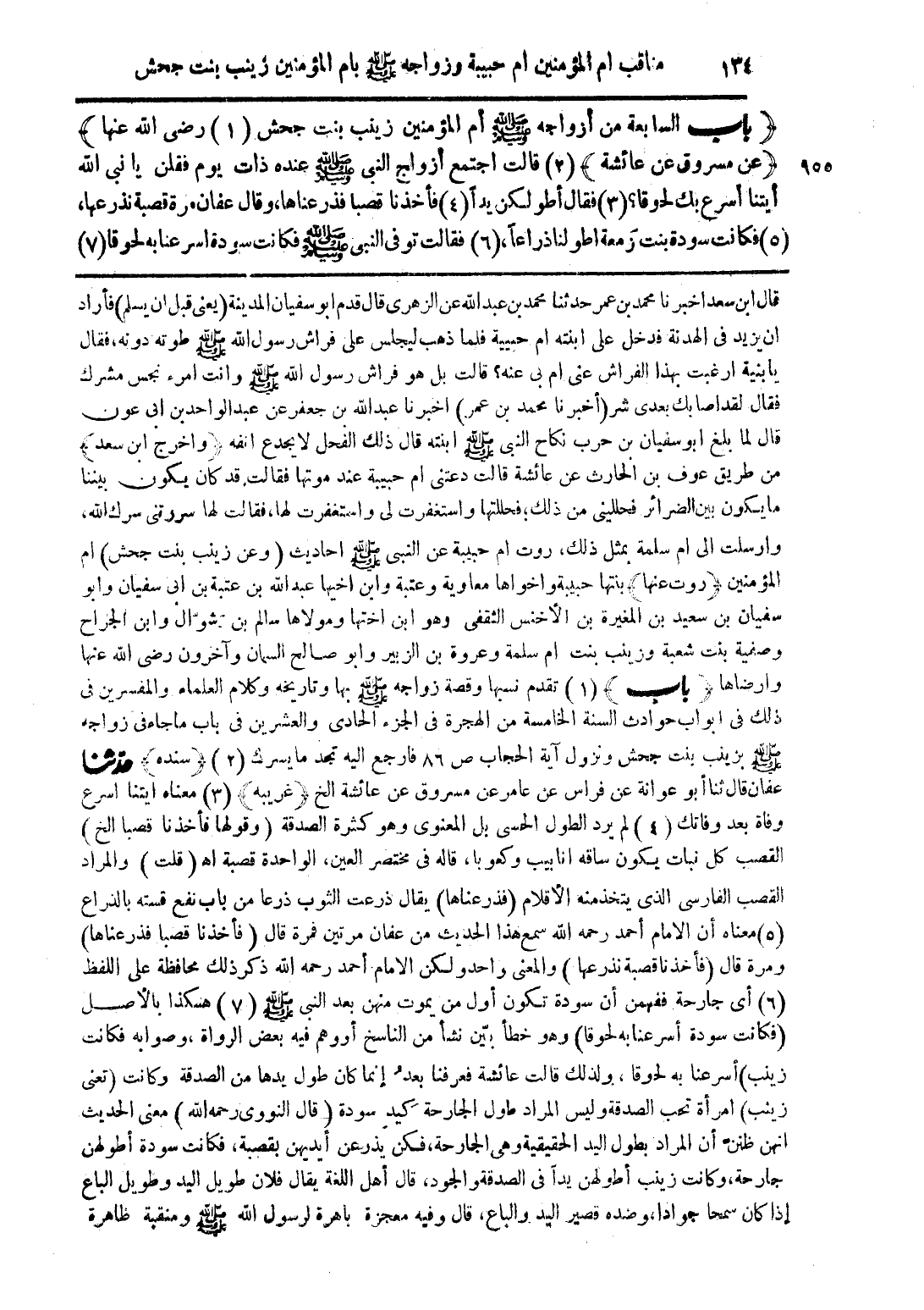 (باب السابعة من أزواجه صلى الله عليه وسلم أم المؤمنين زينب بنت جحش (1) رضى الله عنها) (عن مسروق عن عائشة) (2) قالت اجتمع أزواج النبى صلى الله عليه وسلم عنده ذات يوم فقلن يا نبى الله ايتنا أسرع بك لحوقا؟ (3) فقال أطولكن يداً (4) فأخذنا قصبا فذرعناها، وقال عفان مرة قصبة نذرعها، (5) فكانت سودة بنت زمعة لنا ذراعاً (6) فقالت توفى النبى صلى الله عليه وسلم فكانت سودة أسرعنا به لحوقا (7)