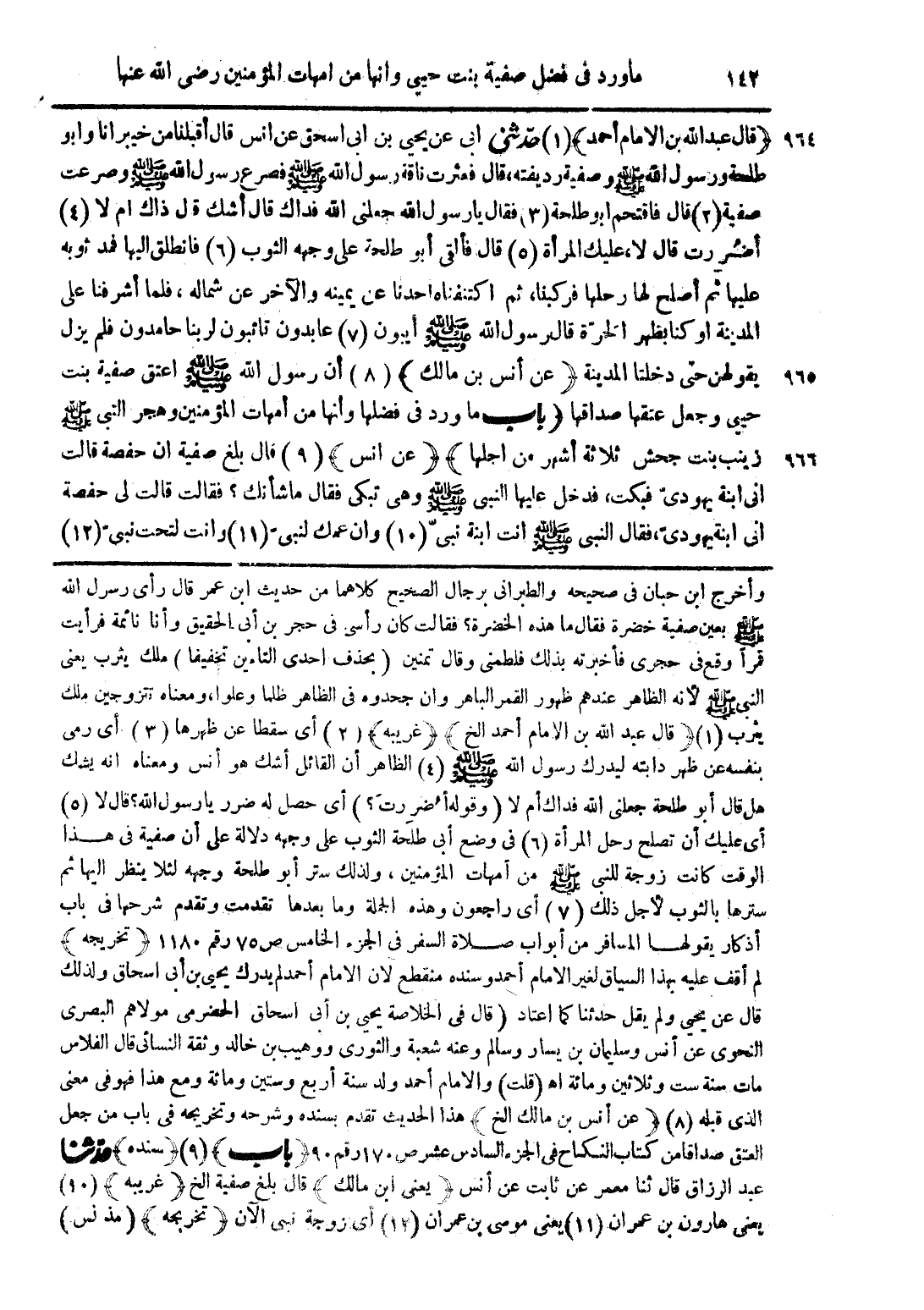 (قال عبد الله بن الإمام أحمد) (1) حدّثنى ابى عن يحيى بن ابى اسحق عن انس قال أقبلنا من خيبر انا وابو طلحة ورسول الله صلى الله عليه وسلم وصفية (2) ديفته، قال فعثرت ناقة رسول الله صلى الله عليه وسلم فصرع رسول الله صلى الله عليه وسلم وصرعت صفية قال فاقتحم ابو طلحة (3) فقال يا رسول الله جعلنى الله فداك قال أشك قال ذاك أم لا (4) أضررت قال لا، عليك المرأة (5) قال فألقى أبو طلحة على وجهه الثوب (6) فانطلق اليها فمد ثوبه عليها ثم أصلح لها رحلها فركبنا، ثم اكتنفناه احدنا عن يمينه والآخر عن شماله، فلما أشرفنا على المدينة أو كنا بظهر الحرّة قال رسول الله صلى الله عليه وسلم أيبون (7) عابدون تائبون لربنا حامدون فلم يزل بقولهن حتى دخلتا المدينة (عن أنس بن مالك) (8) أن رسول الله صلى الله عليه وسلم اعتق صفية بنت حيى وجعل عتقها صداقها (باب ما ورد من فضلها وأنها من امهات المؤمنين وهجر النبى صلى الله عليه وسلم زينب بنت جحش ثلاثة أشهر من اجلها) (عن انس) (9) قال بلغ صفية أن حفصة قالت انى ابنة يهودى فبكت، فدخل عليها النبى صلى الله عليه وسلم وهى تبكى فقال ما شأنك؟ فقالت قالت لى حفصة انى ابنة، فقال النبة صلى الله عليه وسلم أنت ابنة نبىّ (10) وان عمك لنبىّ (11) وانت لتحت نبي (12)
