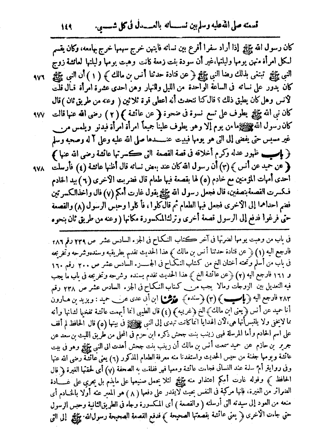كان رسول الله صلى الله عليه وسلم إذا أراد سفرا أقرع بين نسائه فايتهن خرج سهمها خرج بها معه، وكان يقسم لكل امرأة منهن يومها وليلتها، غير أن سودة بنت زمعة كانت وهبت يومها وليلتها لعائشة زوج النبى صلى الله عليه وسلم تبتغى بذلك رضا النبى صلى الله عليه وسلم (عن قتادة حدثنا أنس بن مالك) (1) أن النبى صلى الله عليه وسلم كان يدور على نسائه فى الساعة الواحدة من الليل والنهار وهن احدى عشرة امرأة قال قلت لأنس وهل كان يطيق ذلك؟ قال كنا نتحدث أنه اعطى قوة ثلاثين (وعنه من طريق ثان) قال كان نبى الله صلى الله عليه وسلم يطوف على تسع نسوة فى ضحوة (عن عائشة) (2) رضى الله عنها قالت كتان رسول الله صلى الله عليه وسلم ما من يوم إلا وهو يطوف علينا جميعاً امرأة امرأة فيدنو ويلمس من غير مسيس حتى يفضى إلى التى هو يومها فيبيت عندها صلى الله عليه وسلم وعلى آله وصحبه وسلم (باب ظهور عجله وكرم أخلاقه فى قصة القصعة التى كسرتها عائشة رضى الله عنها) (عن حميد عن أنس) (3) أن رسول الله كان عند بعض نسائه قال أظنها عائشة (4) فأرسلت أحدى أمهات المؤمنين مع خادم (5) لها بقصعة فيها طعام فضربت الأخرى (6) بيد الخادم فكسرت القصعة بنصفين، قال فجعل رسول الله صلى الله عليه وسلم يقول غارت أمكم (7) قال واخد الكسرتين فضم احداهما إلى الأخرى فجعل فيها الطعام ثم قال طلوا، فأكلوا وحبس الرسول (8) والقصعة حتى فرغوا فدفع إلى الرسول قصعة أخرى وترك المكسورة مكانها (وعنه من طريق ثان بنحوه