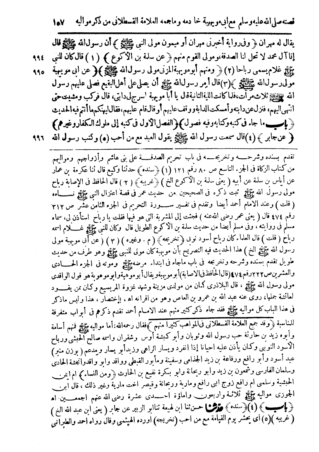 يقال له مهران (وفى رواية أخبرنى مهران أو ميمون مولى النبى صلى الله عليه وسلم) ان رسول الله صلى الله عليه وسلم قال إنا آل محمد لا تحل لنا الصدقة، ومولى القوم منهم (عن سلمة بن الأكوع) (1) قال كان للنبى صلى الله عليه وسلم غلام يسمى رباحا (2) (ومنهم أبو مويهبة المزنى مولى رسول الله صلى الله عليه وسلم) (عن ابى مويهبة مولى رسول الله صلى الله عليه وسلم) (3) قال أمر رسول الله صلى الله عليه وسلم أن يصلى على أهل البقيع فصلى عليهم رسول الله صلى الله عليه وسلم ثلاث مرات، فلما كانت الليلة الثانية قال يا أبا مويهبة اسرج لى دابتى، قال فركب ومشيت حتى انتهى اليهم، فنزل عن دابته وأمسكت الدابة ووقف عليهم أو قال قام عليهم، فقال ليهنكم ما أنتم فيه الحديث (باب ما جاء فى كتبه وكتابه وفيه فصول) (الفصل الأول فى كتبه إلى ملوك الكفار وغيرهم) (عن جابر) (4) قال سمعت رسول الله صلى الله عليه وسلم يقول العبد مع من أحب (5) وكتب رسول الله