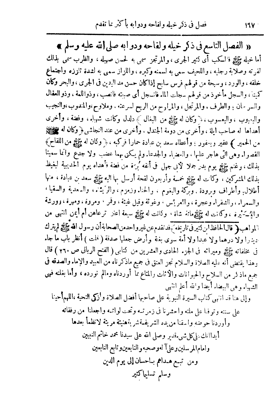 أما خيله صلى الله عليه وسلم فالسكب أى كثير الجرى، والمرتجز سمى به لحسن صهيله، والظرب سمى بذلك لقوته وصلابة رجليه، واللحيف سمى به لمسنه وكبره، واللزاز سمى به لشدة تلززه واجتماع خلقه، والورد، وسبحة من قولهم فرس سابح إذا كان حسن مد اليدين فى الجرى، والبحر وكان كميتا، والسجل مأخوذ من قولهم سجلت الماء فانسجل أى صببته فانصب، وذو اللمة، وذو العقال والسرحان؛ والطرف، والمرتجل، والمراوح من الريح لسرعته، وملاوح، والمندوب، والنجيب واليعبوب، واليعسوب، (وكان له صلى الله عليه وسلم من البغال) لدل وكانت شهباء، وفضة، وأخرى اهدادها له صاحب أيلة، وأخرى من دومة الجندل، وأخرى من عند النجاشى (وكان له صلى الله عليه وسلم من الحمير) عفير ويعفور؛ وأعطاه سعد بن عبادة حمارا فركبه، (وكان له صلى الله عليه وسلم من اللقاح) القصواء وهى التى هاجر عليها، والعضباء والجدعاء ولم يكن بهما عضب ولا جدع وانما سميتا بذلك، وغنم صلى الله عليه وسلم يوم بدلا جملا لأبى جهل فى أنفه برة من فضة فأهداه يوم الحديبية ليغيط بذلك المشركين، وكانت له صلى الله عليه وسلم خمسة وأربعون لقحة أرسل بها اليه صلى الله عليه وسلم سعد بن عبادة، منها اطلال، وأطراف وبرودة، وبركة والبغوم، والحناء وزمزم، والرياء، والمعدية والسقيا، والسمراء، والشقراء وعجرة، والعريِّس، وغوثة وقيل غيثة، وقمر، ومروة، ومهرة، وورشة واليسحيرة، وكانت له صلى الله عليه وسلم مائة شاة، وكانت له صلى الله عليه وسلم سبعة اعنز ترعاهن أم أيمن انتهى من المواهب (قال الحافظ ابن كثير فى تاريخه) قد تقدم عن غير واحد من الصحابة ان رسول الله صلى الله عليه وسلم لم يترك دينار ولا درهما ولا عبدا ولا امة سوى بغلة وأرض جعلها صدفة (قلت) انظر باب ما جاء فى مخلفاته صلى الله عليه وسلم وميراثه فى الجزء الحادى والعشرين من كتابى (الفتح الربانى ص 26) قال وهذا يقتضى انه عليه الصلاة والسلام نجز العتق فى جميع ما ذكرناه من العبيد والإماء والصدقة فى جميع ما ذكر من السلاح والحيوانات والأثاث والمتاع مما أوردناه وما لم نورده، وأما بغلته فهى الشهباء وهى البيضاء أيضا والله أعلم انتهى