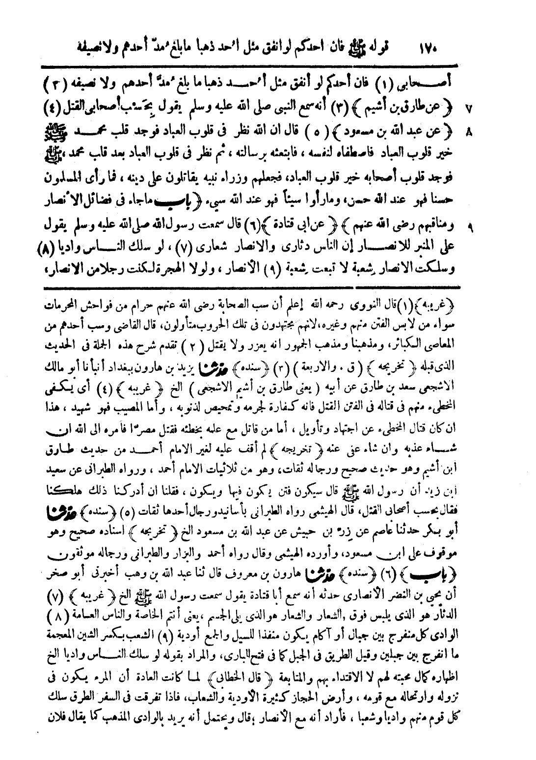 (غريبه) (1) قال النووى رحمه الله إعلم أن سب الصحابة رضى الله عنهم حرام من فواحش المحرمات سواء من لابس الفتن منهم وغيره، لانهم مجتهدون فى تلك الحروب متأولون، قال القاضى وسب أحدهم من المعاصى الكبائر، ومذهبنا ومذهب الجمهور انه يعزر ولا يقتل (2) تقدم شرح هذه الجملة فى الحديث الذى قبله (تخريحه) (ق. والاربعة) (3) (سنده) حدّثنا يزيد بن هارون ببغداد أنبأنا أبو مالك الاشجعى سعد بن طارق عن أبيه (يعنى طارق بن أشيم الاشجعى) الخ (غريبه) (4) اى يكفى المخطئ منهم فى قتاله فى الفتن القتل فانه كفاره لجرمه وتمحيص لذنوبه، وأما المصيب فهو شهيد، هذا ان كان المخطئ عن اجتهاد وتأويل، أما من قاتل مع علمه بخطئه فقتل مصرّا فامره الى الله ان شاء عذبه وان شاء عفى عنه (تخريجه) لم أقف عليه لغير الامام أحمد من حديث طارق ابن أشيم وهو حديث صحيح ورجاله ثقات، وهو من ثلاثيات الامام أحمد، ورواه الطبرانى عن سعيد ابن زيد أن رسول الله صلى الله عليه وسلم قال سيكون فتن يكون فيها ويكون، فقلنا ان أدركنا ذلك هلكنا فقال بحسب أصحابى القتل، قال الهيثمى رواه الطبرانى بأسانيد رجال أحدها ثقات (5) (سنده) حدّثنا أبو بكر حدثنا عاصم عن رزّ بن حبيش عن عبد الله بن مسعود الخ (تخريجه) اسناده صحيح وهو موقوف على ابن مسعود، وأورده الهيثمى وقال رواه أحمد والبزار والطبرانى ورجاله موثوقون (باب) (6) (سنده) حدّثنا هارون بن معروف قال ثنا عبد الله بن وهب أخبرنى أبو صخر أن يحيى بن النضر الأنصارى حدثه أنه سمع أبا قتادة يقول سمعت رسول الله صلى الله عليه وسلم الخ (غريبه) (7) الدثار هو الذى يلبس فوق الشعار والشعار هو الذى يلى الجسم، يعنى أنتم الخاصة والناس العامة (8) الوادى كل منفرج بين جبال او آكام يكون منفذا للسيل والجمع أودية (9) الشعب بكسر الشين المعجمة ما انفرج بين الجبلين وقيل الطريق فى الجبل كما فى فتح البارى، والمراد بقوله لو سلك الناس واديا الخ اظهاره كمال محبته لهم لا الاقتداء بهم والمتابعة (قال الخطابى) لما كانت العادة أن المرء يكون فى نزوله وارتحاله مع قومه، وأرض الحجاز كثيرة الأودية والشعاب، فاذا تفرقت فى السفر الطرق سلك كل قوم منهم واديا وشعبا، فأراد أنه مع الأنصار؛ قال ويحتمل أنه يريد بالوادى المذهب كما يقال فلان