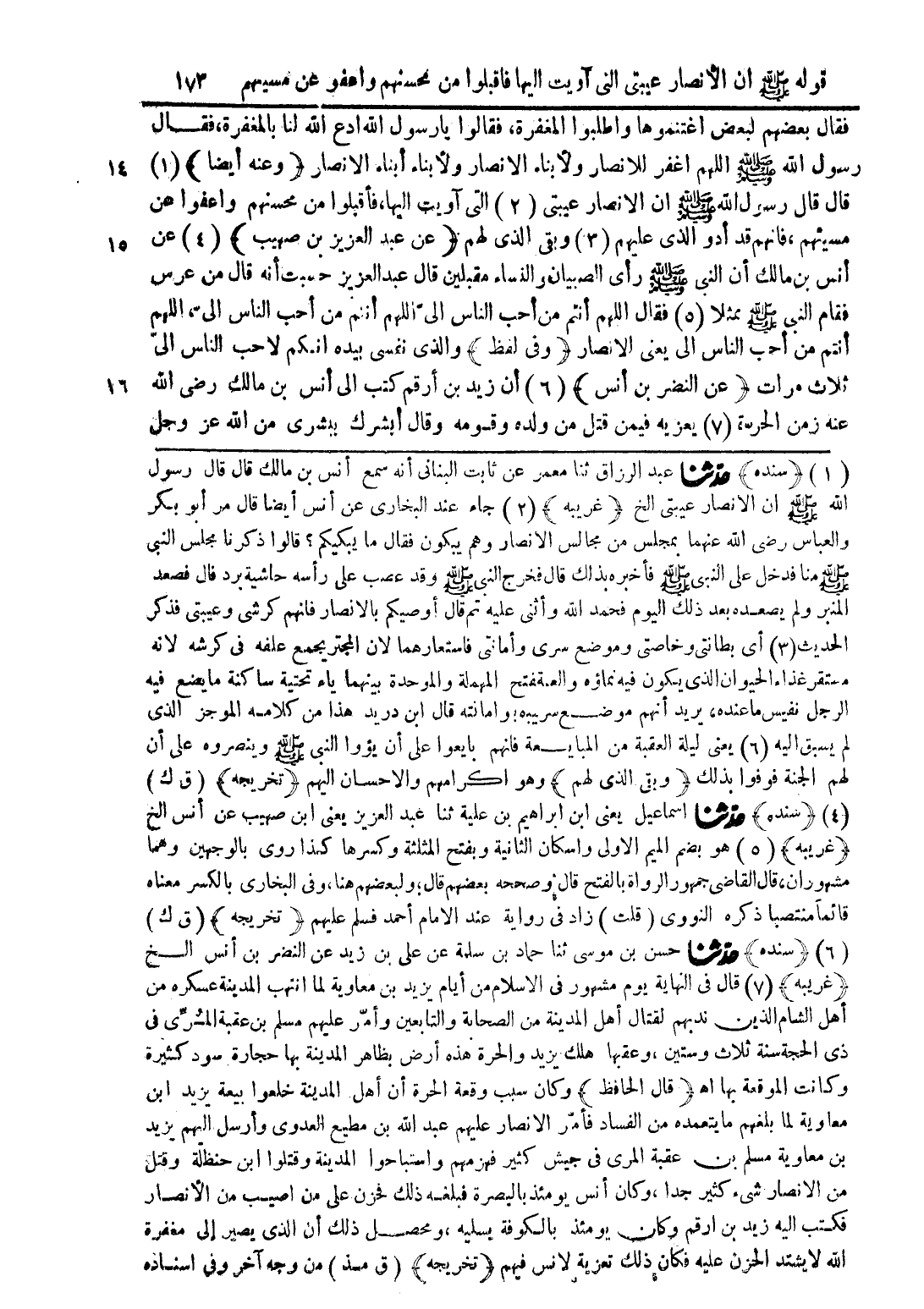 (1) (سنده) حدّثنا عبد الرازق ثنا معمر عن ثابت البنانى أنه سمع أنس بن مالك قال قال رسول الله صلى الله عليه وسلم أن الانصار عيبتى الخ (غريبه) (2) جاء عند البخارى عن أنس أيضا قال مر أبو بكر والعباس رضى الله عنهما بمجلس من مجالس الأنصار وهم يبكون فقال ما يبكيكم؟ قالوا ذكرنا مجلس النبى صلى الله عليه وسلم منا فدخل على النبى صلى الله عليه وسلم فأخبره بذلك قال فخرج النبى صلى الله عليه وسلم وقد عصب على رأسه حاشية برد قال فصعد المنبر ولم يصعده بعد ذلك اليوم فحمد الله وأثنى عليه قم ثال أوصيكم بالانصار فانهم كرشى وعيبتى فذكر الحديث (3) اى بطانتى وخاصتى وموضع سرى وأمانتى فاستعارهما لان المجتر يجمع علفه فى كرشه لانه مستقر غذاء الحيوان الذى يكون فيه نماؤه والعنة فتح المهلة والموحدة بينهما ياء تحتية ساكنة ما يضع فيه الرجل نفيس ما عنده، يريد أنهم موضع سري به وأمانته قال ابن دريد هذا من كلامه الموجز الذى لم يسبق إليه (6) يعنى ليلة العقبة من المبايعة فانهم بايعوا على ان يؤوا النبى صلى الله عليه وسلم وينصروه على أن لهم الجنة فوفوا بذلك (وبقى الذى لهم) وهو اكرامهم والاحسان إليهم (تخرجه) (ق ك) (غريبه) (5) هو بضم الميم الاولى واسكان الثانية وبفتح المثلثة وكسرها كذا روى بالوجهين وهما مشهوران، قال القاضى جمهور الرواة بالفتح قال وصححه بعضهم قال؛ ولبعضهم هنا، وفى البخارى بالكسر معناه قائماً منتصبا ذكره النووى (قلت) زاد فى رواية عند الامام أحمد فسلم عليهم (تخريجه) (ق ك) (6) (سمده) حدّثنا حسن بن موسى ثنا حماد بن سلمة عن على بن زيد عن النضر بن أنس الخ (غريبه) (7) قال فى النهاية يوم مشهور فى الاسلام من أيام يزيد بن معاوية بما انتهب المدينة عسكره من أهل الشام الذين ندبهم لقتال أهل المدينة من الصحابة والتابعين وأمّر عليهم مسلم بن عقبة المرِّى فى ذى الحجة سنة ثلاث وستين، وعقبها هلك يزيد والحرة هذا أرض بظاهر المدينة بها حجارة سود كثيرة وكانت الموقعة بها أهـ (قال الحافظ) وكان سبب وقعة الحرة أن أهل المدينة خلعوا بيعة يزيد ابن معاوية لما بلغهم ما يتتعمده من الفساد فأمّر الانصار عليهم عبد الله بن مطيع العدوى وأرسل إليهم يزيد بن معاوية مسلم بن عقبة المرى فى جيش كثير فهزمهم واستباحوا المدينة وقتلوا ابن حنظلة وقتل من الانصار شئ كثير جدا، وكان أنس يومئذ بالبصرة فبلغه ذلك فحون على من اصيب من الأنصار فكتب اليه زيد بن ارقم وكان يومئذ بالكوفة يليه، ومحصل ذلك أن الذى يصير إلى مغفرة الله لا يشتد الحزن عليه فكان ذلك تعزية لانس فيهم (تخريجه) (ق مذ) من وجه آخر وفي إسناده