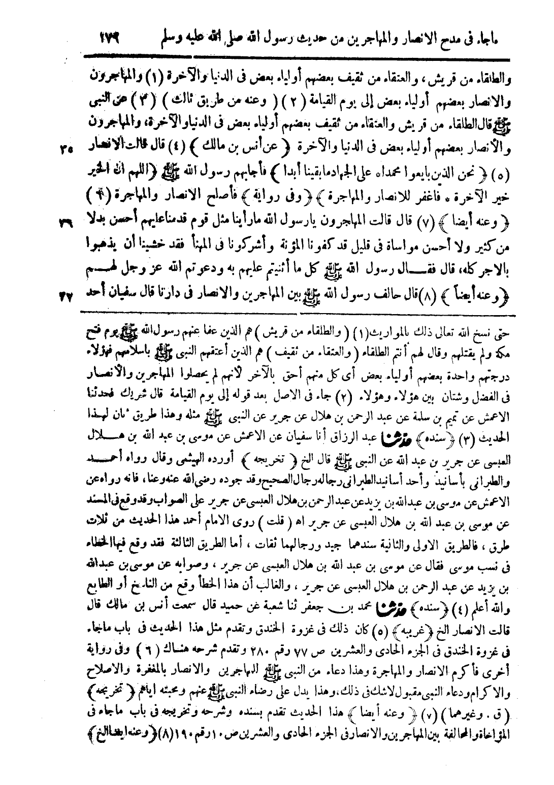 حتى نسخ الله تعالى ذلك بالمواريث (1) (والطلقاء من قريش) هم الذين عفا عنهم رسول الله صلى الله عليه وسلم يوم فتح مكة ولم يقتلهم وقال لهم أنتم الطلقاء (والعتقاء من ثقيف) هم الذين أعتقهم النبى صلى الله عليه وسلم باسلامهم فهؤلاء درجتهم واحدة بعضهم أولياء بعض أى كل منهم أحق بالآخر لم يحصلوا المهاجرين والأنصار فى الفضل وشتان بين هؤلاء وهؤلاء (2) جاء فى الاصل بعد قوله إلى يوم القيامة قال شريك فحدثنا الاعمش عن تميم بن سلمة عن عبد الرحمن بن هلال عن جرير عن النبى صلى الله عليه وسلم مثله وهذا طريق ثان لهذا الحديث (3) (سنده) حدّثنا عبد الرازق أنا سفيان عن الاعمش عن موسى بن عبد الله بن هلال العبسى عن جرير على الصواب وقد وقع فى المسند عن موسى بن عبد الله بن هلال العبسى عن جرير أهـ (قلت) روى الامام أحمد هذا الحديث من ثلاث كؤق، فالطريق الاولى والثانية سندهما جيد ورجالهما ثقات، اما الطريق الثالثة فقد وع فيها الخطاء فى نسب موسى فقال عن موسى بن عبد الله بن هلال العبسى عن جرير، وصوابه عن موسى بن عبد الله بن يزيد عن عبد الرحمن بن هلال العبسى عن جرير، والغالب أن هذا الخطأ وقع من الناسخ أو الطابع والله أعلم (4) (سنده) حدّثنا محمد بن جعفر ثنا شعبة عن حميد قال سمعت أنس بن مالك قال قالت الانصار الخ () غريبه* (5) كان ذلك فى غزوة الخندق وتقدم مثل هذا الحديث فى باب ما جاء فى غزوة الخندق فى الجزء الحادى والعشرين ص 77 رقم 280 وتقدم شرحه هناك (6) وفى رواية أخرى فأكرم الانصار والمهاجرة وهذا دعاء من النبى صلى الله عليه وسلم للمهاجرين والانصار بالمغفرة والاصلاح والاكرام ودعاء النبى مقبول لا شك فى ذلك، وهذا يدل على رضاء النبى صلى الله عليه وسلم عنهم ومحبته اياهم (تخريجه) (ق. وغيرهما) (7) (وعنه أيضا) هذا الحديث تقدم بسنده وشرحه وتخريجه فى باب ما جاء فى المؤاخاة والمحالفة بين المهاجرين والانصار فى الجزء الحادى والعشرين ص 10 رقم 190 (8) (وعنه أيضا الخ)