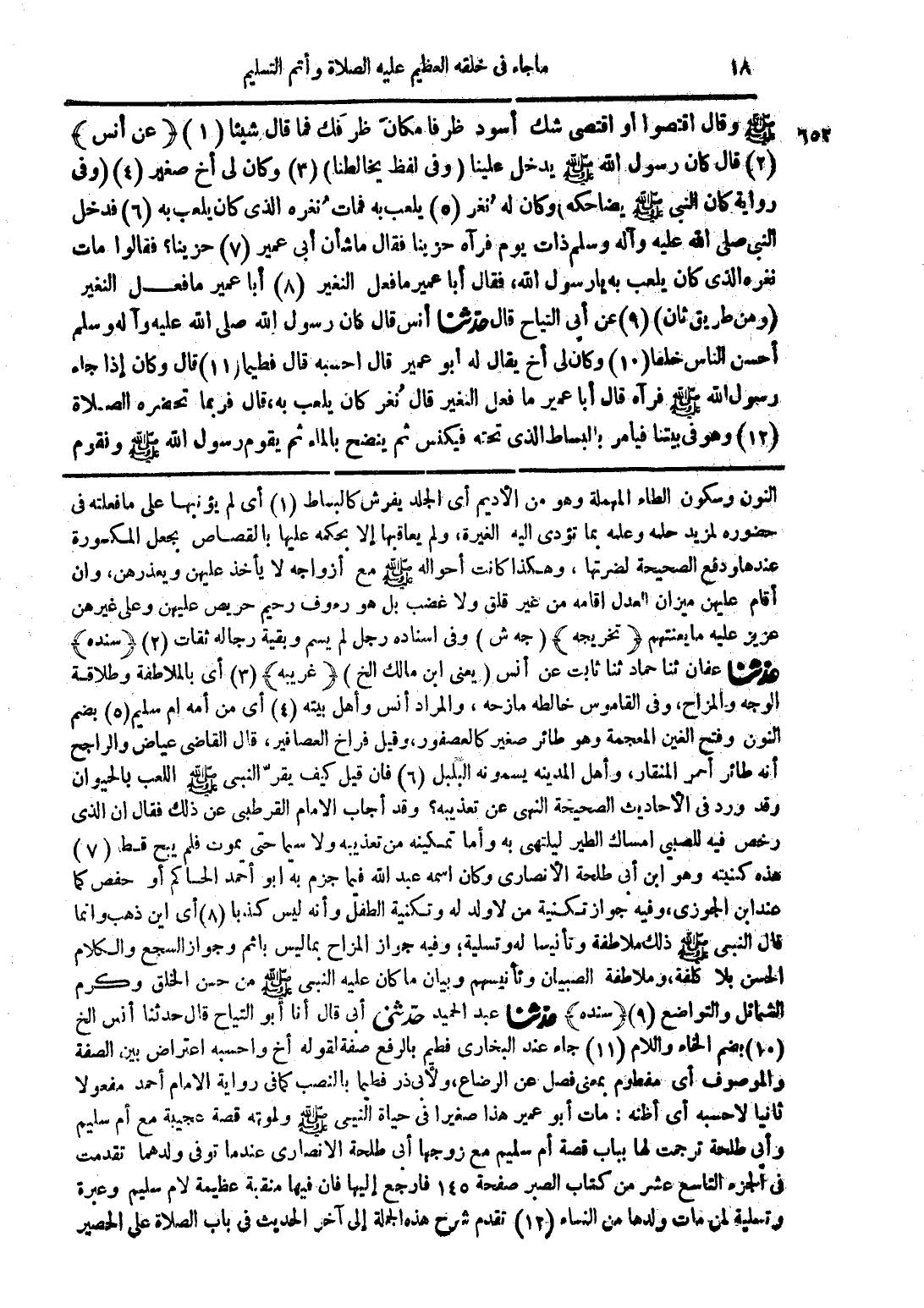 النون وسكون الطاء المهملة وهو من الأديم أي الجلد يفرش كالبساط (1) أي لم يؤنبها على ما فعلته في حضوره لمزيد حله وعلمه بما تؤدي إليه الغيرة، ولم يعاقبها إلا بحكمه عليها بالقصاص بجعل المكسورة عندها ودفع الصحيحة لضرتها، وهكذا كانت أحواله صلى الله عليه وسلم مع أزواجه لا يأخذ عليهن ويعذرهن، وأن أقام عليهن ميزان العدل إقامة من غير قلق ولا غضب بل هو رءوف رحيم حريص عليهن وعلى غيرهن عزيز عليه ما يعنتهم (تخريجه) (جه ش) وفي إسناده رجل لم يسم وبقية رجاله ثقات (2) (سنده) حدثنا عفان ثنا حماد ثنا ثابت عن أنس (يعني ابن مالك الخ) (غريبة) (3) أي بالملاطفة وطلاقة الوجه والمزاح، وفي القاموس خالطه مازحه، والمراد أنس وأهل بيته (4) أي من أمه أم سليم (5) بضم النون وفتح الغين المعجمة وهو طائر صغير كالعصفور، وقيل فراخ العصافير، قال القاضي عياض والراجح أنه طائر أحمر المنقار، وأهل المدينة يسمونه البلبل (6) فإن قيل كيف يقرّ النبي صلى الله عليه وسلم اللعب بالحيوان وقد ورد في الأحاديث الصحيحة النهي عن تعذيبه؟ وقد أجاب الإمام القرطبي عن ذلك فقال أن الذي رخص فيه للصبي امساك الطير ليلتهى به وأما تمكينه من تعذيبه ولا سيما حتى يموت فلم يبح قط (7) هذه كنيته وهو ابن أبي طلحة الأنصاري وكان اسمع عبد الله فيما حزم به أبو أحمد الحاكم أو حفص كما عند ابن الجوزي، وفيه جواز تكنية من لا ولد له وتكنية الطفل وأنه ليس كذبا (8) أي أين ذهب وإنما قال النبي صلى الله عليه وسلم ذلك ملاطفة وتأنيسا له وتسلية؛ وفيه جواز المزاح بما ليس باثم وجواز السجع والكلام الحسن بلا كلفة، وملاطفة لاصبيان وتأنيسهم وبيان ما كان عليه النبي صلى الله عليه وسلم من حسن الخلق وكرم الشمائل والتواضع (9) (سنده) حدثنا عبد الحميد حدثني أبي قال أنا أبو التياح قال حدثنا أنس الخ (10) بضم الخاء واللام (11) جاء عند البخاري فطم بالرفع صفة لقوله أخ واحسبه اعتراض بين الصفة والموصوف أي مفطوم بمعنى فصل عن الرضاع، ولأبي ذر فطما بالنصب كما في رواية الإمام أحمد مفعولا ثانيا لا حسبه أي أظنه: مات أبو عمير هذا صغيرا في حياة النبي صلى الله عليه وسلم ولموته قصة عجيبة مع أم سليم وأبي طلحة ترجمت لها بباب قصة أم سليم مع زوجها أبي طلحة الأنصاري عندما توفى ولدهما تقدمت في الجزء التاسع عشر من كتاب الصبر صفحة 145 فأرجع إليها فإن فيها منقبة عظيمة لام سليم وعبرة وتسلية لمن مات ولدها من النساء (12) تقدم شرح هذه الجملة إلى آخر الحديث في باب الصلاة على الحصير