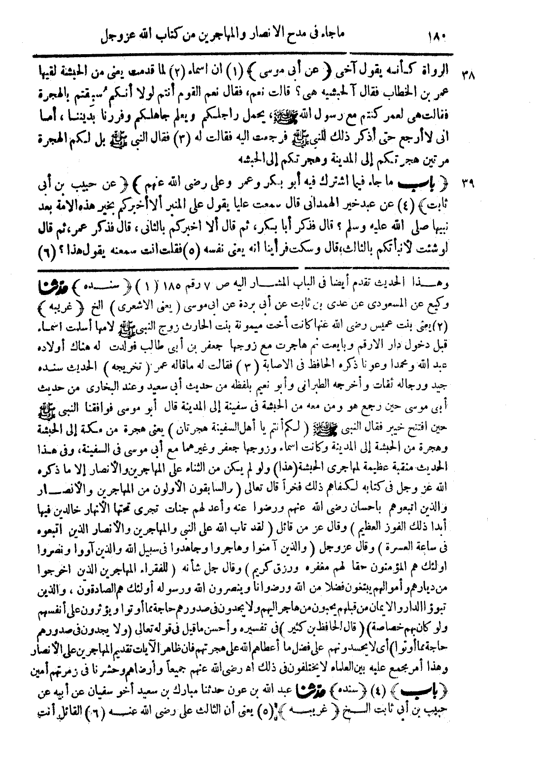 وهذا الحديث تقدم ايضا فى الباب المشار اليه ص 7 رقم 185 (1) (سنده) حدّثنا وكيع عن المسعودى عن عدى بن ثابت عن أبى بردة عن ابى موسى (يعنى الاشعرى) الخ (غريبه) (2) يعنى بنت عميس رضى الله عنها كانت أخت ميمونة بنت الحارث زوج النبى صلى الله عليه وسلم لامها أسلمت أسماء قبل دخول دار الأرقم وبايعت ثم هاجرت مع زوجها جعفر بن أبى طالب فولدت له هناك أولاده عبد الله ومحمدا وعونا ذكره الحافظ فى الاصابة (3) فقالت له ما قاله عمر (تخريجه) الحديث سنده جيد ورجاله ثقات وأخرجه الطبرانى وأبو نعيم بلفظه من حديث أبى سعيد وعند البخارى من حديث أبى موسى حين رجع هو ومن معه من الحبشة فى سفينة إلى المدينة قال أبو موسى فوافقنا النبى صلى الله عليه وسلم جين افتتح خيبر فقال النبى صلى الله عليه وسلم (لكم أنتم يا أهل السفينة هجرتان) يعنى هجرة من مكة إلى الحبشة وهجرة من الحبشة إلى المدينة وكانت اسماء وزوجها جعفر وغيرهما مع أبى موسى فى السفينة، وفى هذا الحديث منقبة عظيمة لمهاجرى الحبشة (هذا) ولو لم يكن من الثناء على المهاجرين والأنصار إلا ما ذكره الله عز وجل فى كتابه لكفاهم ذلك فخراً قال تعالى (والسابقون الأولون من المهاجرين والأنصار والذين اتبعوهم باحسان رضى الله عنهم ورضوا عنه وأعد لهم جنات تجرى تحتها النهار خالدين فيها أبدا ذلك الفوز العظيم) وقال عز وجل (والذين آمنوا وهاجروا وجاهدوا فى سبيل الله والذين آووا ونصروا فى ساعة العسرة) وقال عز وجل (والذين آمنوا وهاجروا وجاهدوا فى سبيل الله والذين آووا ونصروا اولئك هم المؤمنون حقا لهم مغفره ورزق كريم) وقال جل شانه (للفقراء المهاجرين الذين اخرجوا من ديارهم واموالهم يبتغون فضلا من الله ورضوانا وينصرون الله ورسوله أولئك هم الصادقون، والذين تبؤوا الدار والايمان من قبلهم يحبون من هاجر اليهم ولا يجدون فى صدورهم حاجة مما أوتوا ويؤثرون على أنفسهم ولو كان بهم خصاصة) (قال الحافظ بن كثير) فى تفسيره وأحسن ما قيل فى قوله تعالى (ولا يجدون فى صدورهم حاجة مما أوتوا) اى لا يحسدونهم على فضل ما أعطاهم الله على هجرتهم فان ظاهر الآيات تقديم المهاجرين على الانصار وهذا أمر مجمع عليه بين العلماء لا يختلفون فى ذلك أهـ رضى الله عنهم جميعاً وأرضاهم وحشرنا فى زمرتهم أمين (باب) (4) (سنده) حدّثنا عبد الله بن عون حدثنا مبارك بن سعيد أخو سفيان عن أبيه عن حبيب بن أبى ثابت الخ (غريبه) (5) يعنى أن الثالث على رضى الله عنه (6) القائل أنت