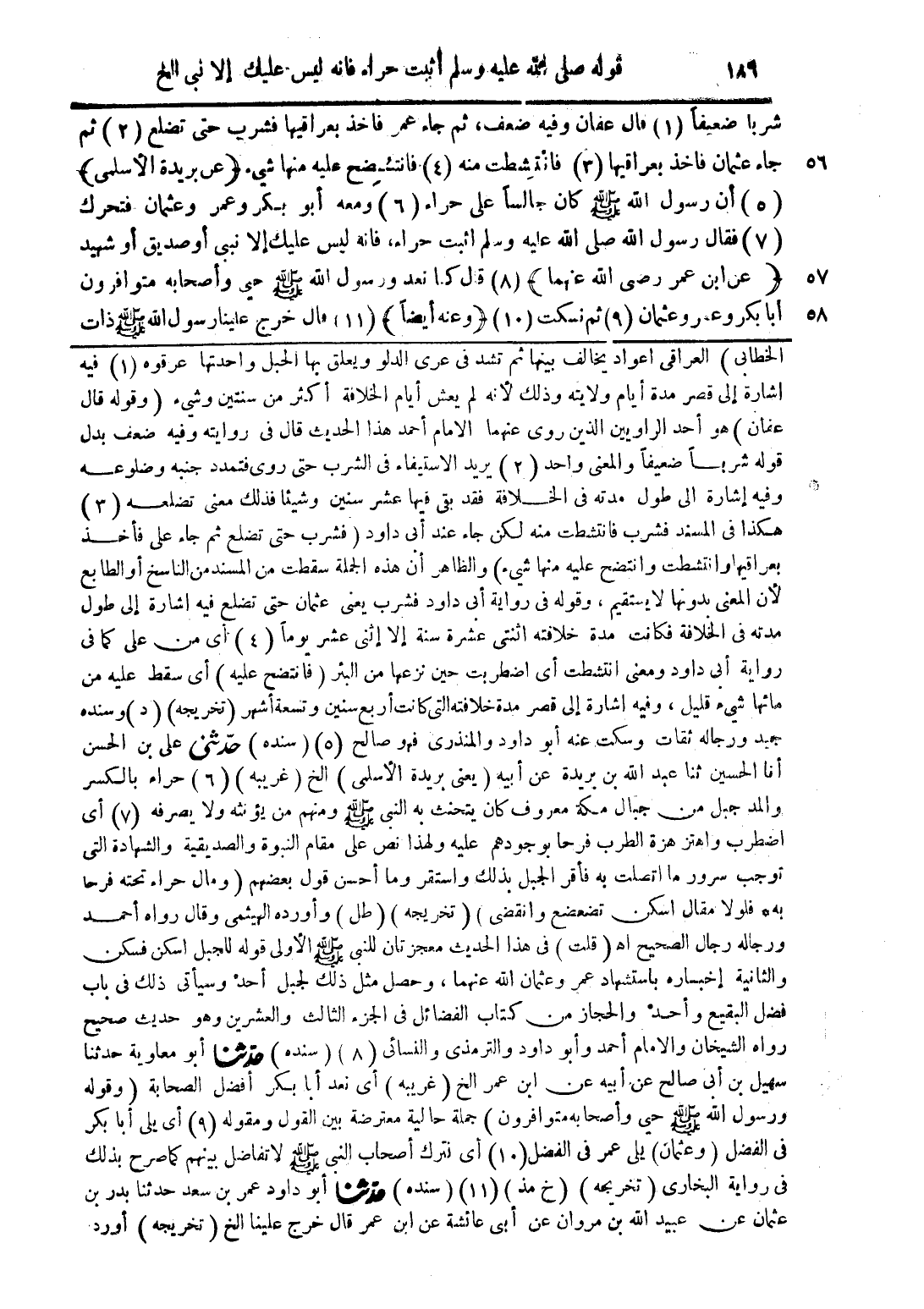 الخطابي) العراقي اعواد يخالف بينها ثم تشد فى عرى الدلو ويعلق بها الحبل واحدتها عرفوا (1) أشارة إلى قصر مدة أيام ولايته وذلك لأنه لم يعش أيام الخلافة أكثر من سنتين وشيء (وقوله عقان) هو أحد الراويين الذين روى عنهما الامام أحمد هذا الحديث قال فى روايته وفيه ضعف بدل قوله شربا ضعيفاً والمعنى واحد (2) يريد الاستيفاء فى الشرب حتى روى فتمدد جنبه وضلوعه وفيه إشارة الى طول مدته فى الخلافة فقد بقى فيها عشر سنين وشيئا فذلك معنى تضلعه (3) هكذا فى المسند فشرب فانتشطت منه لكن جاء عند أبى داود (فشرب حتى تضلع ثم جاء على فأخذ بعراقيها وانتشطت وانتضح عليه منها شيء) والظاهر أن هذه الجملة سقطت من المسند من الناسخ او الطابع لأن المعنى بدونها لا يستقيهم، وقوله فى رواية أبى داود فشرب يعنى عثمان حتى تضلع فيه اشارة إلى طول مدته فى الخلافة فكانت مدة خلافته اثنتى عشرة سنة إلا إثنى عشر يوماً (4) أى من على كما فى رواية أبى داود ومعنى انتشطت أى اضطربت حين نزعها من البئر (فانتضح عليه) اى سقط عليه من مائها شيء قليل، وفيه اشارة إلى قصر مدة خلافته التى كانت أربع سنين وتسعة أشهر (تخريجه) (د) وسنده جيد ورحاله ثقات وسكت عنه أبو داود والمنذرى فهو صالح (5) (سنده) حدّثنى على بن الحسن أنا الحسين ثنا عبد الله بن بريدة عن أبيه (يعنى بريدة الأسلمى) ألخ (غريبه) (6) حراء بالكسر والمد جبل من جبال مكة معروف كان يتخنث به النبى صلى الله عليه وسلم ومنهم من يؤنثه ولا يصرفه (7) أى اضطرب واهتز هزة الطرب فرحا بوجودهم عليه ولهذا نص على مقام النبوة والصديقية والشهادة التى توجب سرور ما اتصلت به فأقر الجبل بذلك واستقر وما أحسن قول بعضهم (ومال حراء تحته فرحا به فلولا مقال اسكن تضعضع وانقضى) (تخريجه) (طل) وأورده الهيثمى وقال رواه أحمد ورجاله رجال الصحيح أهـ (قلت) فى هذا الحديث معجزتان للنبى صلى الله عليه وسلم الأولى قوله للجبل اسكن فسكن والثانية إخباره باستشهاد عمر وعثمان رضى الله عنهما، وحصل مثل ذلك لجبل أحد وسيأتى ذلك فى باب فضل البقيع واحد والحجاز من كتاب الفضائل فى الجزء الثالث والعشرين وهو حديث صحيح رواه الشيخان والامام أحمد وأبو داود والترمذى والنسائى (8) (سنده) حدّثنا أبو معاوية حدثنا سهيل بن أبى صالح عن أبيه عن ابن عمر الخ (غريبه) اى نعد أبا بكر أفضل الصحابة (وقوله ورسول الله صلى الله عليه وسلم حيى وأصحابه متوافرون) جملة حالية معترضة بين القول ومقوله (9) أى يلى أبا بكر فى الفضل (وعثمان) يلى عمر فى الفضل (10) أى نترك أصحاب النبى صلى الله عليه وسلم لا تفاضل بينهم كما صرح بذلك فى رواية البخارى (تخريجه) (خ مذ) (11) (سنده) حدّثنا أبو داود عمر بن سعد حدثنا بدر بن عثمان عن عبيد الله بن مروان عن أبى عائشة عن ابن عمر قال خرج علينا الخ (تخريجه) أورد