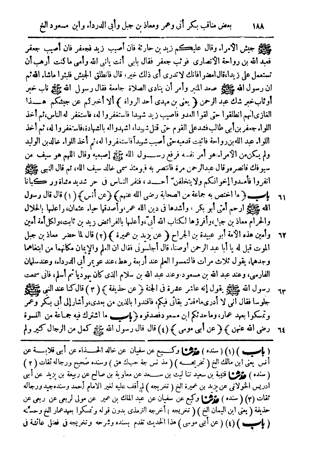 صلى الله عليه وسلم جيش الأمراء وقال عليكم زيد بن حارثة فان أصيب زيد فجعفر فان أصيب جعفر فعبد الله بن رواحة الأنصارى فوثب جعفر فقال بابى أنت يا نبى الله وامى ما كنت أرهب أن تستعمل على زيدا، قال امضوا فانك لا تدرى أى ذلك خير، قال فانطلق الجيش فلبثوا ما شاء الله ثم ان رسول الله صلى الله عليه وسلم صعد المنبر وأمر أن ينادى الصلاة جامعة فقال رسول الله صلى الله عليه وسلم ناب خبر أوثاب خبر شك عبد الرحمن (يعنى بن مهدى احد الرواة) ألا أخبركم عن جيشكم هذا الغازى انهم انطلقوا حتى لقوا العدو فاصيب زيد شهيدا فاستغفروا به، فاستغفر له الناس، ثم أخذ اللواء جعفر بن أبى طالب فشد على القوم حتى قتل شهيدًا، اشهدوا له بالشهادة، فاستغفروا له، ثم أخذ اللواء عبد الله بن رواحة فاثبت قدميه حتى أصيب شهيدًا فاستغفروا له، ثم أخذ اللواء خالد بن الوليد ولم يكن من الأمراء، هو أمر نفسه فرفع رسول الله صلى الله عليه وسلم إصبعيه وقال اللهم هو سيف من سيوفك فانصره وقال عبد الرحمن مرة فانتصر به فيومئذ سمى خالد سيف الله، ثم قال النبى صلى الله عليه وسلم انفروا فأمدوا إخوانكم ولا يتخلفنّ أحد، فنفر الناس فى حر شديد مشاة وركبانا باب (ما اختص به جماعة من الصحابة رضى الله عنهم) (عن أنس) (1) قال قال رسول الله صلى الله عليه وسلم ارحم أمتى أبو بكر، وأشدها فى دين الله عمر، وأصدقها حياء عثمان، واعلمها بالحلال والحرام معاذ بن جبل، وأقرؤها لكتاب الله أبىّ، وأعلمها بالفرائض زيد بن ثابت، ولكل أمة أمين وأمين هذه الأمة أبو عبيدة بن الجراح (عن يزيد بن عميرة) (2) قال لما حضر معاذ بن جبل الموت قيل له يا أبا عبد الرحمن أوصنا، قال أجلسونى فقال ان العلم والإيمان مكانهما من ابتغاهما وجدهما، يقول ثلاث مرات فالتمسوا العلم عند أربعة رهط، عند عويمر أبى الدرداء، وعند سلمان الفارسى، وعند عبد الله بن مسعود وعند عبد الله بن سلام الذى كان يهوديا ثم أسلم، فانى سمعت رسول الله صلى الله عليه وسلم يقول إنه عاشر عشرة فى الجنة (عن حذيفة) (3) قال كنا عند النبى صلى الله عليه وسلم جلوسا فقال انى لا أدرى ما قدّر بقائى فيكم، فاقتدوا بالذين من بعدى، وأشار إلى أبى بكر وعمر وتمسكوا بعهد عمار، وما حدثكم ابن مسعود فصدقوه (باب ما اشترك فيه جماعة من النسوة رضى الله عنهن) (عن أبى موسى) (4) قال قال رسول الله صلى الله عليه وسلم كمل من الرجال كثير ولم