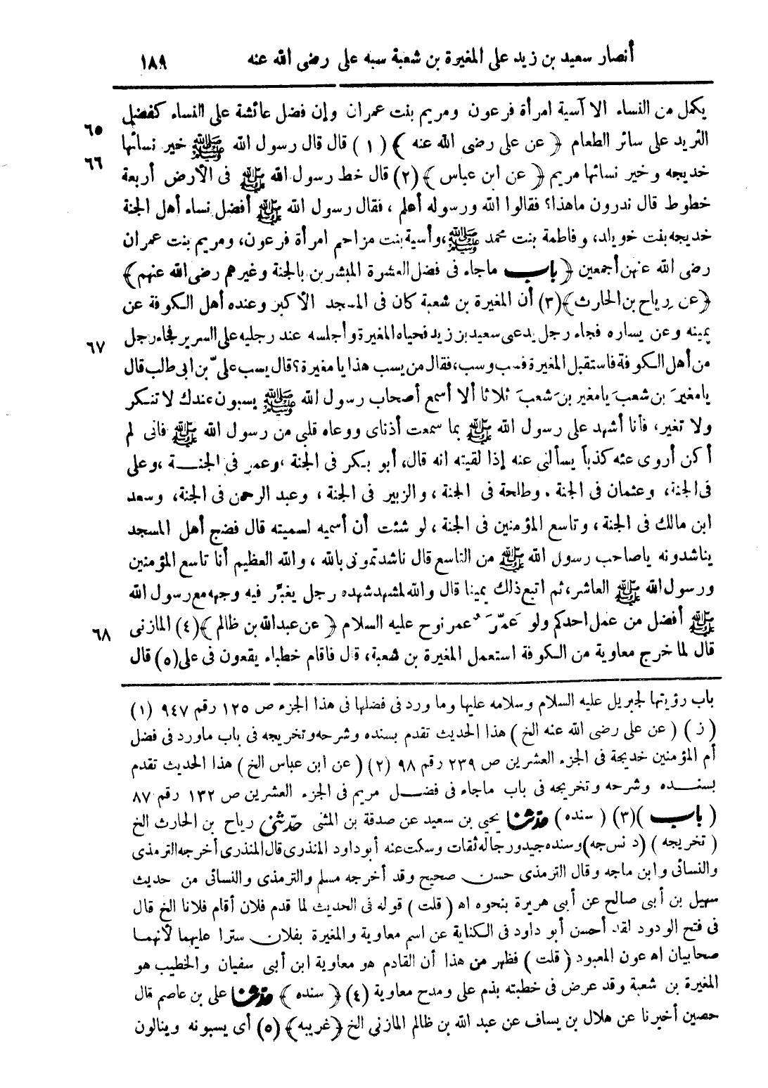 يكمل من النساء الا آسية امرأة فرعون ومريم بنت عمران وإن فضل عائشة على النساء كفضل الثريد على سائر الطعام (عن على رضى الله عنه) (1) قال قال رسول الله صلى الله عليه وسلم خير نسائها خديجة وخير نسائها مريم (عن ابن عباس) (2) قال خط رسول الله صلى الله عليه وسلم فى الأرض أربعة خطوط قال تدرون ما هذا؟ فقالوا الله ورسوله أعلم، فقال رسول الله صلى الله عليه وسلم أفضل نساء أهل الجنة خديجة بنت خويلد، وفاطمة بنت محمد صلى الله عليه وسلم، وأسية بنت مزاحم امرأة فرعون، ومريم بنت عمران رضى الله عنهم أجمعين (باب ما جاء فى فضل العشرة المبشرين بالجنة وغيرهم رضى الله عنهم) (عن رباح بن الحارث) (3) أن المغيرة بن شعبة كان فى المسجد الأكبر وعنده أهل الكوفة عن يمينه وعن يساره فجاء رجل يدعى سعيد بن زيد فحياه المغيرة وأجلسه عند رجليه على السرير فجاء رجل من أهل الكوفة فاستقبل المغيرة فسب وسب، فقال من يسب هذا يا مغيرة؟ قال يسب علىّ بن أبى طالب قال يا مغير بن شعيب يا مغير بن شعب ثلاثا ألا أسمع أصحاب رسول الله صلى الله عليه وسلم يسبون عندك لا تنكر ولا تغير، فأنا أشهد على رسول الله صلى الله عليه وسلم بما سمعت أذناى ووعاه قلبى من رسول الله صلى الله عليه وسلم فانى لم أكن أروى عنه كذبًا يسألنى عنه إذا لقيته انه قال، أبو بكر فى الجنة، وعمر فى الجنة، وعلى فى الجنة، وعثمان فى الجنة، وطلحة فى الجنة، والزبير فى الجنة، وعبد الرحمن فى الجنة، وسعد ابن مالك فى الجنة، وتاسع المؤمنين فى الجنة، لو شئت أن أسميه لسميته قال فضج أهل المسجد يناشدونه يا صاحب رسول الله صلى الله عليه وسلم من التاسع قال ناشدتمونى بالله العظيم أنا تاسع المؤمنين ورسول الله صلى الله عليه وسلم العاشر، ثم اتبع ذلك يمينا قال والله لمشهد شهده رجل يغبِّر فيه وجهه مع رسول الله صلى الله عليه وسلم أفضل من عمل احدكم ولو عمّر عمر نوح عليه السلام (عن عبد الله بن ظالم) (4) المازنى قال لما خرج معاوية من الكوفة استعمل المغيرة بن شعبة، قال فاقام خطباء يقعون في علي (5) قال