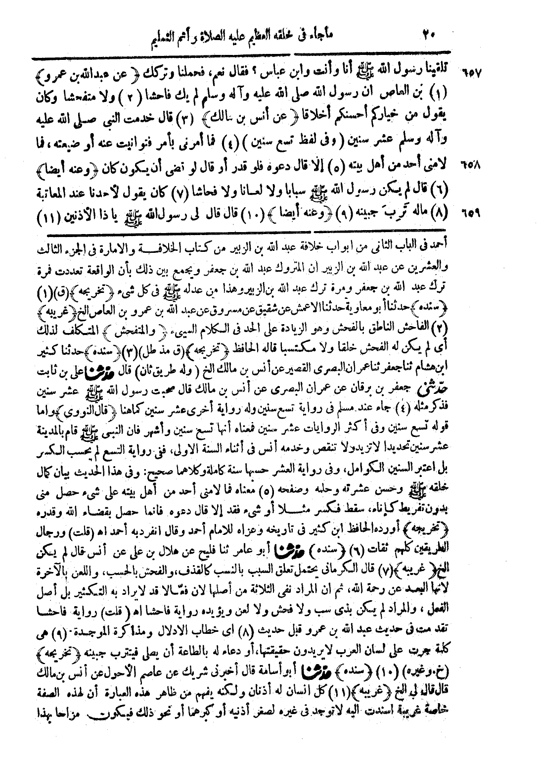 تلقينا رسول الله صلى الله عليه وسلم أنا وأنت وابن عباس؟ فقال نعم، فحملنا وتركك (عن عبد الله بن عمرو) بن العاص أن رسول الله صلى الله عليه وآله وسلم لم يك فاحشا ولا متفحشا وكان يقول من خياركم أحسنكم أخلاقا (عن أنس بن مالك) قال خدمت النبي صلى الله عليه وآله وسلم عشر سنين (وفي لفظ تسع سنين) فما أمرني بأمر فتوانيت عنه أو ضيعته، فما لامني أحد من أهل بيته إلا قال دعوه فلو قدر أو قال لو تضى أن يكون كان (وعنه أيضا) قال لم يكن رسول الله صلى الله عليه وسلم سبابا ولا لعانا ولا فحاشا كان يقول لأحدنا عند المعاتبة ماله ترب جبينه (وعنه أيضا) قال قال لي رسول الله صلى الله عليه وسلم يا ذا الأذنين