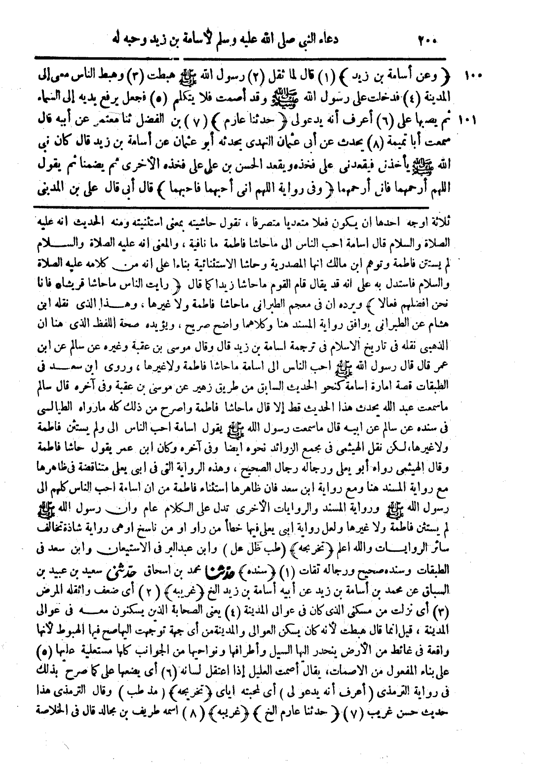(وعن أسامة بن زيد) (1) قال لما ثقل (2) رسول الله صلى الله عليه وسلم هبطت (3) وهبط الناس معى إلى المدينة (4) فدخلت على رسول الله صلى الله عليه وسلم وقد أصمت فلا يتكلم (5) فجعل يرقع يديه إلى السماء ثم يصبها على (6) أعرف أنه يدعولى (حدثنا عارم) (7) بن الفضل ثنا معتمر عن أبيه قال سمعت أبا تميمة (8) يحدث عن أبى عثمان النهدى يحدثه أبو عثمان عن أسامة بن زيد قال كان نبى الله صلى الله عليه وسلم يأخذنى فيقعدنى على فخذه ويقعد الحسن بن على على فخذه الأخرى ثم يضمنا ثم يقول اللهم أرحمهما فانى أرحمهما (وفى رواية اللهم انى أحبهما فاحبهما) قال أبى قال علي بن المديني