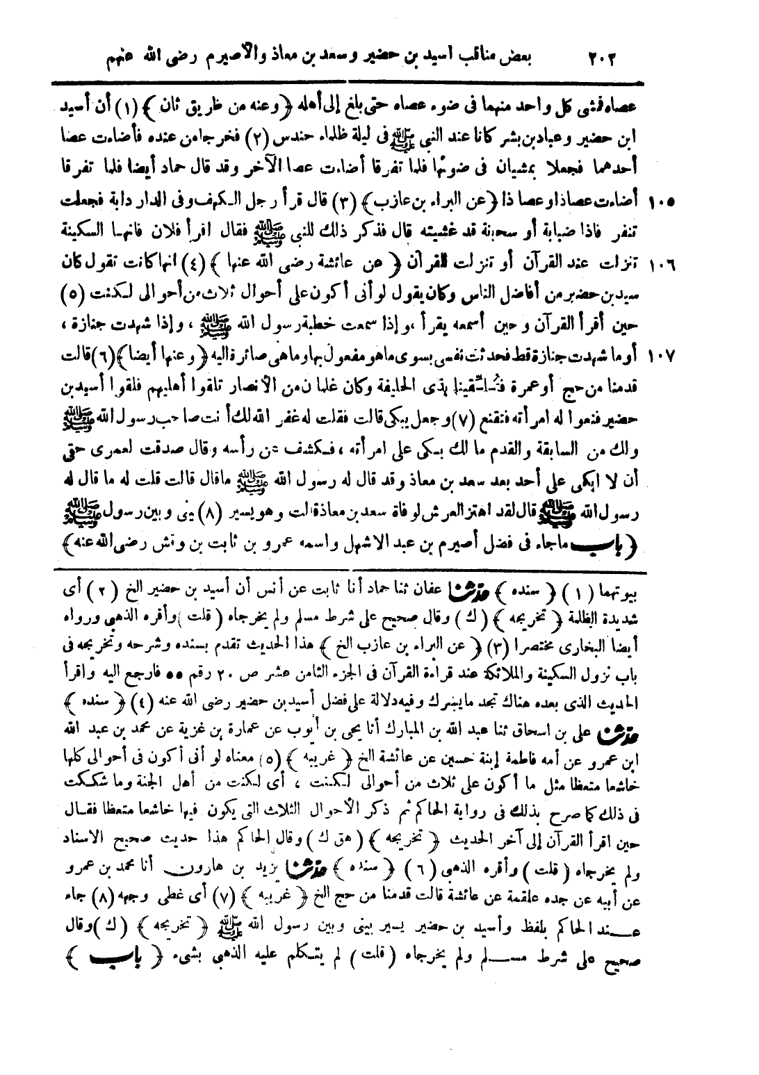 عصاه فمشى كل واحد منهما فى ضوء عصاه حتى بلغ إلى أهله (وعنه من طريق ثان) (1) أن أسيد ابن حضير وعباد بن بشر كانا عند النبى صلى الله عليه وسلم فى ليلة ظلماء حندس (2) فخرجا من عنده فأضاءت عصا أحدهما فجعلا يمشيان فى ضوئها فلما تفرقا أضاءت عصا الآخر وقد قال حماد أيضا فلما تفرقا أضاءت عصا ذا وعصا ذا (عن البراء بن عازب) (3) قال قرأ رجل الكهف وفى الدار دابة فجعلت تنفر فاذا ضبابة أو سحبنة قد غشيته قال فذكر ذلك للنبى صلى الله عليه وسلم فقال اقرأ فلان فانها السكينة تنزلت عند القرآن او تنزلت للقرآن (عن عائشة رضى الله عنها) (4) انها كانت تقول كان سيد بن حضير من أفاضل الناس وكان يقول لو أنى أكون على أحوال ثلاث من أحوالى لكنت (5) حين أقرأ القرآن وحين أسمعه يقرأ، وإذا سمعت خطبة رسول الله صلى الله عليه وسلم، وإذا شهدت جنازة، او ما شهدت جنازة قط فحدثت نفسى بسوى ما هو مفعول بها وما هى صائرة اليه (وعنها أيضا) (6) قالت قدمنا من حج أو عمرة فتلقينا بذى الحليفة وكان غلمان من الأنصار تلقوا أهليهم فلقوا أسيد بن حضير فنعوا له امرأته فنقنع (7) وجعل يبكى قالت فقلت له غفر الله لك أنت صاحب رسول الله صلى الله عليه وسلم ولك من السابقة والقدم ما لك بكى على امراته، فكشف عن رأسه وقال صدقت لعمرى حقى أن لا ابكى على أحد بعد سعد بن معاذ وقد قال له رسول الله صلى الله عليه وسلم ما قال قالت قلت له ما قال له رسول الله صلى الله عليه وسلم قال لقد اهتز العرش لوفاة سعد بن معاذ قلت وهو يسير (8) بينى وبين رسول الله صلى الله عليه وسلم (باب ما جاء فى فضل أصيرم بن عبد الاشهل واسمه عمرو بن ثابت بن ونش رضي الله عنه)