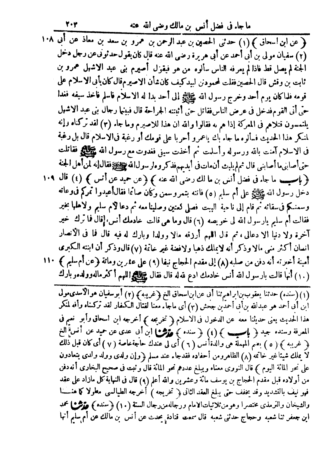 (1) (سنده) حدثنا يعقوب بن ابراهيم ثنا أبى عن ابن اسحاق الخ (غريبه) (2) أبو سفيان هو الأسدى مولى ابن أبى احمد هو عبد الله بن أبى أحمد بن جحش (3) اى ما جاء معنا لقتال الكفار لقد تركناه وأنه لمنكر هذا الحديث يعنى حديثنا معه عن الدخول فى الاسلام (تخريجه) أخرجه ابن اسحاق وأبو نعيم فى المعرفة وسنده جيد (باب) (4) (سنده) حدّثنا ابن أبى عدى عن حميد عن انس الخ (غريبه) (5) بضم المهملة هى والدة أنس (6) اى لى عندك حاجة خاصة (7) أى كان قبل ذلك لا يملك شيئا غير خاتمه (8) الظاهر ومن أحفاده فقد جاء عند مسلم (وإن ولدى وولد ولدى يتعادون على نحو المائة اليوم) قال النووى معناه ويبلغ عددهم نحو المائة قال وثبت فى صحيح البخارى أنه دفن من أولاده قبل مقدم الحجاج بن يوسف مائة وعشرين والله أعلم (9) قال فى النهاية كل ما زاد على عقد فهو نيف بالتشديد وقد يخفف حتى يبلغ العقد الثانى (تخريجه) أخرجه الطيالسى مطولا كما هنا والشيخان والترمذى مختصرا وهو من ثلاثيات الامام ورجاله من رجال الستة (10) (سنده) حدّثنا محمد ابن جعفر ثنا شعبه وحجاج حدثن شعبه قال سمعت قتادة يحدث عن أنس بن مالك عن أم سليم أنها