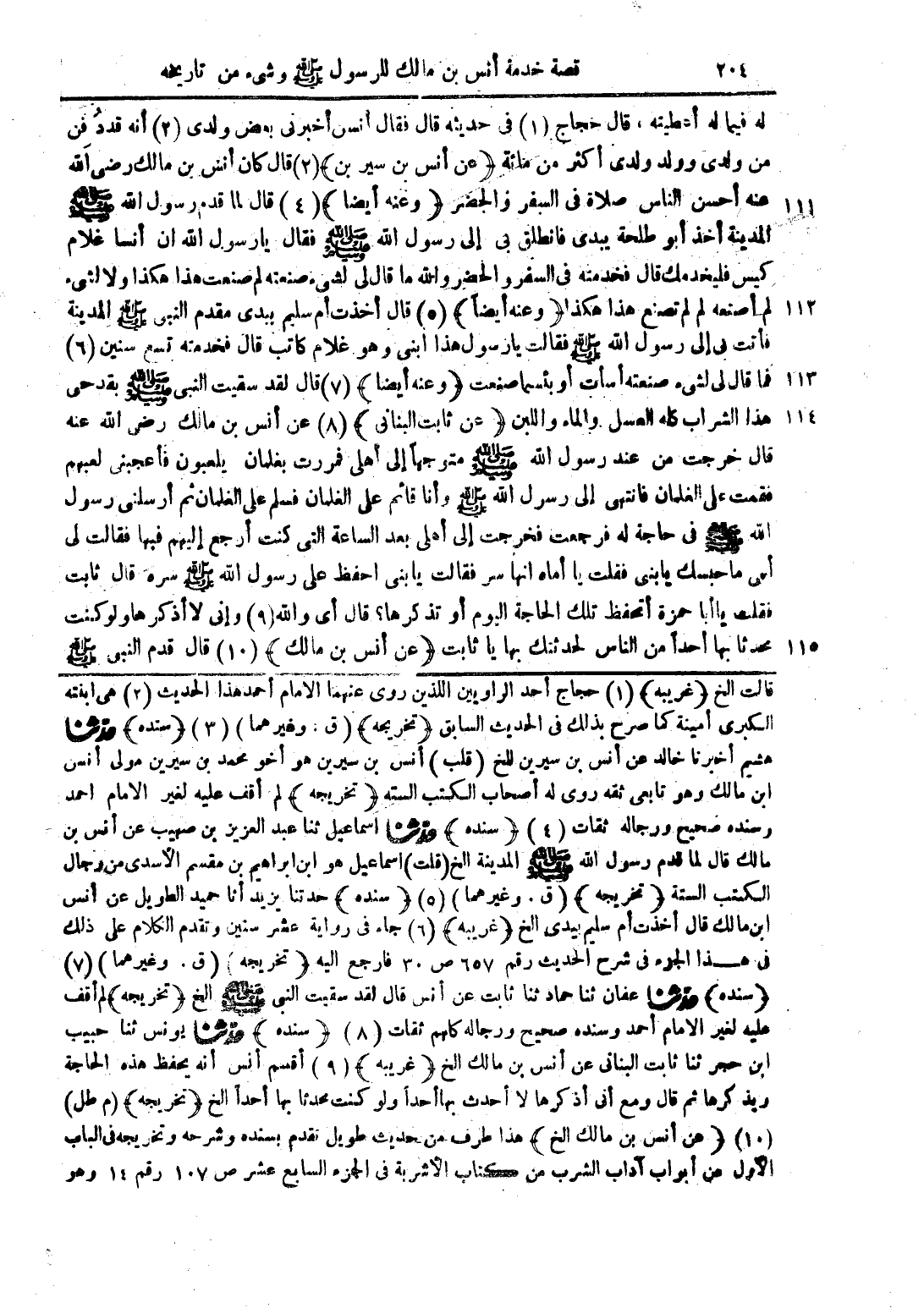 قالت الخ (غريبه) (1) حجاج أحد الراويين اللذين روى عنهما الامام أحمد هذا الحديث (2) هى ابنته الكبرى امينة كما صرح بذلك فى الحدي السابق تخريحه) (ق. وغيرهما) (3) (سنده) حدّثنا هشيم أخبرنا خالد عن أنس بن سيرين الخ (قلب) انس بن سيرين هو أخو محمد بن سيرين مولى أنس ابن مالك وهو تابعى ثقة روى له أصحاب الكتب السته (تخريجه) لم أقف عليه لغير الامام احمد وسنده صحيح ورجاله ثقات (4) (سنده) حدّثنا اسماعيل ثنا عبد العزيز بن صهيب عن أنس بن مالك قال لما قدم رسول الله صلى الله عليه وسلم المدينة الخ (قلت) اسماعيل هو ابن ابراهيم بن مقسم الأسدى من رجال الكتب الستة (تخريجه) (ق. وغيرها) (5) (سنده) حدثنا يزيد انا حميد الطويل عن أنس ابن مالك قال أخذت أم سليم بيدى الخ (غريبه) (6) جاء فى رواية عشر سنين وتقدم الكلام على ذلك فى هذا الجزء فى شرح الحديث رقم 657 ص 30 فارجع اليه (تخريجه) (ق. وغيرهما) (7) (سنده) حدّثنا عفان ثنا حماد ثنا ثابت عن انس قال لقد سقيت النبى صلى الله عليه وسلم الخ (تخريجه) لم أقف عليه لغير الامام أحمد وسنده صحيح ورجاله كلهم ثقات (8) (سنده) حدّثنا يونس ثنا حبيب ابن حجر ثنا ثابت البنانى عن انس بن مالك الخ (غريبه) (9) أقسم أنس أنه يحفظ هذه الحاجة ويذكرها ثم قال ومع أنى أذكرها لا أحدث بها أحداً ولو كنت محدثا بها أحداً الخ (تخريجه) (م طل) (10) (عن أنس بن مالك الخ) هذا طرف من حديث طويل تقدم بسنده وشرحه وتخريجه فى الباب الأول من أبواب آداب الشرب من كتاب الأشربة فى الجزء السابع عشر ص 107 رقم 14 وهو